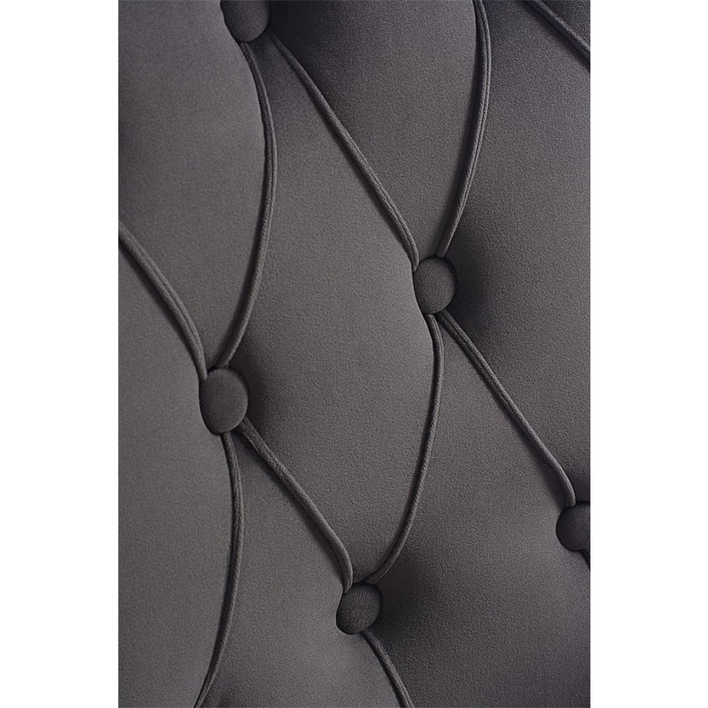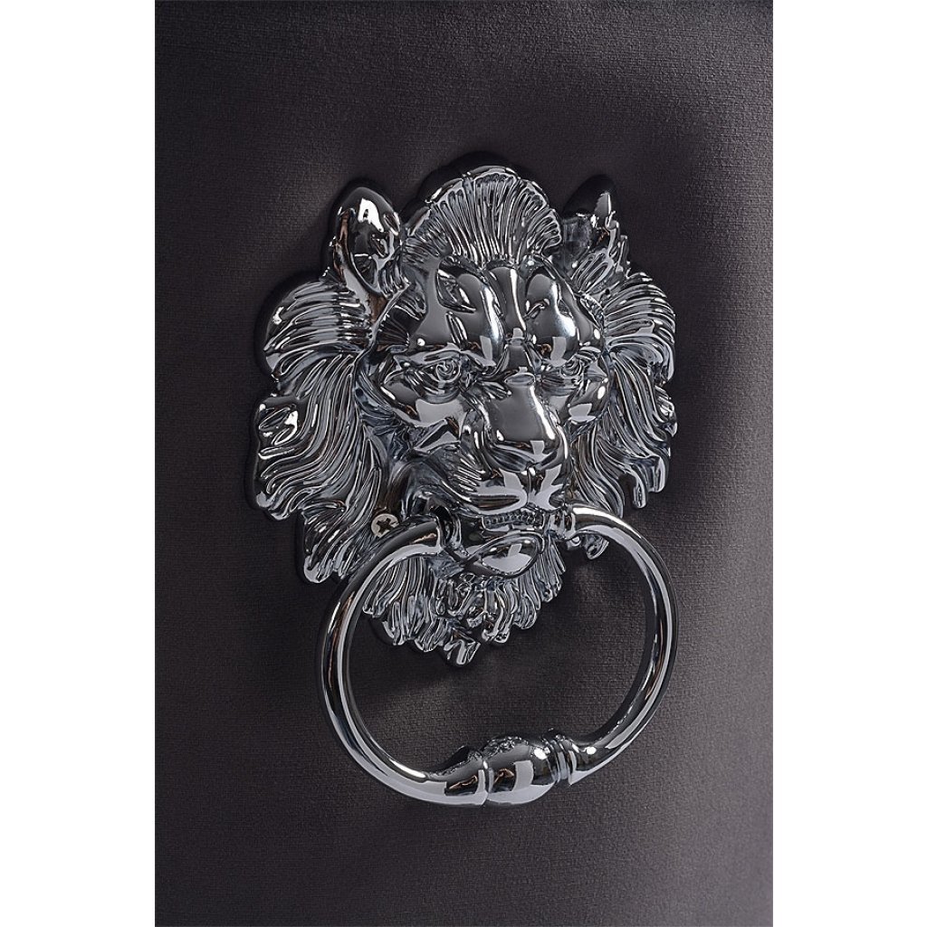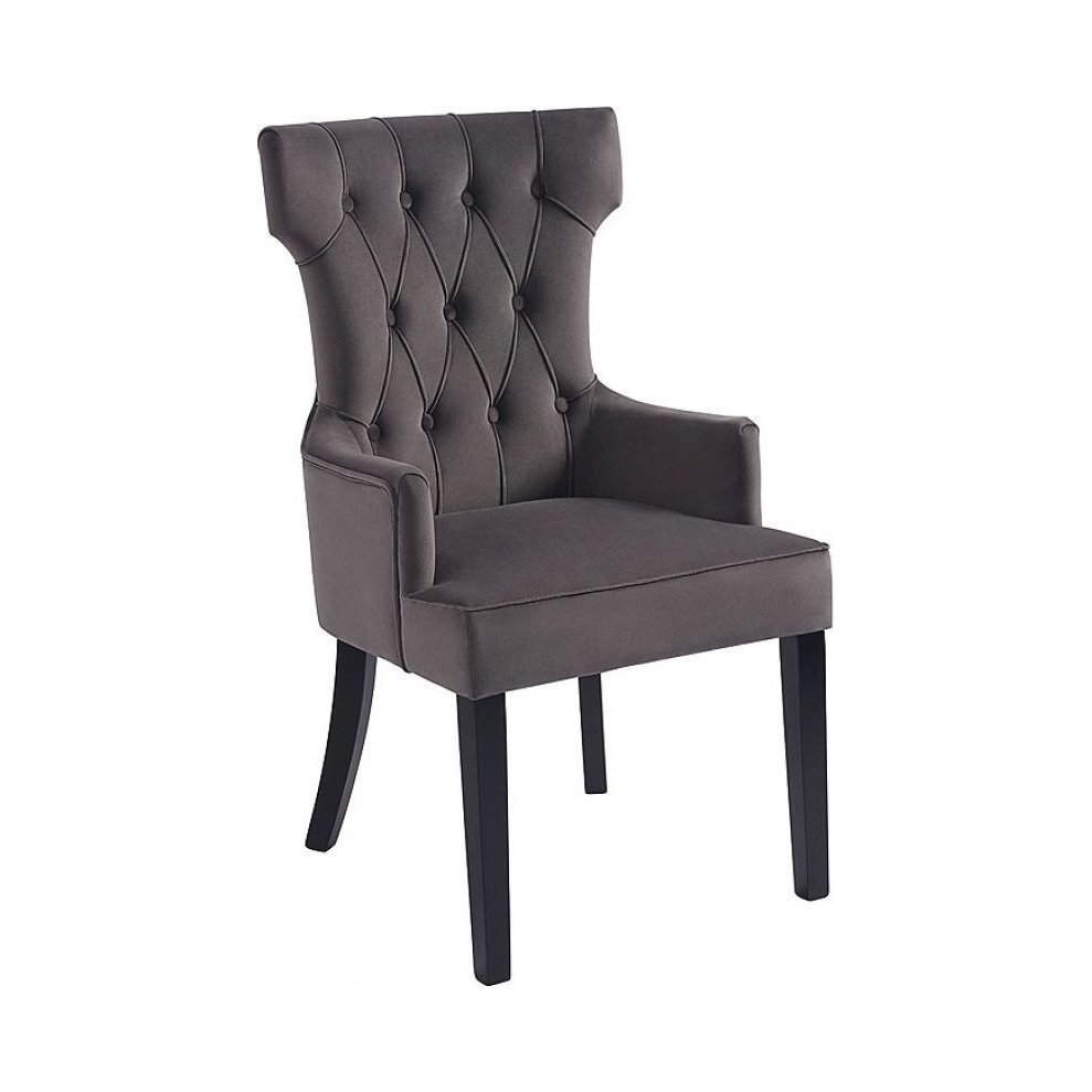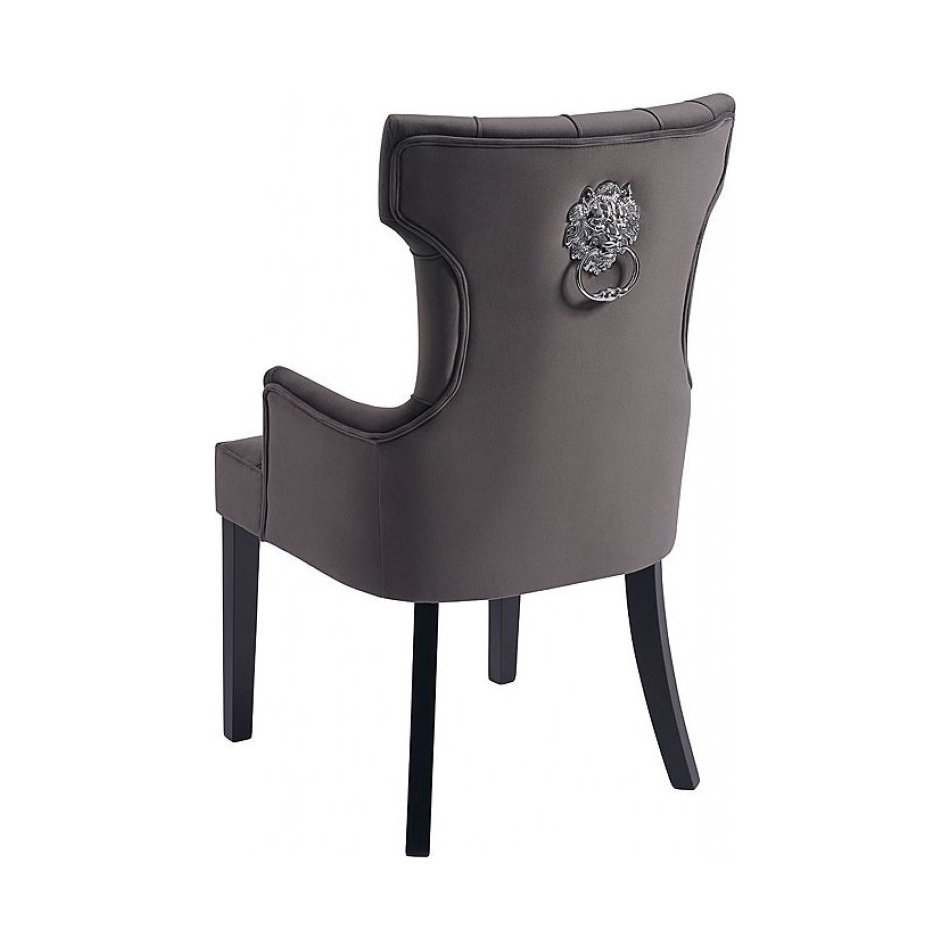 A distinctive and elegant carver chair. Coordinates with our Venice dining chair and counter stool. Featuring an impressive polished aluminium lion ring handle. Finely tailored velvet upholstery with pinched pleat detailing and deep buttoning. Comfortable foam seat with sprung webbing. Satin black stained legs. Minimal assembly required, simply attach legs.