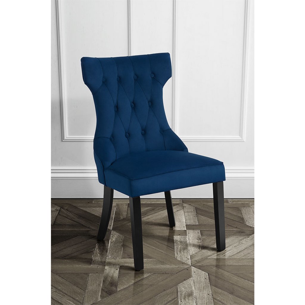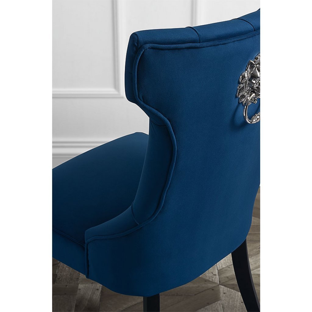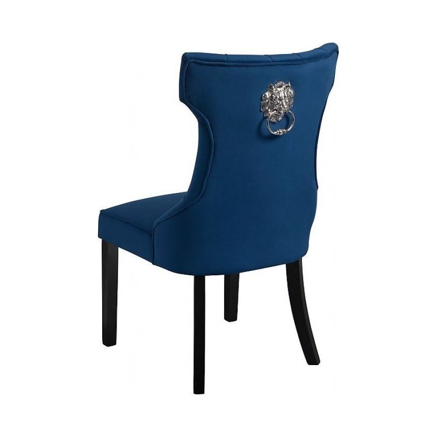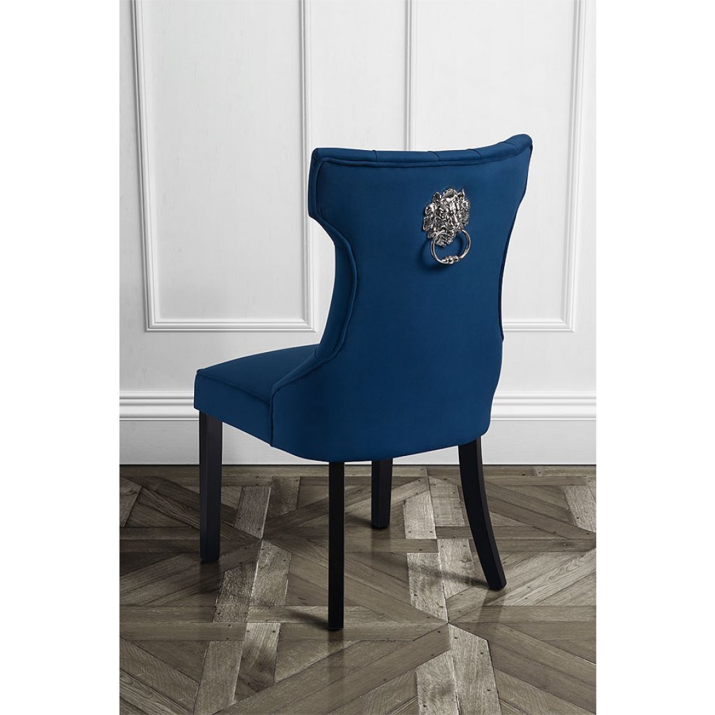A distinctive and outstandingly elegant dining chair. Featuring an impressive polished aluminium lion ring handle. Finely tailored velvet upholstery with beautiful pinched pleat detailing and deep buttoning. Comfortable foam seat with sprung webbing. Satin black stained legs. Minimal assembly required, simply attach legs.