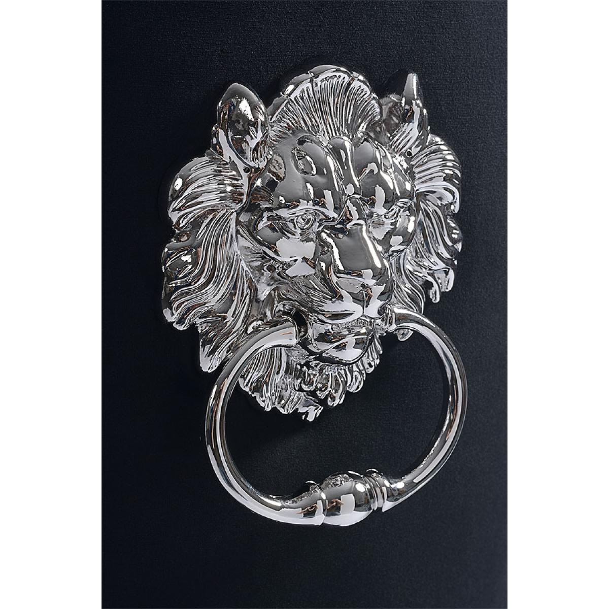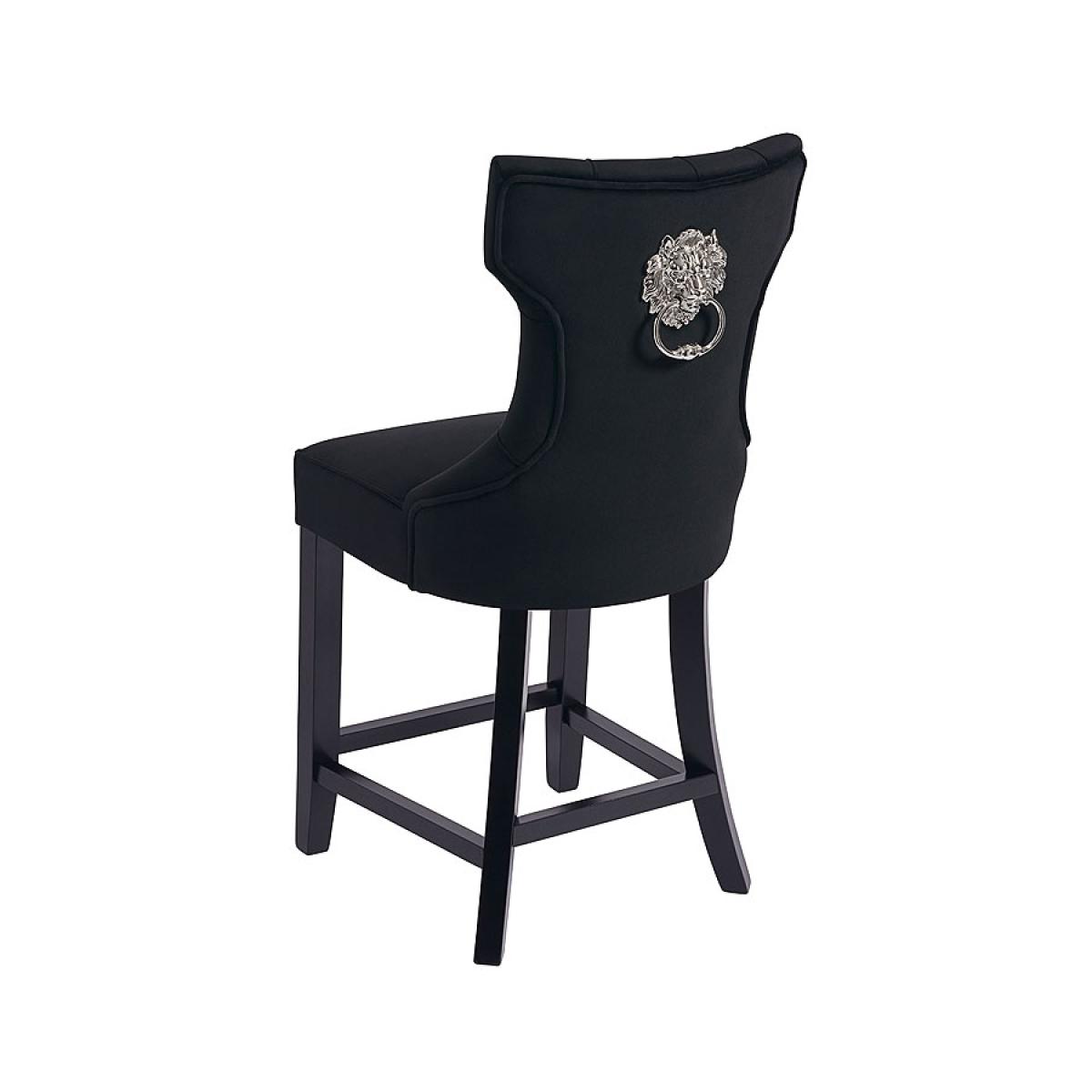 A distinctive and elegant counter stool. Coordinates with our Venice dining chair and carver chair. Suitable for use at breakfast bars and counters. Featuring an impressive polished aluminium lion ring handle. Finely tailored velvet upholstery with pinched pleat detailing and deep buttoning. Comfortable foam seat with sprung webbing. Satin black stained legs. Minimal assembly required, simply attach legs.