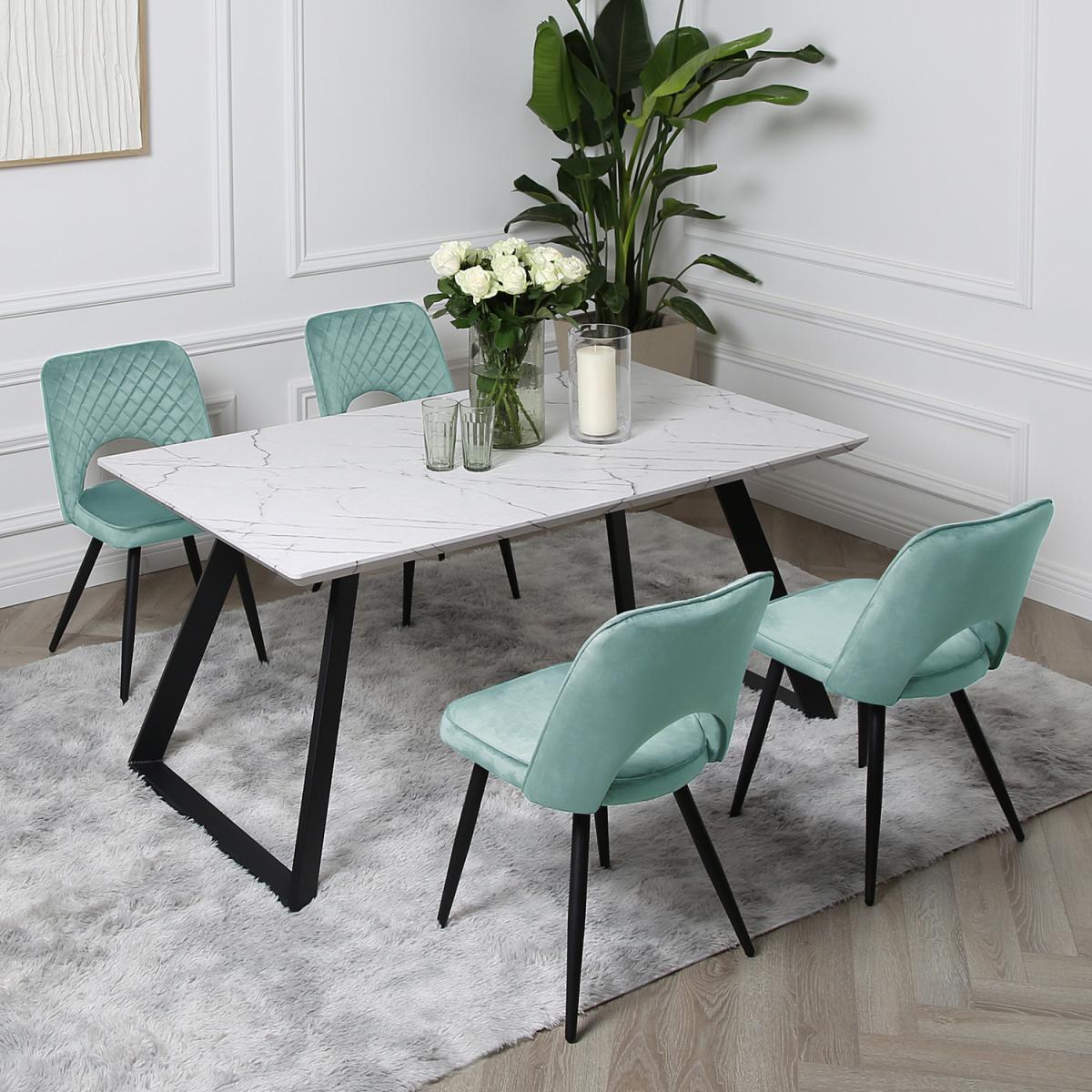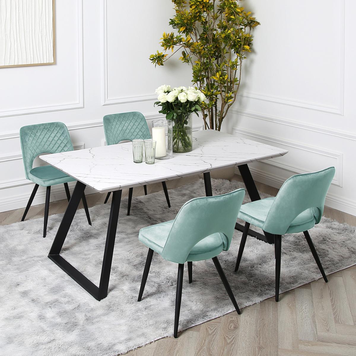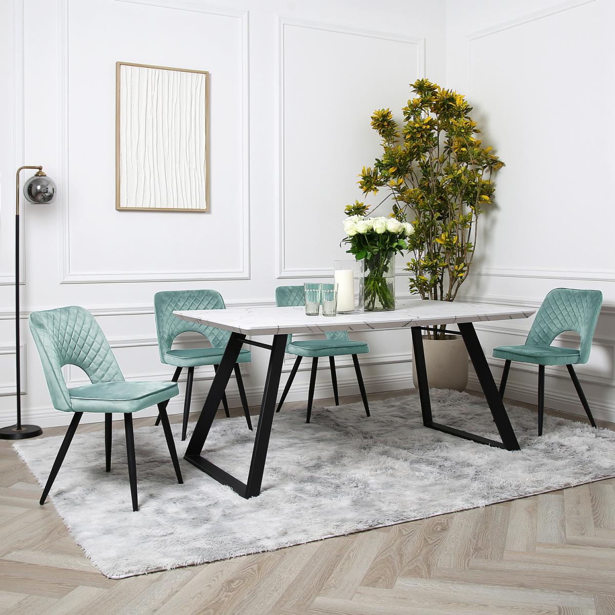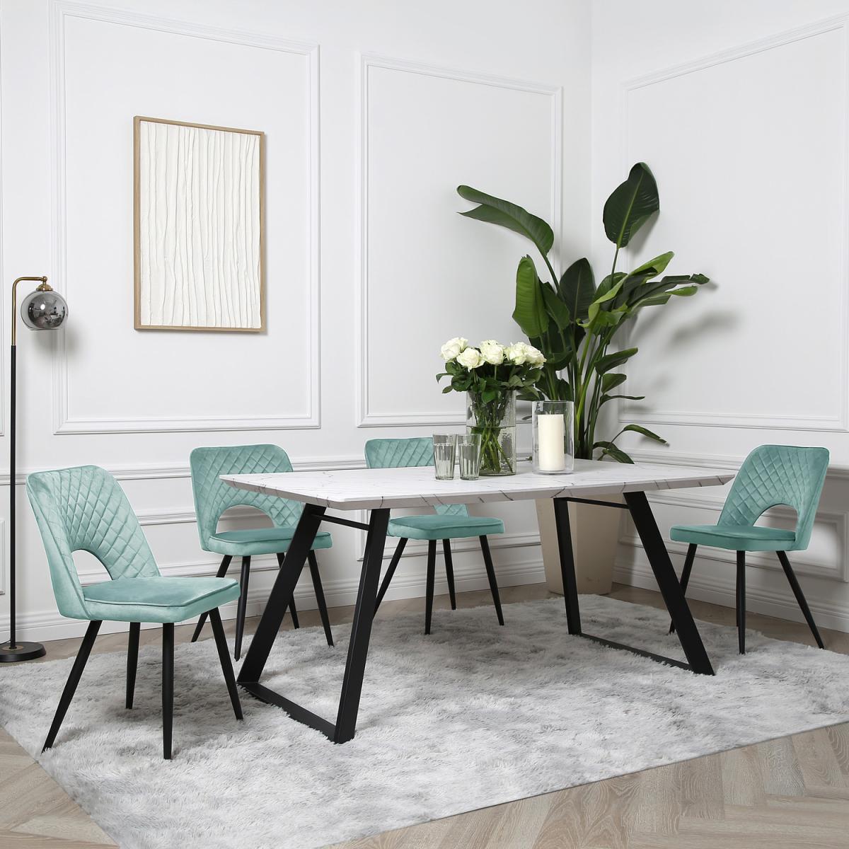 Bring the family together on this dining table with Inclined legs and chairs that offer a warm and relaxing feeling of comfort. It's easy to clean, wear-resistant, and made with quality materials that are highly durable. Its non-woven fabric chairs have a solid frame with four legs that balance evenly on the floor and a padded backrest that supports you while seating. The 70cm long dining table can fit up to 4 chairs, perfect for those moments when you are dining with more than one person. The marble dining table is skillfully crafted, and the seats are well padded to provide you and your guest with extra soothing comfort.