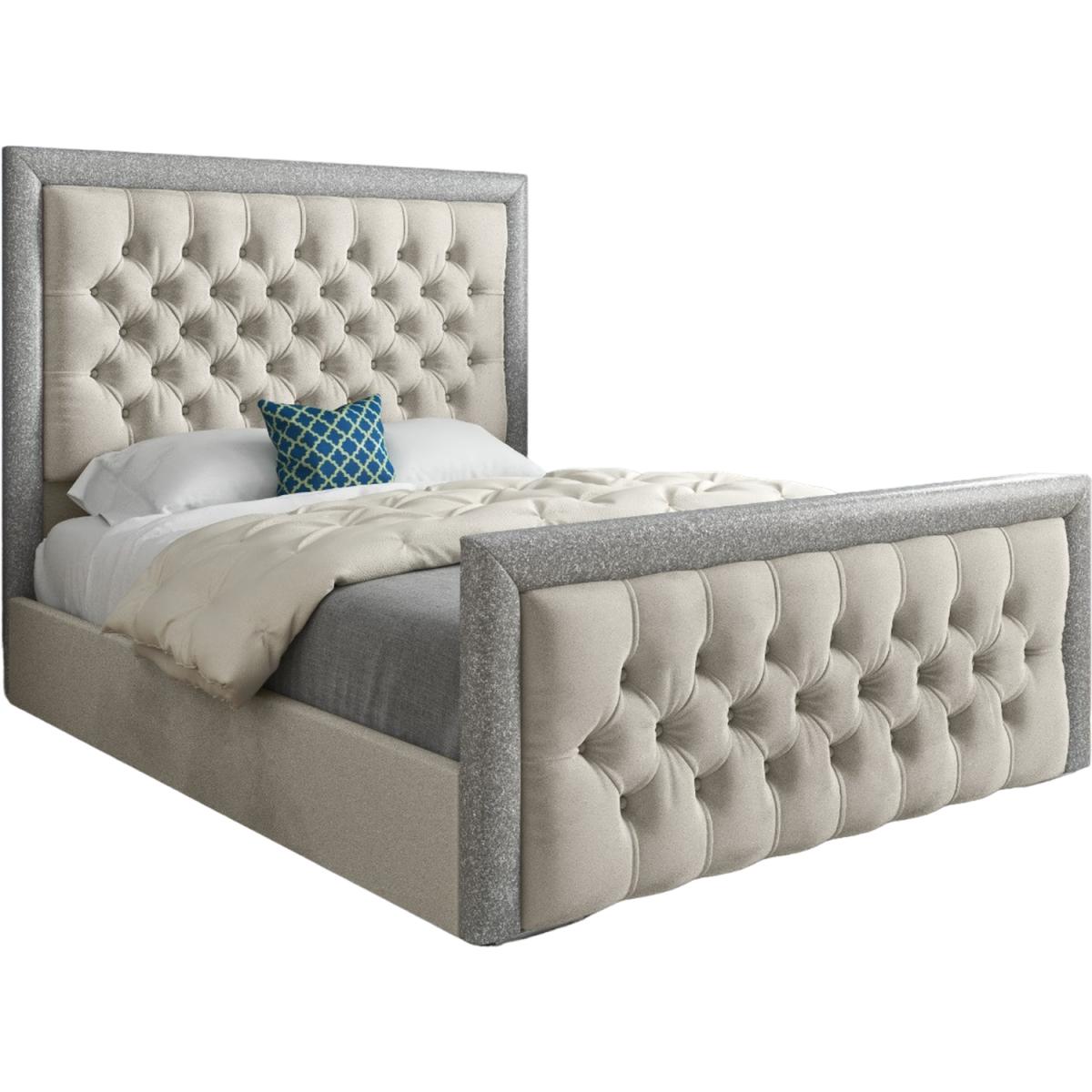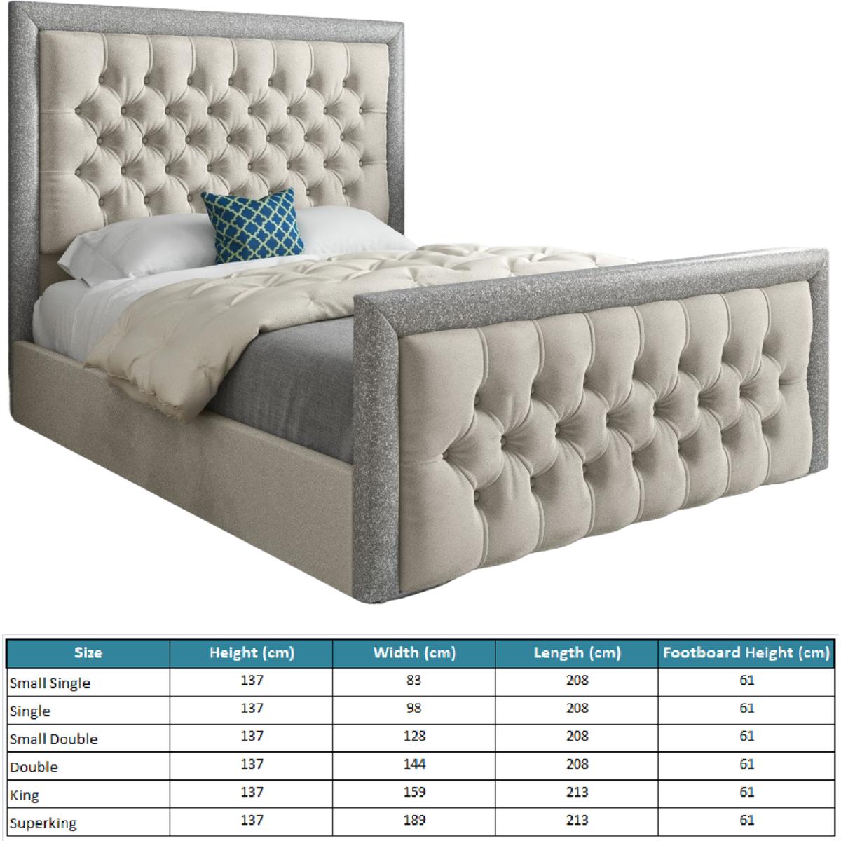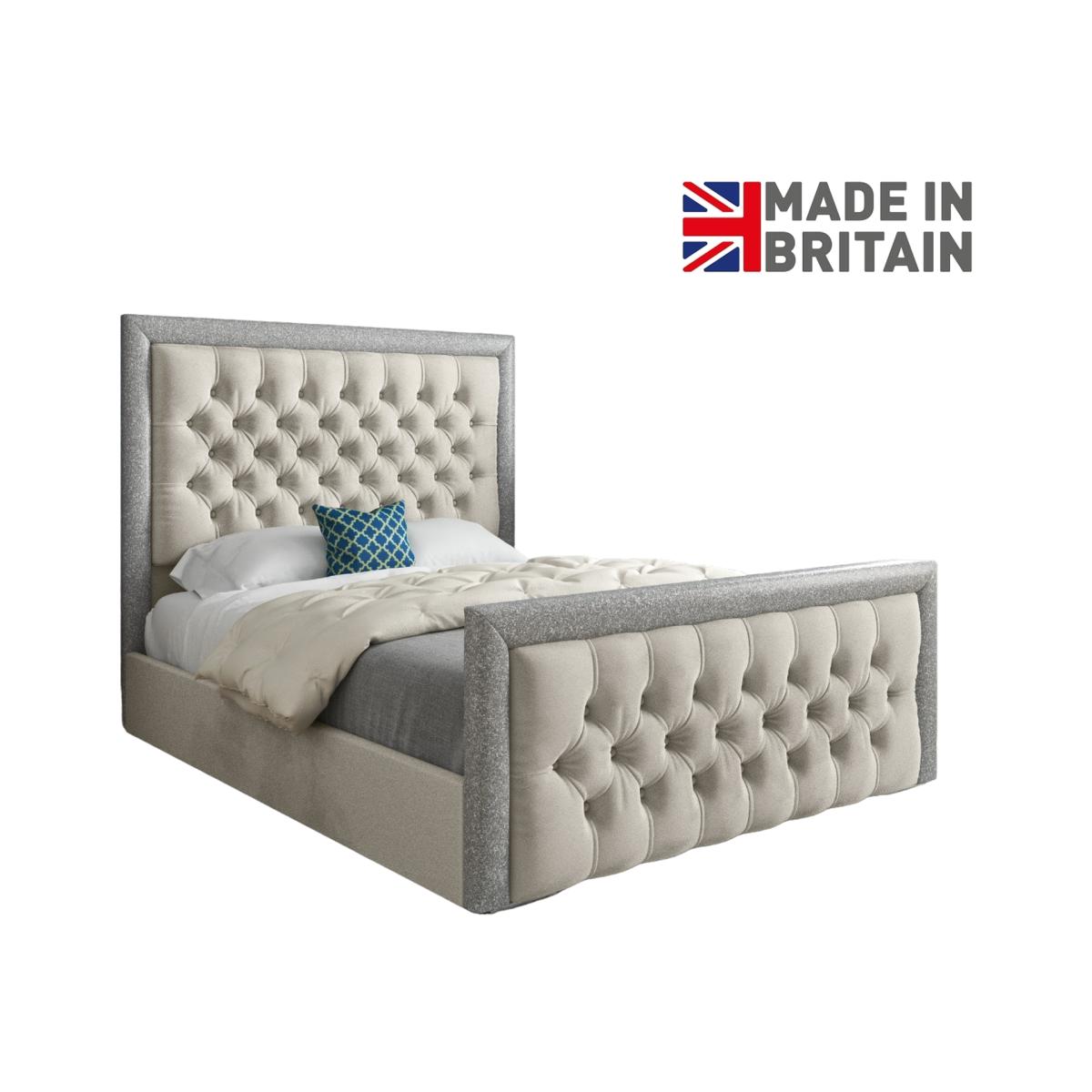 Exuding sophistication and opulence, the venice will take your breath away. The glitter border surround on the headboard and footboard beautifully compliments the deep buttoned upholstery on both the headboard and footboard. Choice of buttons,either opt for fabric buttons to subtly compliment your fabric or sparkly diamante to complete the complete fabric surrounds. Option of silver glitter or gold glitter fabric to compliment your fabric choice. The glitter can be used as a nice contrast to bring out the colour of the fabric chosen. The bed is exquisitely finished and boasts solid slats for extra durability.