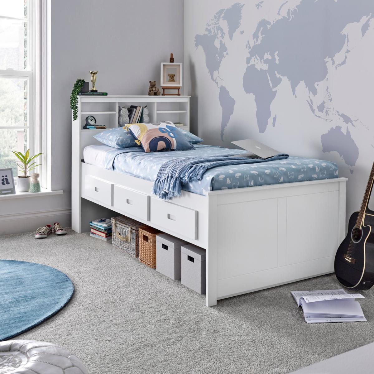 The Venus is a guest bed unlike any other. With its modern and compact design this bed offers an aesthetic design and ample storage. The headboard (which can be assembled on either side) features shelves which are perfect for containing books and any other trinkets you may have. Each shelf space is 17.5cm deep, 28cm high and 30cm wide except the middle shelf which is 33cm wide. The 2 side shelves are divided into a 9cm and 19cm high space. In addition to this, the bed features 3 pull-out drawers and an optional under-bed trundle which can double up as another large storage drawer. With the trundle the Venus Guest Bed transforms from a single bed frame to a bed which supports two sleepers.