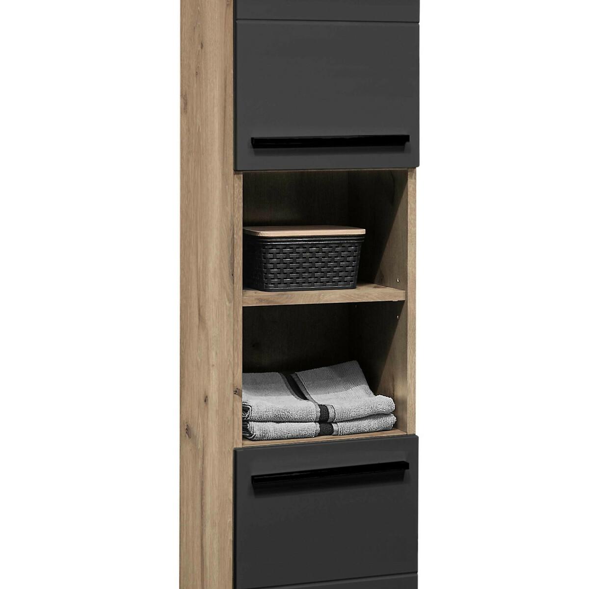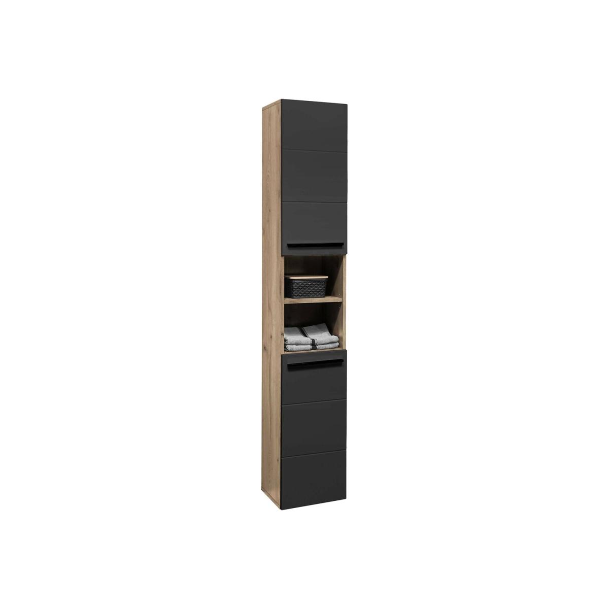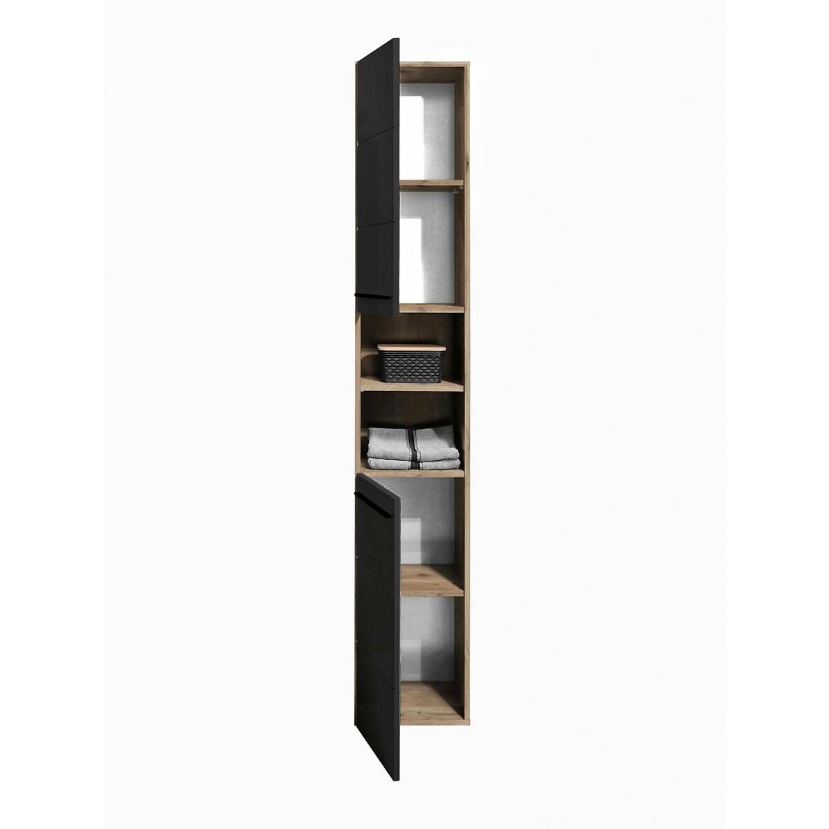 Bring a touch of elegance and modern style to your bathroom with this tall cabinet. Crafted from rich Viking Oak, its sophisticated matte black finish and horizontal notches make it both eye-catching and functional. It features two cupboards with four spacious shelves, perfect for neatly organising towels, toiletries, and more. Additionally, the two open cubby compartments provide an ideal space to display decorative items or keep frequently used products within easy reach. With its harmonious blend of style and function, this cabinet is an essential piece for those looking to add a touch of sophistication to their bathroom. Product Composition - 99% wood, 1% metal. Product Dimensions - 34 cm x 31 cm x 190 cm , Weight - 25 KGPackage Dimensions - 198 cm x 38 cm x 9 cm, Weight -28.6 KGThis product will be dispatched by one of our trusted suppliers. You’ll be contacted by their selected courier about your delivery. Please note: this product cannot be delivered to all Offshore Islands, Northern Ireland or Republic of Ireland. JULIA01