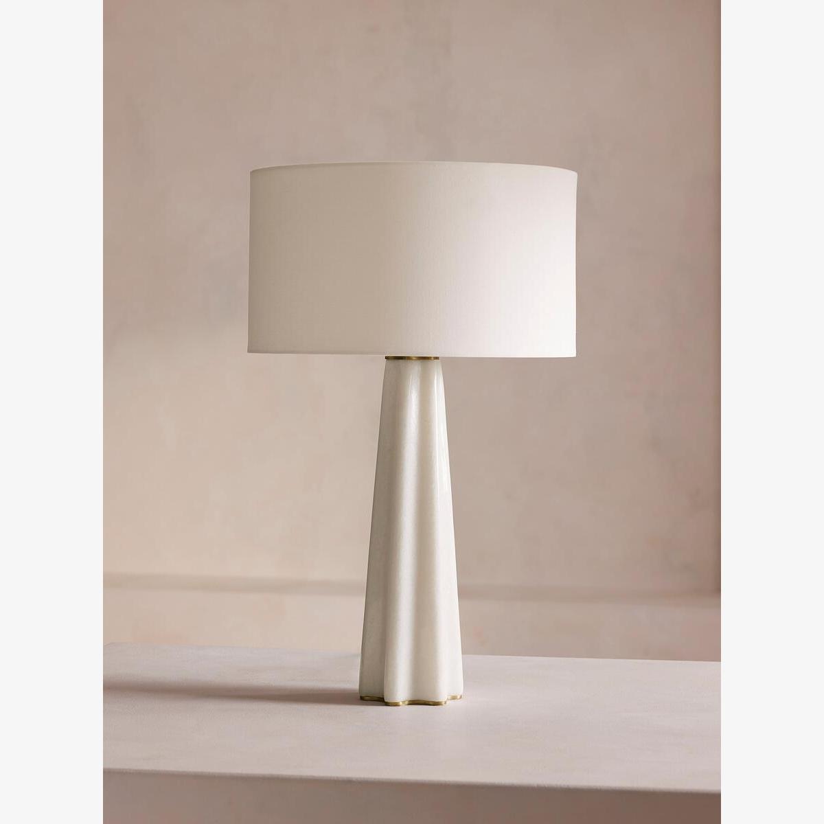 A solid base carved from white alabaster is softened by a waved silhouette. The Verano table lamp's alabaster base is scalloped at the bottom to create undulating curves around its tapered silhouette. At the top, antiqued brass hardware holds an ivory shade in place to mirror the bedroom schemes at Soho House Hong Kong.