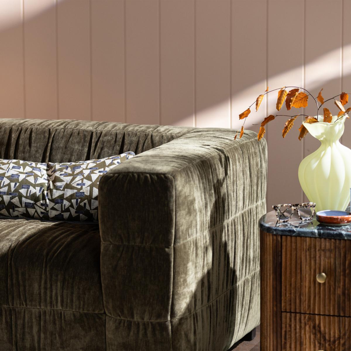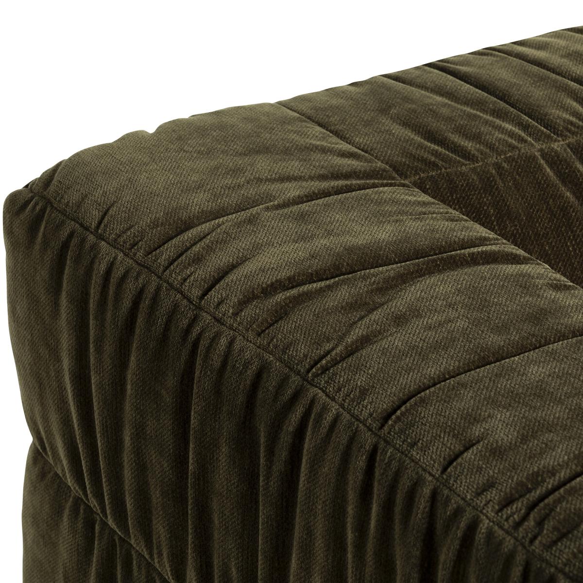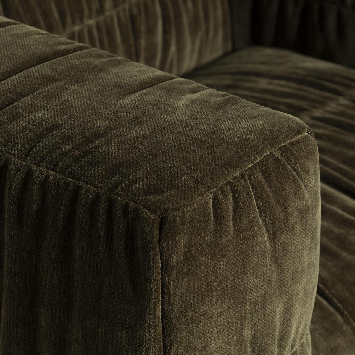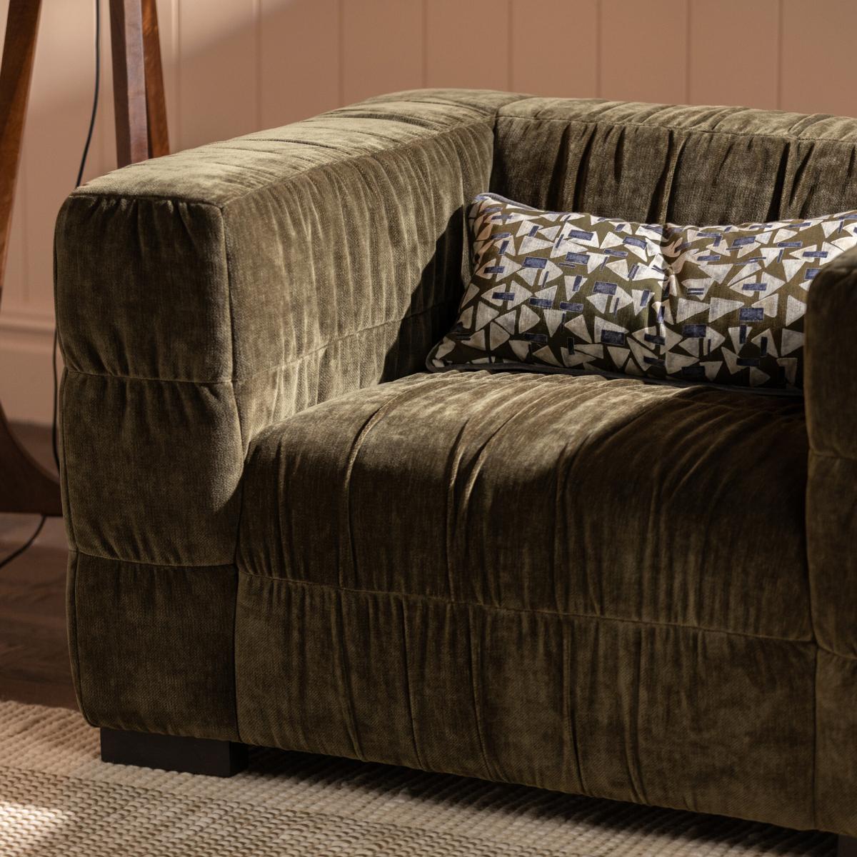 This plush Vercelli Green Fabric Armchair combines bold structure with exceptional comfort. Its deep, generously cushioned seat and wide arms are upholstered in soft, textured velvet, creating a cosy yet sophisticated statement piece. The square, block-like silhouette is balanced by subtle stitching details, providing a modern twist on classic design. Supported by sturdy block legs, it's ideal for both lounging and entertaining. Whether styled alone or paired with a sofa, this armchair adds warmth, elegance, and enduring comfort to any living space.