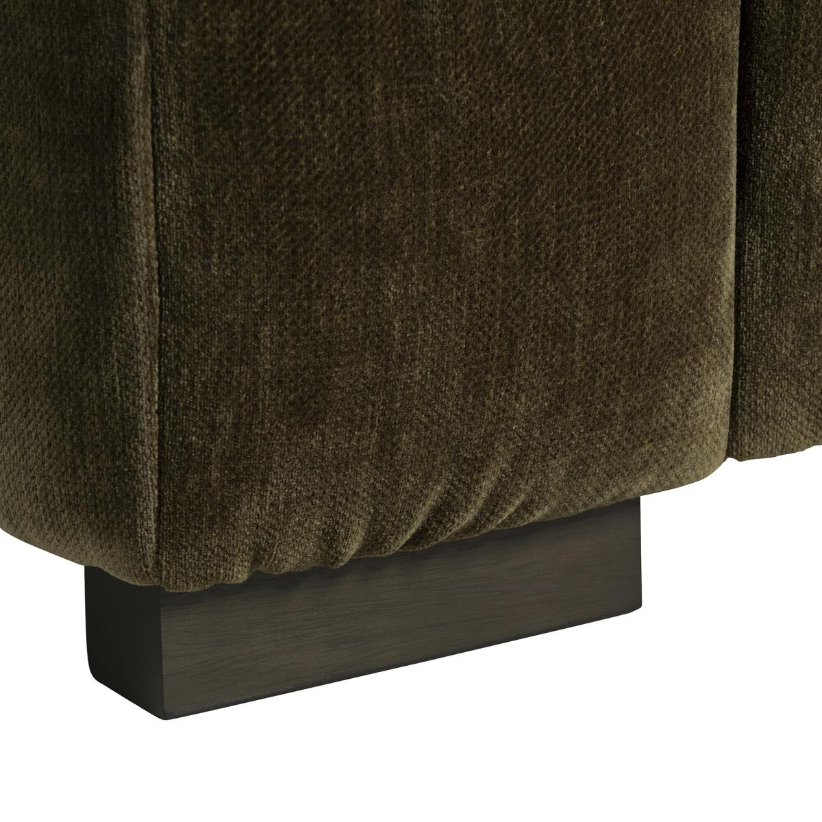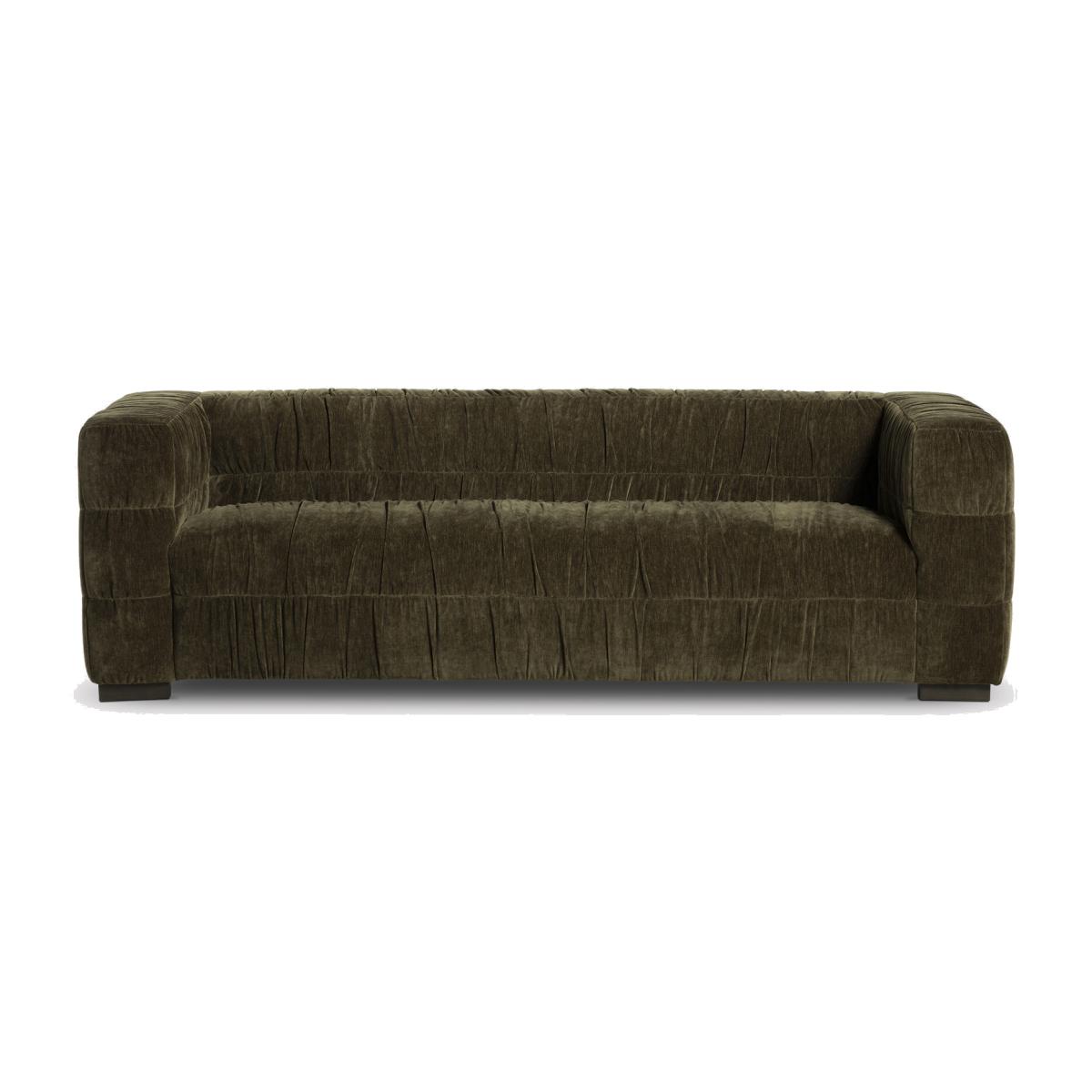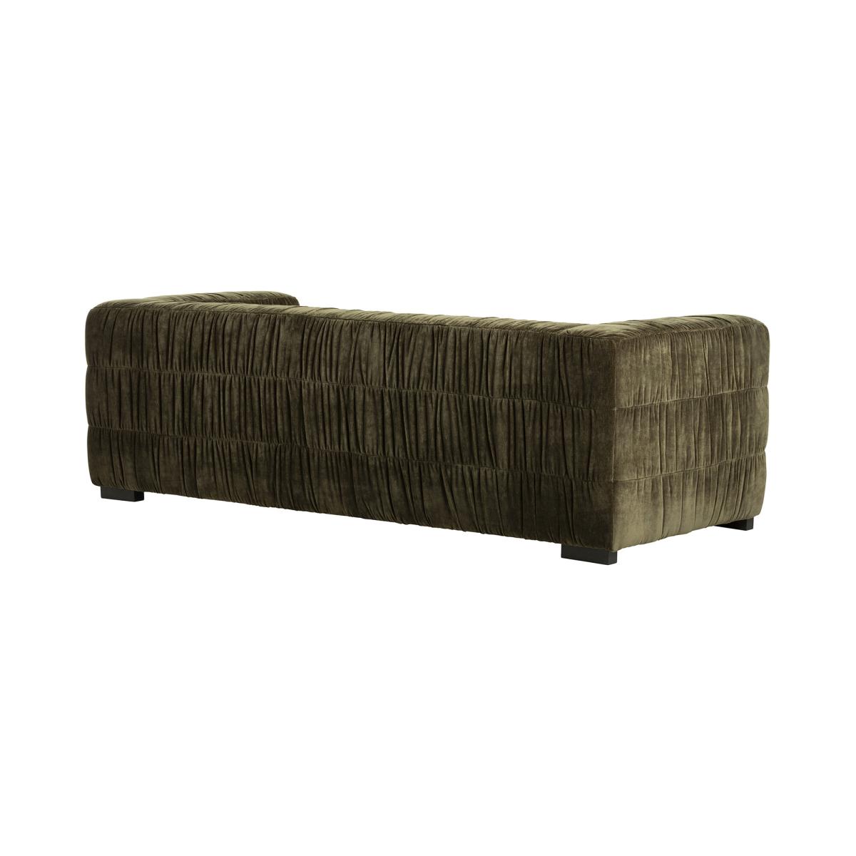 Designed for ultimate comfort and style, this Vercelli Green Fabric 3 Seater Sofa serves as a striking focal point in any living room. Its low-profile, oversized silhouette features subtle ruched detailing, adding texture and sophistication. The extra-deep seating encourages relaxation, while the wide armrests provide a balanced, grounded appearance. Luxurious fabric upholstery enhances its rich tone, making it both tactile and visually appealing. Durable block feet ensure stability, and the streamlined shape combines modern and retro influences. Perfect for lounging, this sofa elevates everyday living with plush comfort.
