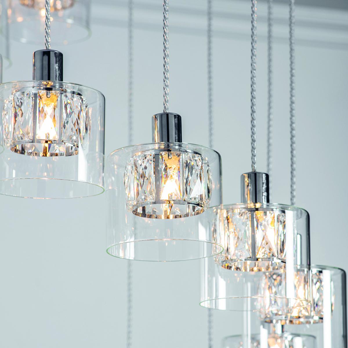I love this chandelier for its sleek, contemporary look that combines clear glass and a shiny chrome finish, making it versatile across various interiors. It works particularly well in modern or minimalist spaces, where its clean lines and transparent shades can help create a sense of openness and light. A practical styling tip is to hang it over dining tables or kitchen islands-its drop height can be adjusted to enhance the space without overwhelming it. Pairing it with warm bulbs can soften the chrome's reflective surface, adding a welcoming glow, while coordinating with other chrome or glass accents will create a cohesive, polished look.
