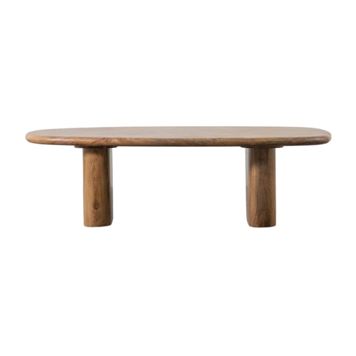 Unusual coffee table featuring chunky legs and top, with soft flowing curves which soften the look, to create a beautiful sturdy piece. It is crafted from solid mango wood with a natural finish to show the stunning grain of the timber.