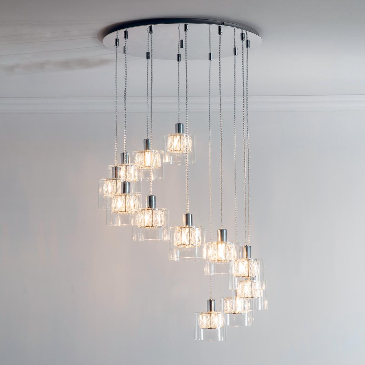 High quality clear crystals adorn this deluxe chrome plated multi pendant, the crystal shades are enclosed by beautiful clear glass diffusers, each suspended on height adjustable clear flex. The combination of clear crystals, polished chrome and glass create a luxurious interior decorative pendant light.