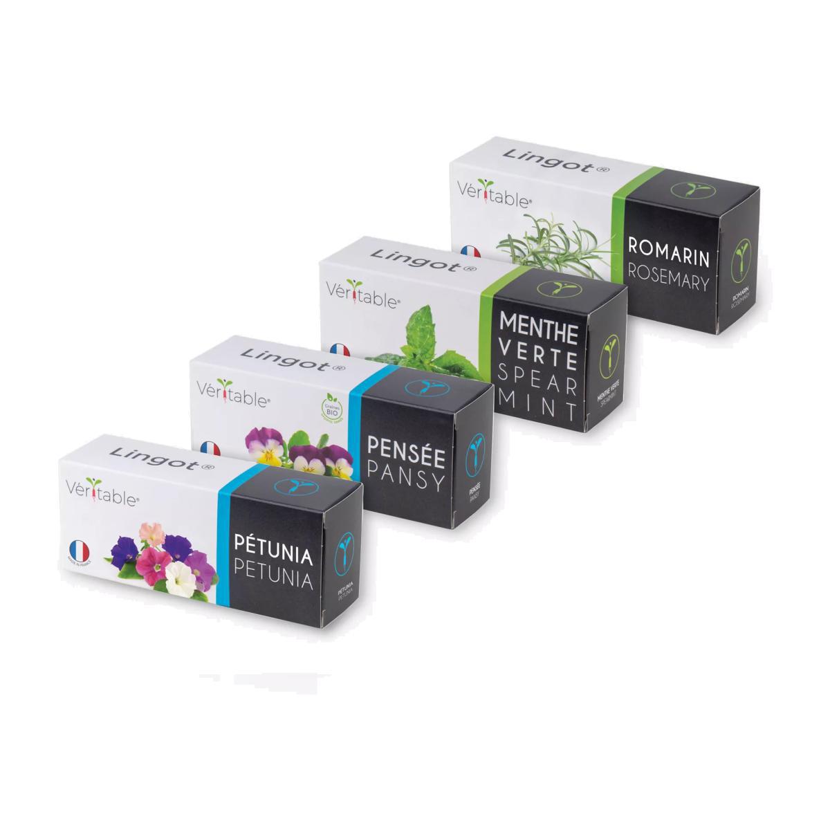 Grow your own baking and cooking herbs and edible flowers, any time of year, with this set of four from the Veritable Indoor Garden range. This set includes favourites for cooking and garnishing: Rosemary, Spearmint, Edible Pansy and Edible Petunia. Each 'lingot' contains pre-sewn seeds plus a mixture of organic matter and plant food to give you a head start. Simply plug them into a Veritable Indoor Garden (sold separately) and they germinate within one to two weeks. After around four weeks you can use the produce. The herbs continue to provide a harvest for four to six months. It's an easy way to give you fresh kitchen essentials with minimum effort, at any time of the year. Compatible with all Veritable Indoor Gardens. Refund policy We can't offer refunds or exchanges on perishable goods such as flowers and food, unless faulty or not as described.. This does not affect your statutory rights. Please see bottom of page for ingredient information.