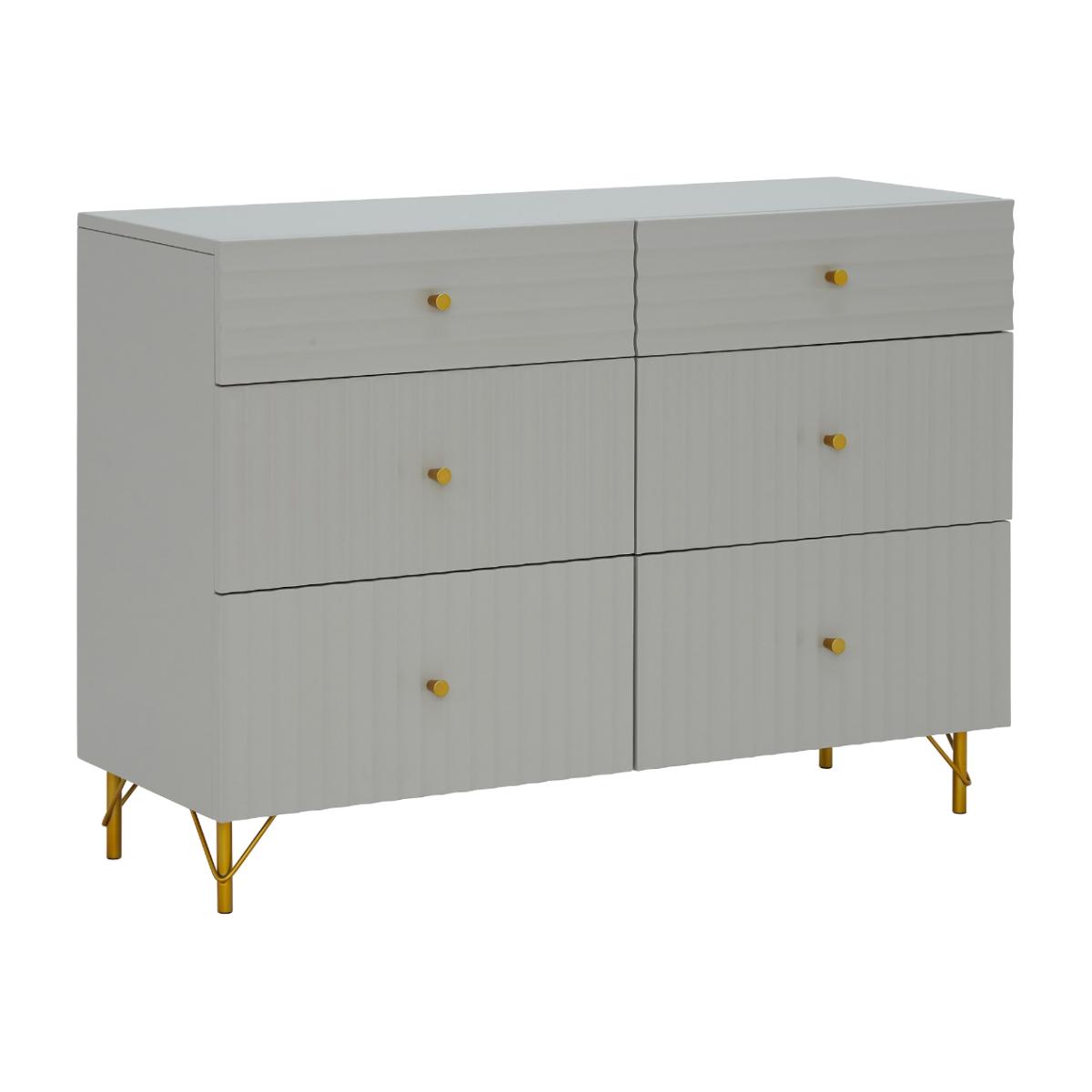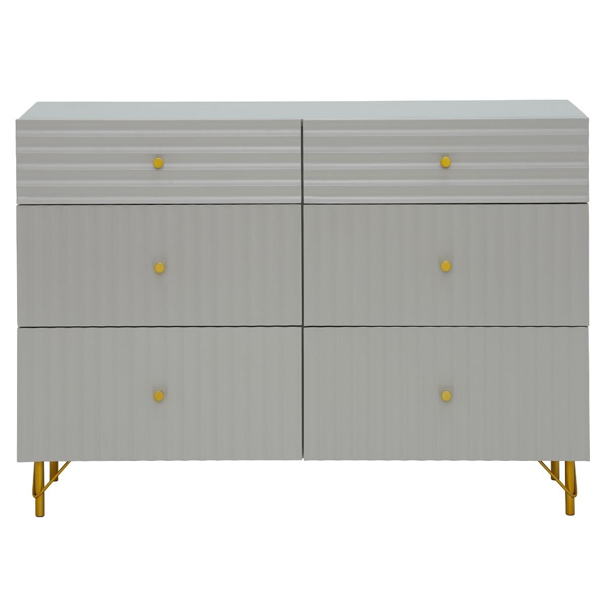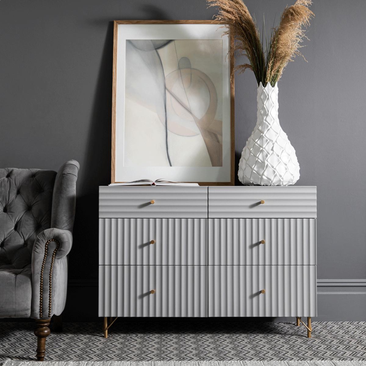 Design. An ideal storage solution for your bedroom or dressing room, the Verity 6 Drawer Wide Chest, is both practical and super stylish. The light grey finish, horizontal and striped detailing, and gold hardware boast sophistication and modern glam with a traditional touch giving your space a new lease of life. The 6 spacious drawers allow you to keep all your garments organized neatly for both a clean space and mind. Explore the Verity range for a cohesive look.