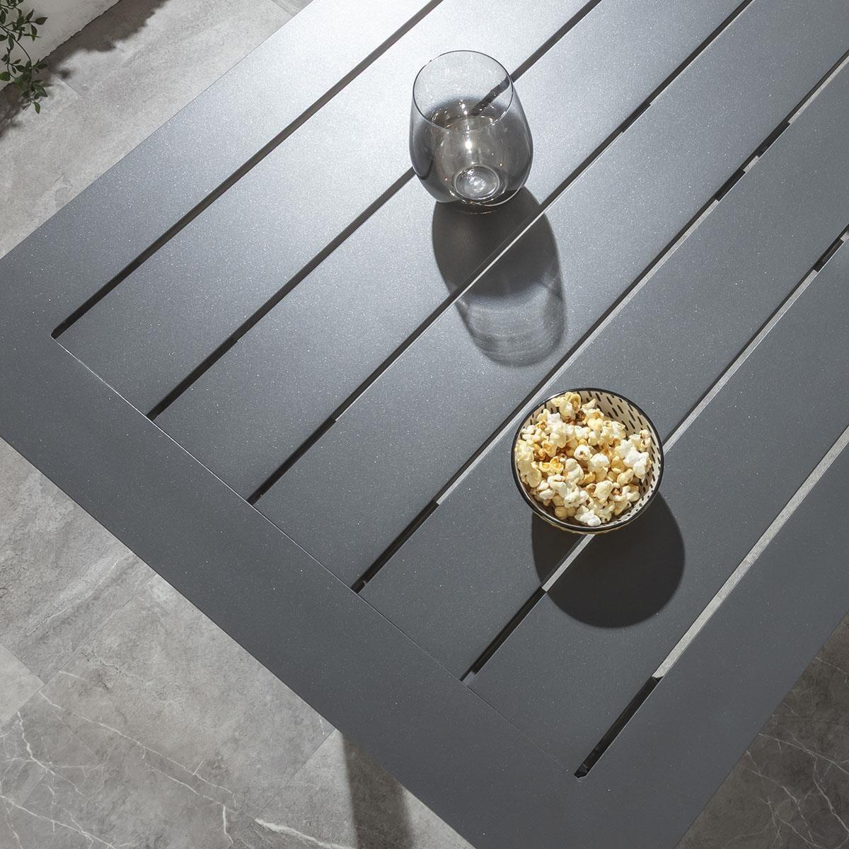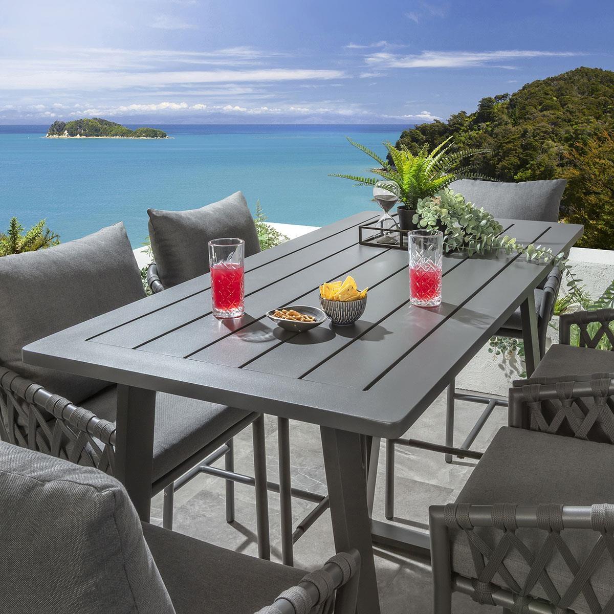 This 6 seater garden bar set includes a rust-resistant aluminium bar table in a rich grey powder-coated finish, with all-weather grey rope-back bar stools, generously padded for an extra layer of luxury comfort. This outdoor bar table set is crafted for durability and comfort. Elevate your garden set with the modern outdoor bar table. Crafted from rust-resistant aluminium, it features a 150cm x 70cm slatted top and a rich grey powder-coated finish. With a curved leg design, this tall outdoor table is perfect for hosting drinks all year round. A protective cover is included to keep it clean. Transform your outdoor bar with the 6 fabulous all-weather grey rope-back garden bar stools in this set. The generously padded outdoor chairs are enhanced by a supportive back cushion for an extra layer of luxurious comfort. Our modern bar set will make a stunning addition to your outdoor seating area or patio. This 6 seater high bar set combines modern Verity bar chairs with the stunning Freddy table. Whether you love the Verity chairs and would like to purchase them individually, or you think the Freddy table would complete your outdoor bar area better with another stool, you can easily mix and match our garden tables and chairs to curate something truly unique. Table Size W150cm D70cm H110cm Bar Stool Size W55cm D56cm H101cm Modern Garden Bar Set for 6