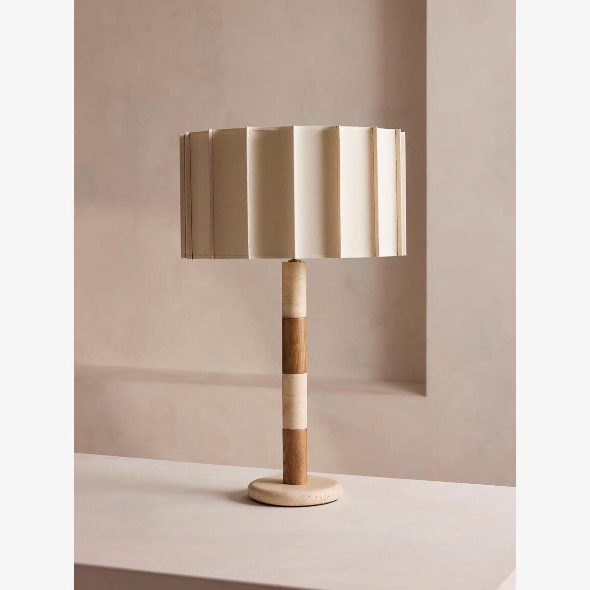 Stacked pieces of solid oak and travertine create the column-style stem of this table lamp. Perched on a stacked column stem, the Verity table lamp's linen shade is detailed with inverted pleats surrounded by contrasting stitching. This style is inspired by east London's Shoreditch House.