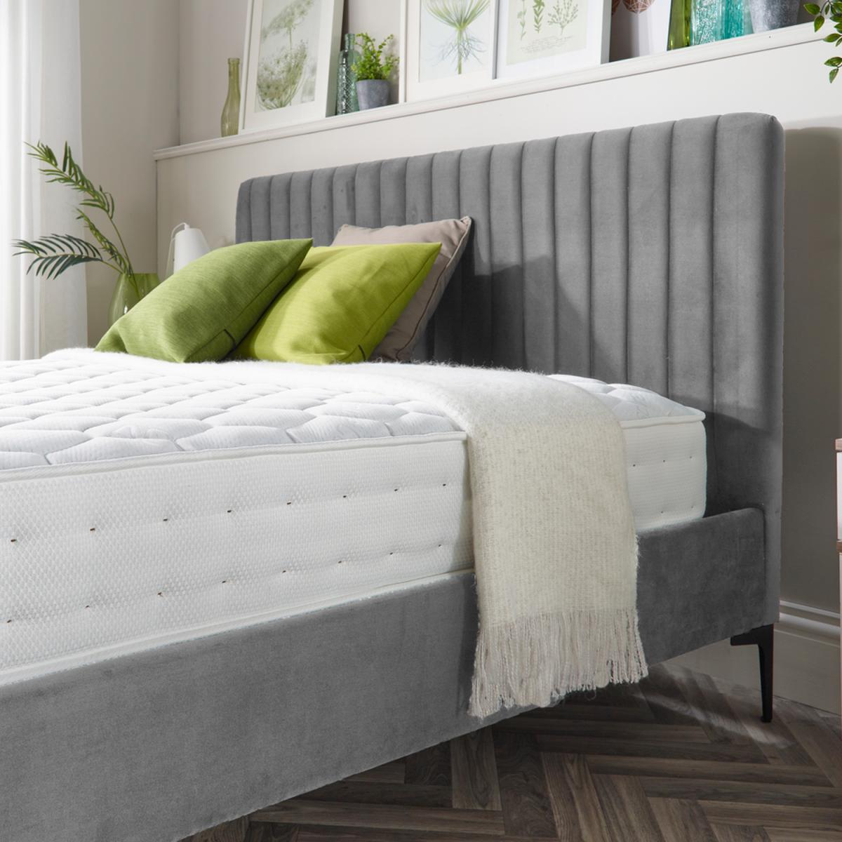 Elevate your sleep space with the opulent Vermont bed frame from Aspire, exuding a touch of luxury. Wrapped in a sumptuously soft brushed velvet fabric, this bed frame is available in sophisticated shades of versatile grey or vibrant, lush green to infuse a burst of color. The headboard and footboard are adorned with elegant vertical stitching, while the gentle curves soften the overall silhouette, creating a captivating contrast against the straight lines of your bedside table and chest of drawers. Complemented by sleek tapered black feet, this bed frame is designed with high-quality, sprung slats for enhanced comfort (note mattress to be purchased separately). While assembly is required, no additional tools are necessary for setup. Wrapped in a sumptuously soft brushed velvet fabric, this bed frame is available in sophisticated shades of versatile grey or vibrant, lush green to infuse a burst of color. The headboard and footboard are adorned with elegant vertical stitching, while the gentle curves soften the overall silhouette, creating a captivating contrast against the straight lines of your bedside table and chest of drawers. Complemented by sleek tapered black feet, this bed frame is designed with high-quality, sprung slats for enhanced comfort (note mattress to be purchased separately). No additional tools are necessary for setup.