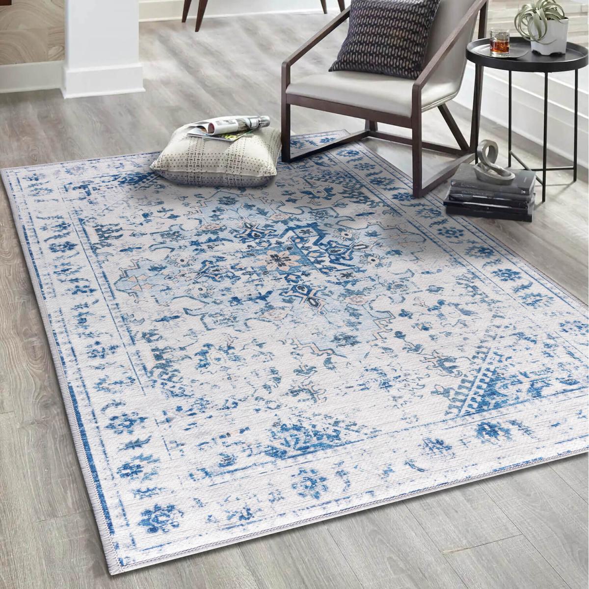 Vernal Milagros Blue, Beige and Cream Machine Washable Rug - Blue / 152 cm x 213 cm