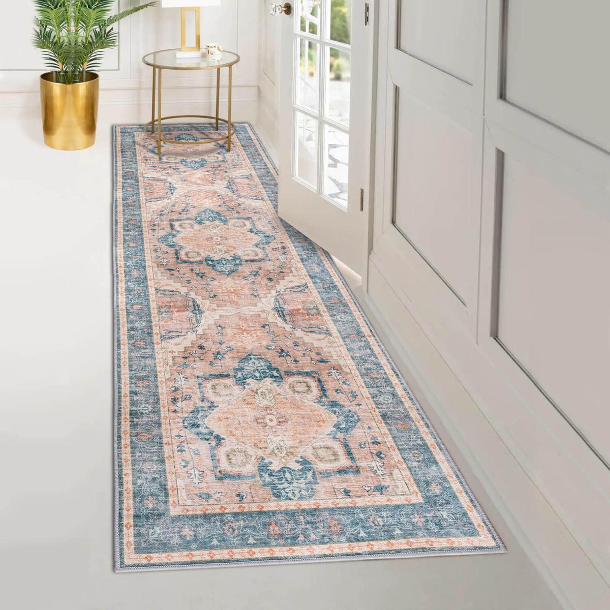 I really like this runner because of its versatile colour palette and fresh, modern feel. The teal, cream, and orange tones make it an ideal addition to contemporary or eclectic interiors, especially in living rooms, hallways, or under a kitchen island. Its machine-washable feature adds practicality, making it perfect for busy households or spaces prone to spills. To style it effectively, consider pairing it with neutral furniture and colourful accessories that pick up the orange or teal hues for a cohesive look. It also works well layered over wooden or light-coloured flooring, bringing a cosy yet stylish touch to any room.