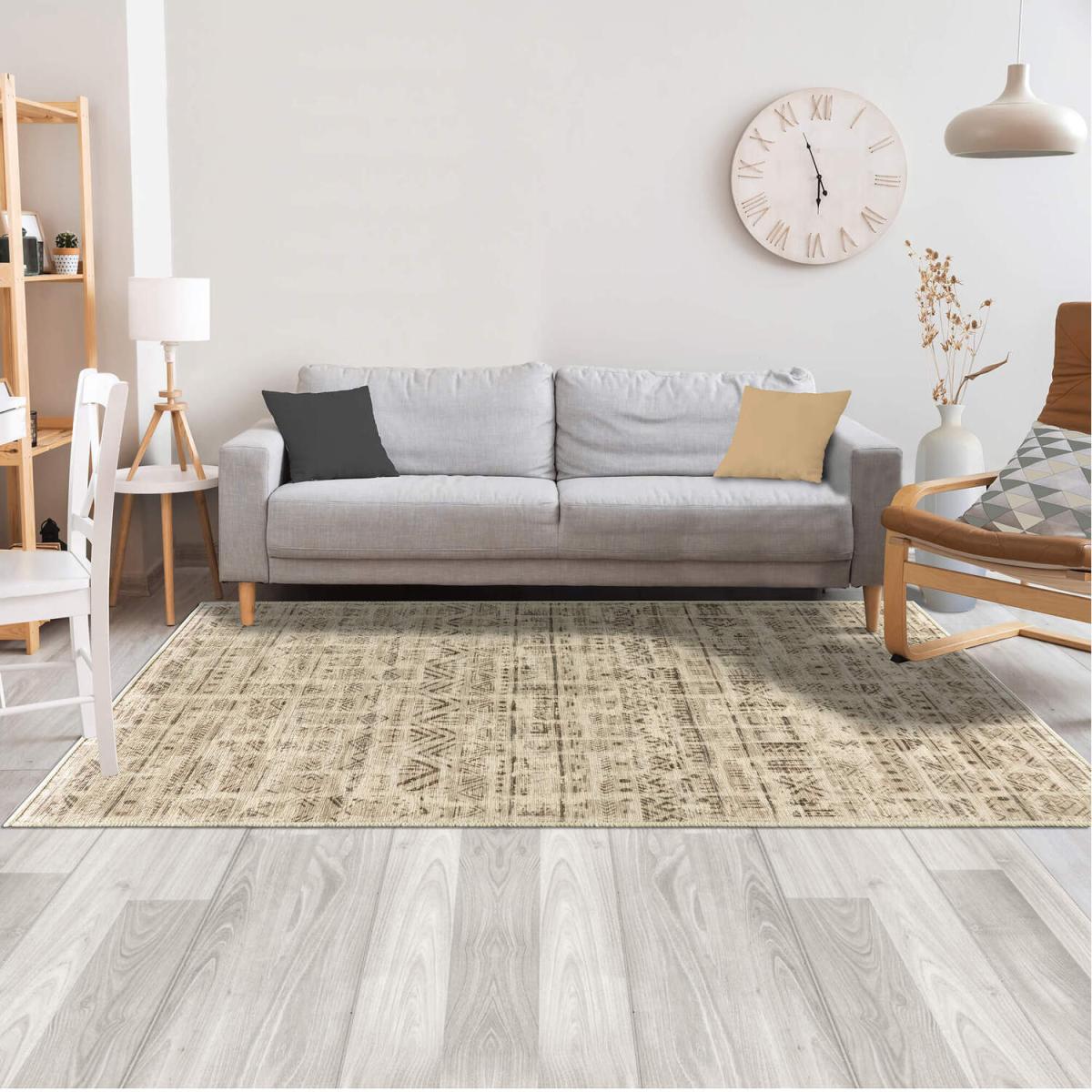 I love the vibe this rug brings to a space - its neutral beige and black palette offers versatility that can easily complement both modern and more traditional interiors. The fact that it’s machine washable makes it a practical choice for busy households or homes with pets, without sacrificing style. It works particularly well in open-plan living areas or under a sofa to anchor the space, and its size is ideal for defining a seating zone. For styling tips, try layering it with textured cushions or throws to add depth, and pair it with contrasting furniture pieces to create a balanced and inviting look. Its understated tones allow it to breathe effortlessly into various colour schemes, making it a reliable foundation for your room’s aesthetic.