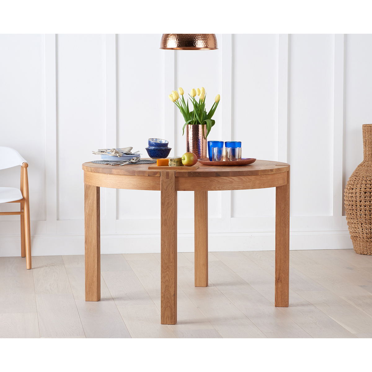 The Verona 110cm Solid Oak Round Dining Table is a fantastic piece of furniture that brings an added sociability to the dining room. Modest in size and capable of seating 4 diners, this is a table that is perfect for family meal times and entertaining close friends. The table has been perfectly crafted from solid oak in a finger-jointed style that gives the table an extra dimension to its appeal. The table features four legs supporting a smooth table top and is complete with an oiled finish that helps protect the table from every day wear whilst highlighting the quality of the oak. The table is also available with a selection of dining chairs. Further Items in the Collection: Verona 120cm Solid Oak Dining Table, Verona 150cm Solid Oak Dining Table, Verona Solid Oak Coffee Table and Verona Solid Oak Display Cabinet. Additional Measurements:Measurements between Table Legs:62cm