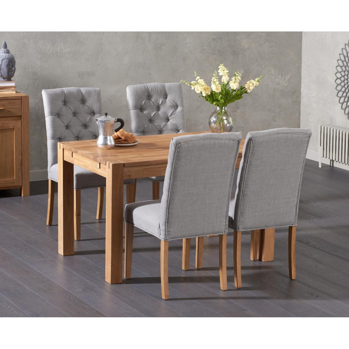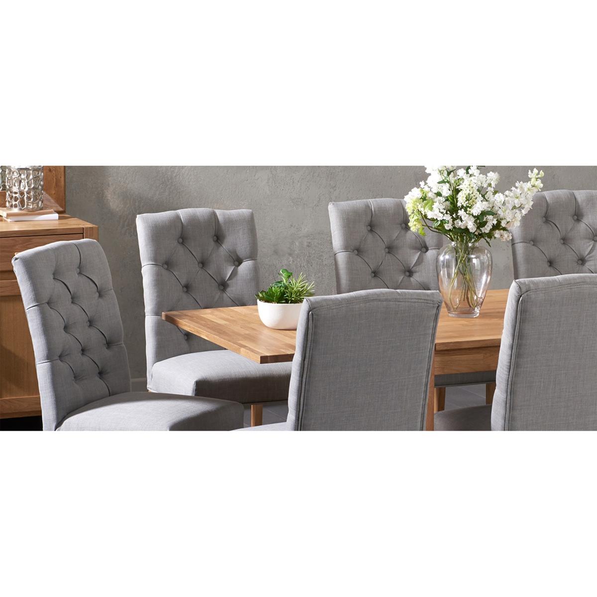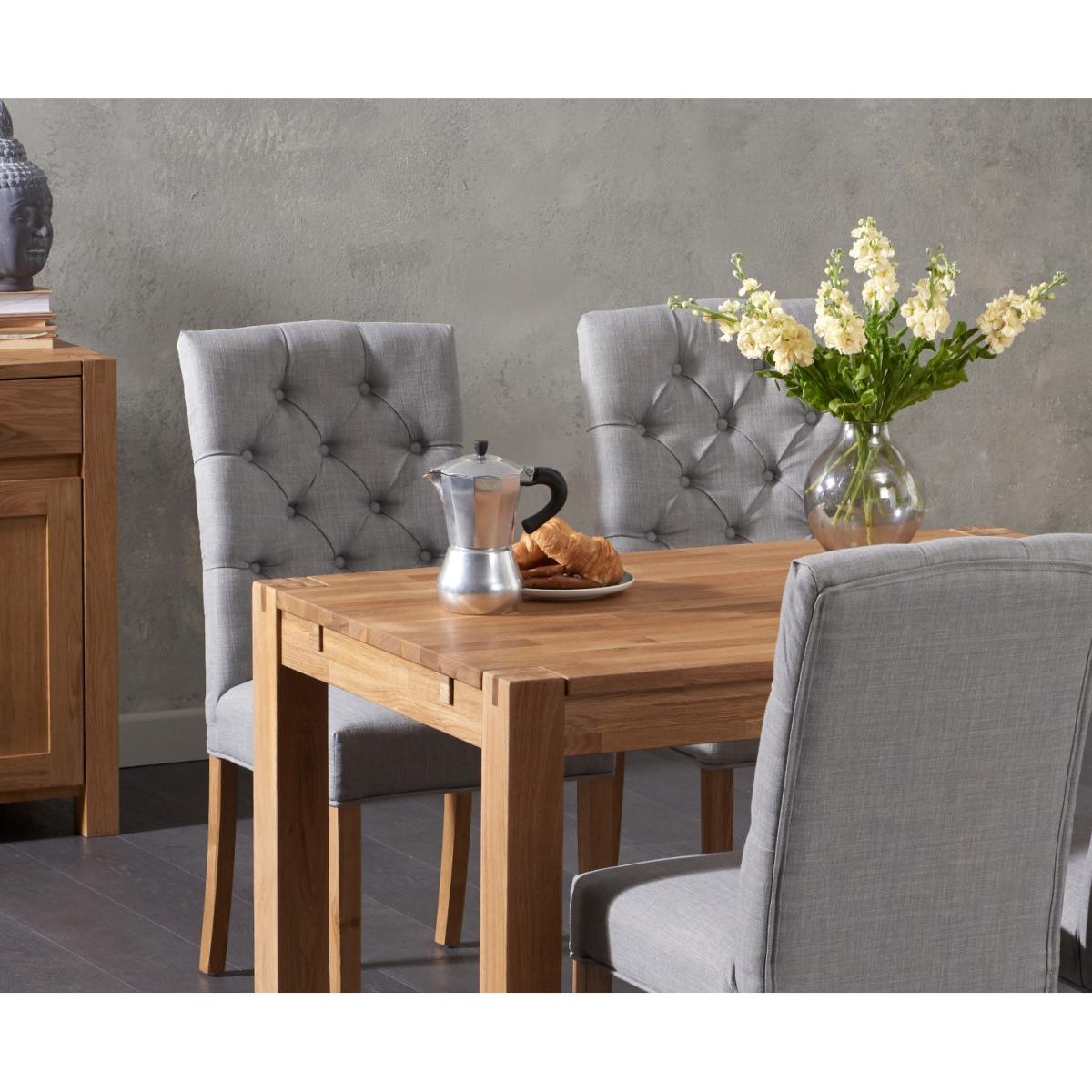 The Verona 120cm Solid Oak Dining Table with Claudia Fabric Chairs is a a stylish and sophisticated dining set that is perfect for seating up to 4 diners. This solid oak dining set with fabric-upholstered chairs is ideal for kitchens and small dining areas. Made from solid oak and designed in a simple, yet timeless fashion, the Verona 120cm boasts finger-jointed edges and an oiled finish that nourishes the oak and keeps it in good condition. Able to seat up to 6 people, it’s easy to pair with other chairs and pieces of furniture and will provide you with hardwearing service for years. With their classic, stylish looks, our Claudia Fabric Chairs make stunning additions to the set. Boasting tufted button detailing, solid oak legs and S-sprung seats with dense foam padding, they’re as stylish as they are comfortable. Choose from grey or cream.