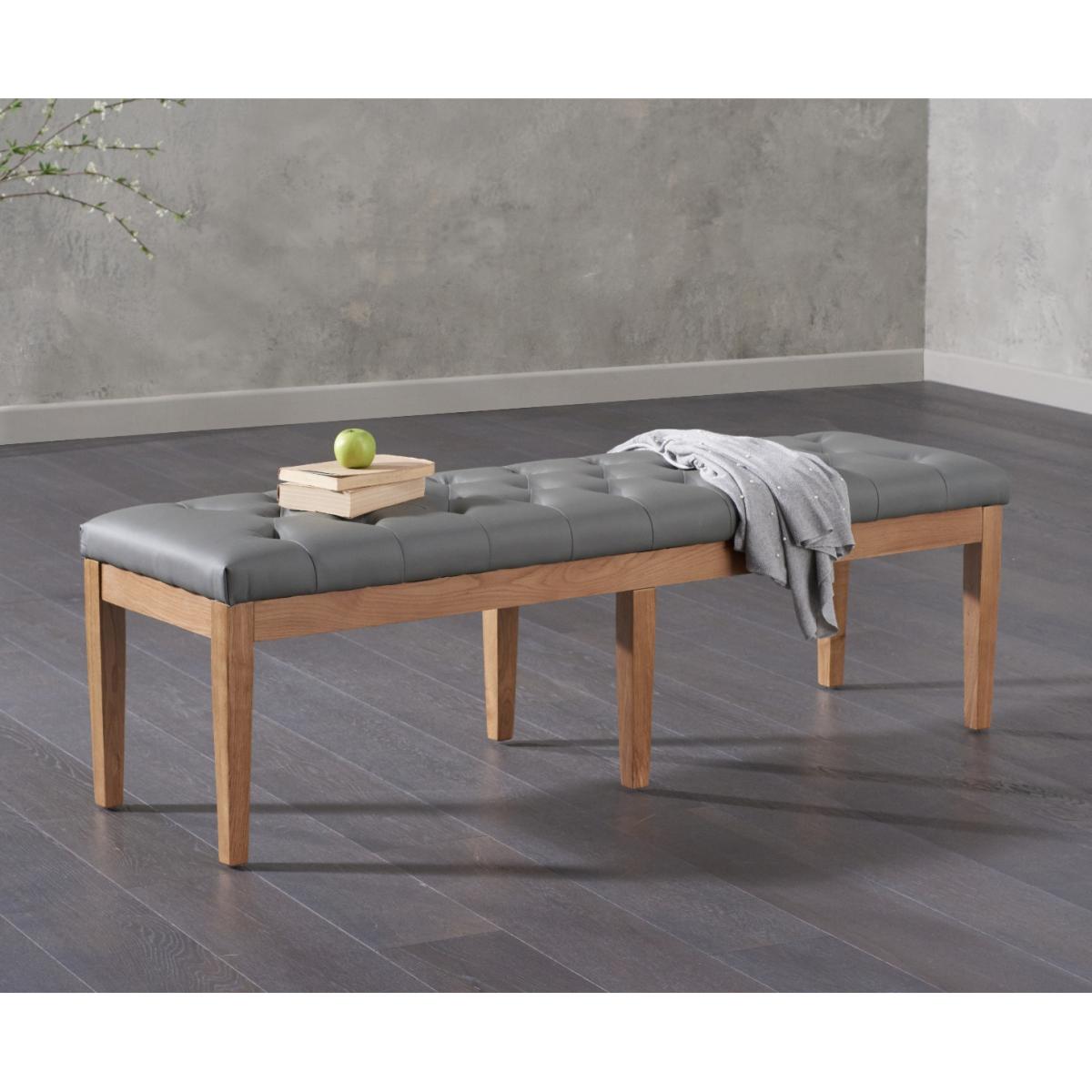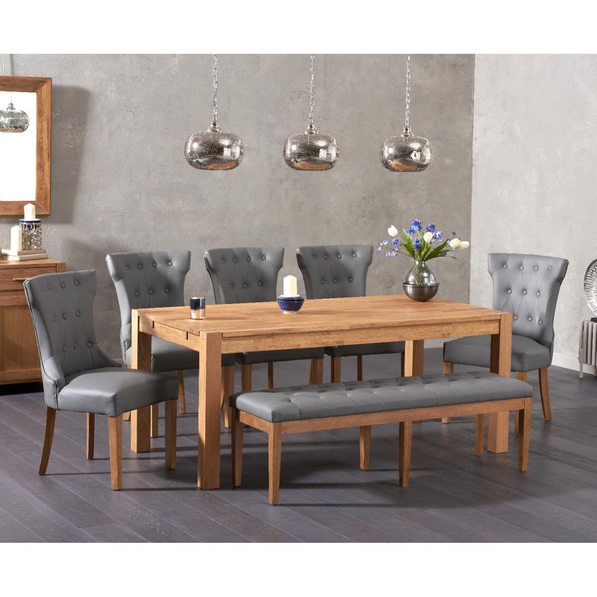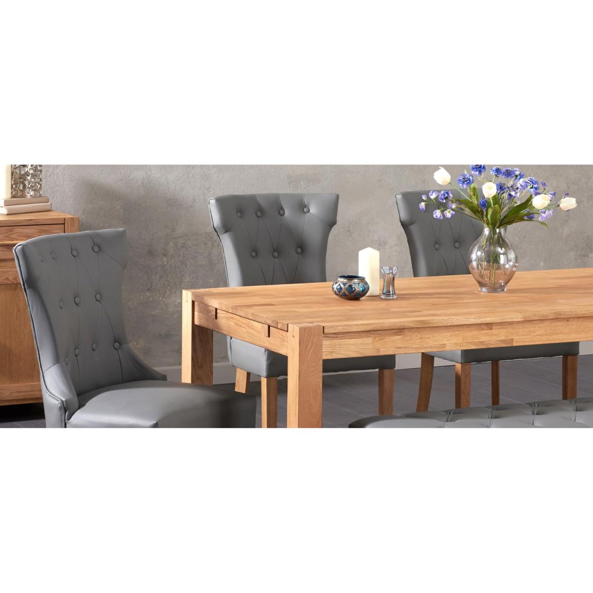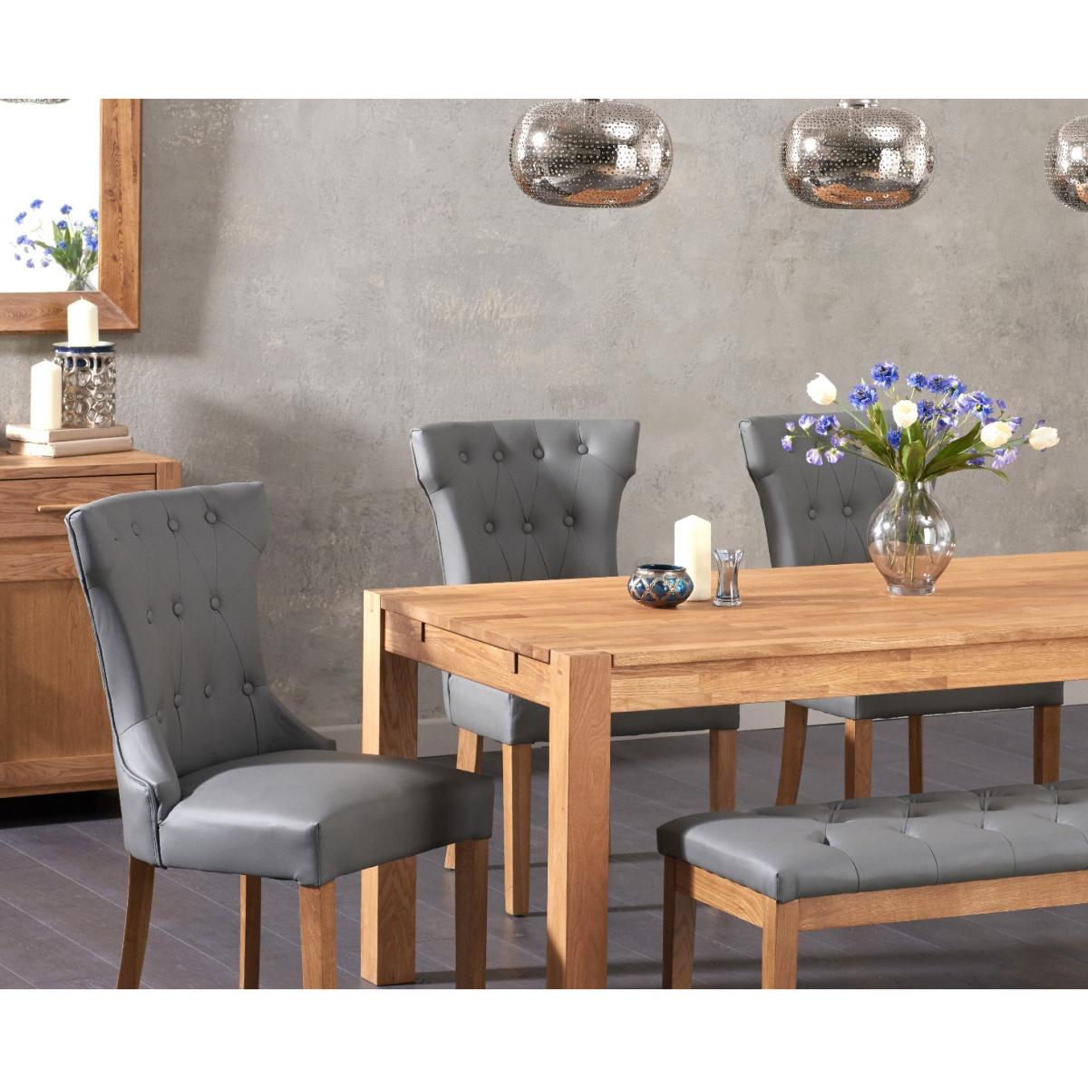 Combining practical seating options with hardwearing practicality, Verona 180cm Solid Oak Dining Table with Camille Grey Faux Leather Chairs and Camille Faux Leather Bench is sure to become a firm favourite in your household. It seats up to 8 diners. Designed in a simple, timeless fashion, the Verona 180cm has been crafted from solid oak with finger-jointed edges. Its oiled finish nourishes the oak while adding a subtle lustre to the surface. Our Camille Grey Faux Leather Chairs and Benches provide versatile and comfortable seating choices. Both feature slid oak legs, tufted button detailing, and S-sprung seats filled with webbing and foam padding.