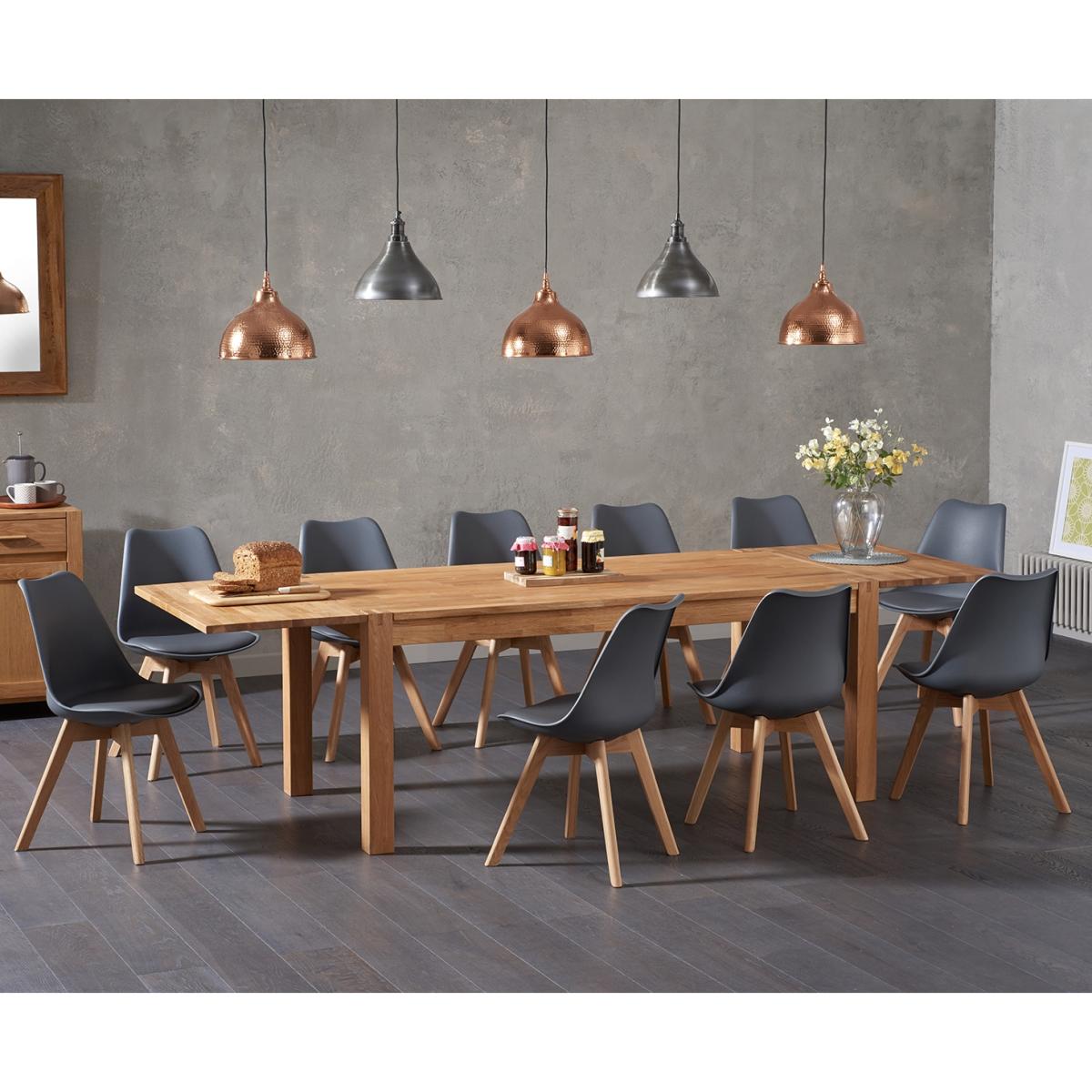 If you want a stylish dining set that doesn’t dominate the room but can still accommodate plenty of guests, you’d do well to consider the Verona 180cm Solid Oak Extending Dining Table with Duke Faux Leather Chairs. This extending solid oak dining set has a length of 270cm and comes with faux leather dining chairs in a choice of colours. The Verona extending table is perfect for those who don’t want the room dominated by a large table but still like to accommodate lots of guests. Starting at 180cm, it can easily be extended to 270cm thanks to its (separately stored) extension leaves, which are easily slotted onto the ends of the table and secured by butterfly screws. Plus, thanks to its creation from solid oak, reliable finger-jointed edges and smooth oiled finish, you can be assured that this table will last a lifetime. The Duke Faux Leather Chairs add a touch of contemporary style to this set. Boasting ergonomically moulded seats with comfortable seat pads upholstered in faux leather and supported by hardwood legs, these Scandi-style chairs are sure to become a firm favourite in your house. Choose from white, black, mink, light grey and dark grey.
