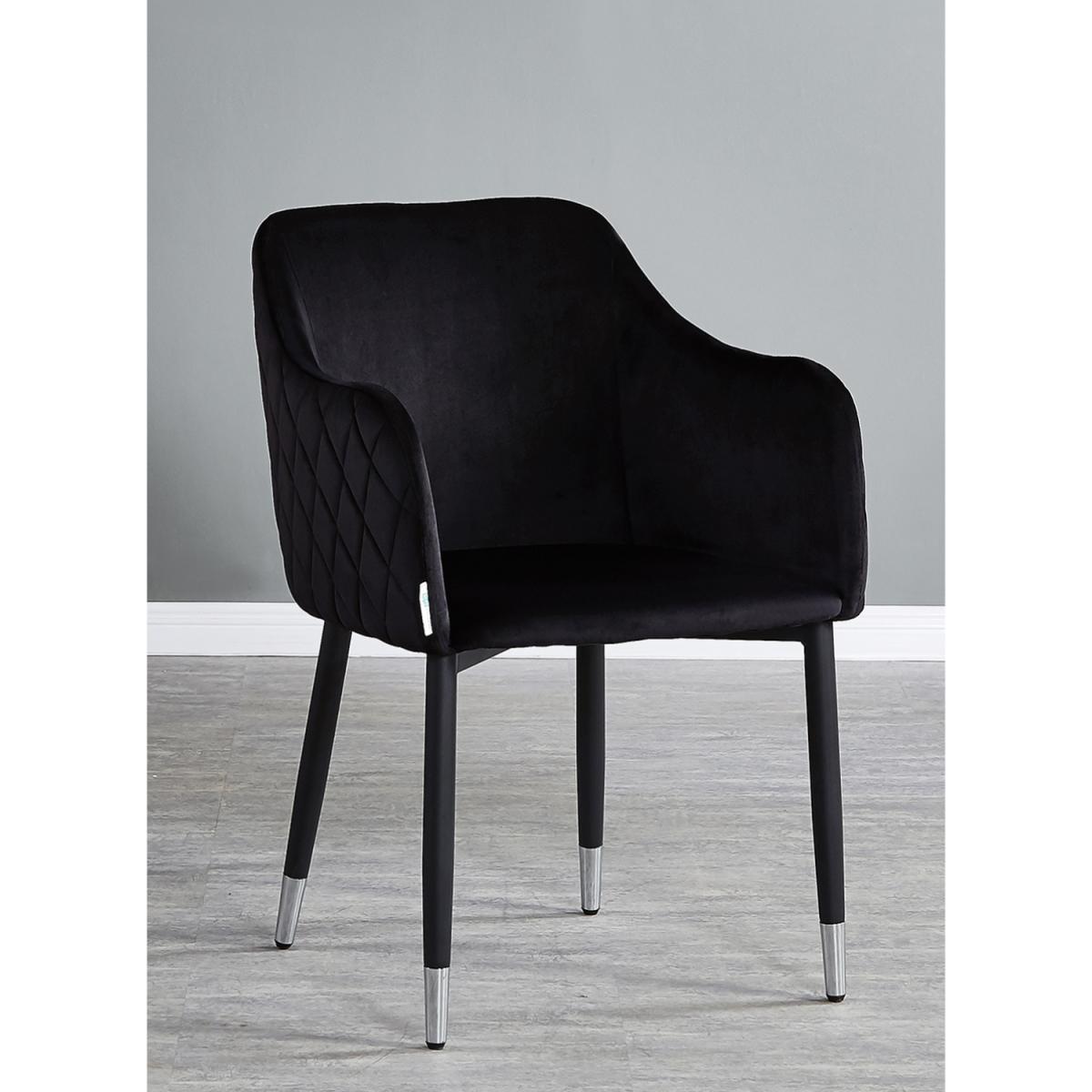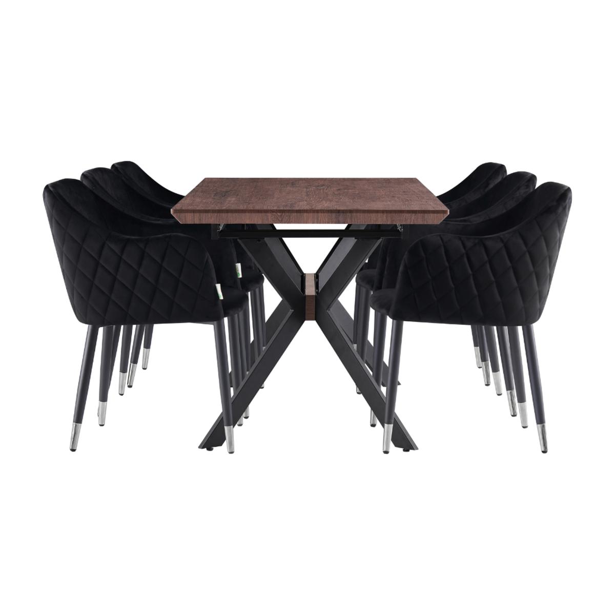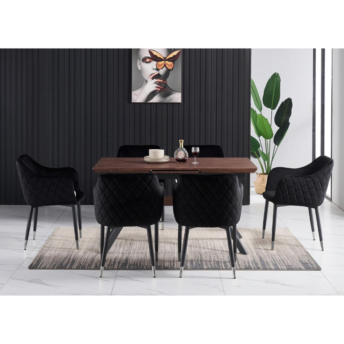 The Dining set includes a sleek designed Blaze Rectangle Dining Table that nods to the evergreen aesthetic and functionality of iconic mid-century modern furniture. Simply pull the table ends apart and an extra leaf pops into place allowing you to seat six with ease. The base is the sculptural cross-shaped design of legs in black powder-coated MDF. The table comes with fabulous velvet upholstered chairs that have an ergonomic design, unmistakable style, and comfy seats. The gorgeous diamond stitching on the exterior of the chair combined with the elegant arms creates an inviting and timeless design. The dining Chairs come with adjustable feet for added stability, perfect for uneven surfaces.