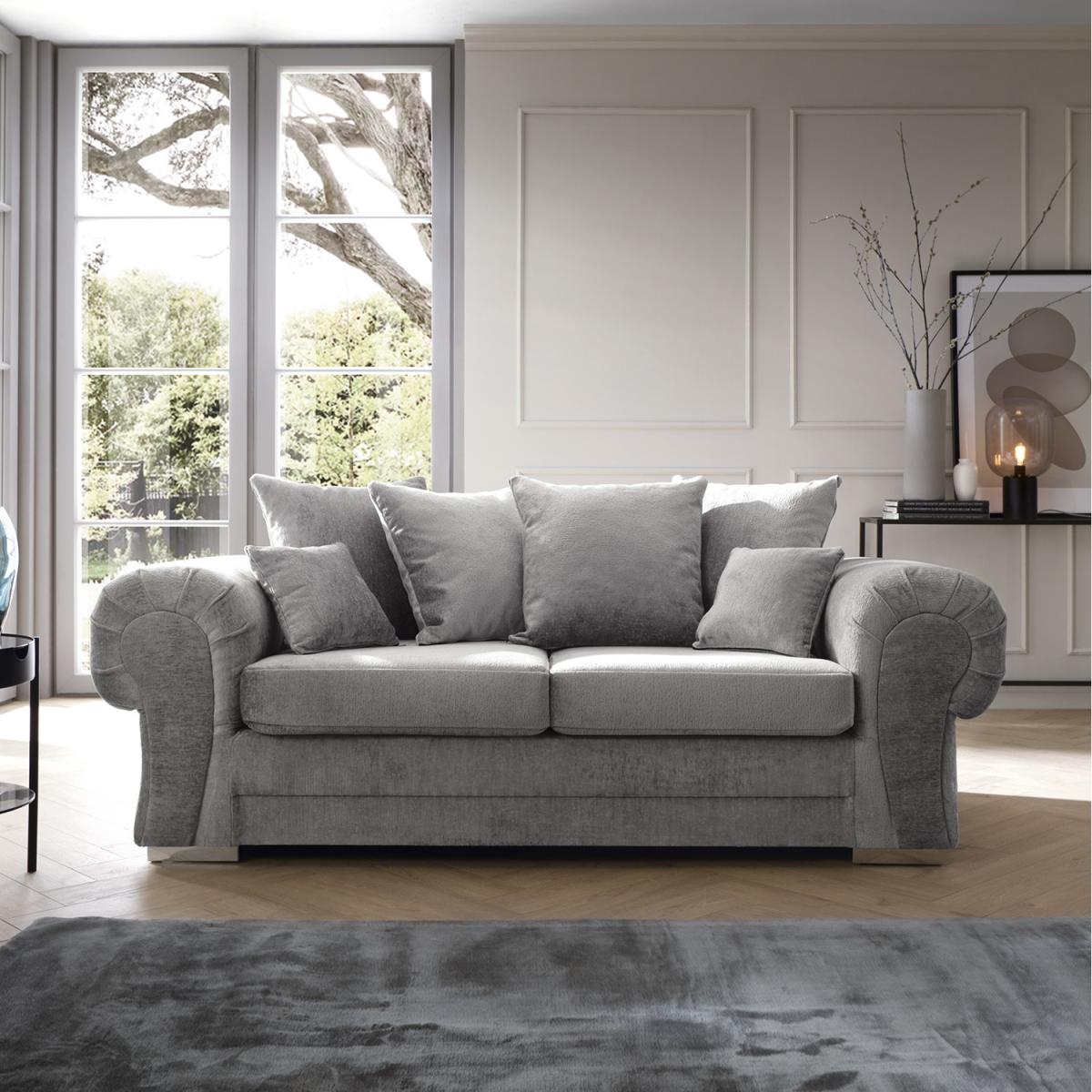 A beautiful soft chenille 3-seater sofa with a luxurious finish. The Verona collection features a classic and timeless button-tufted design on its scroll arms. A classic twist on otherwise modern sofa, this feature makes the Verona an elegant and sophisticated choice. Chenille is durable and easy to clean. Legs have an elegant chrome effect finish making the sofa look very modern and incredibly light. Fibre filled back cushions provide comfortable support and deep foam filled slab seats rest upon a solid wood plinth base. An excellent addition to your living room that is made to last.