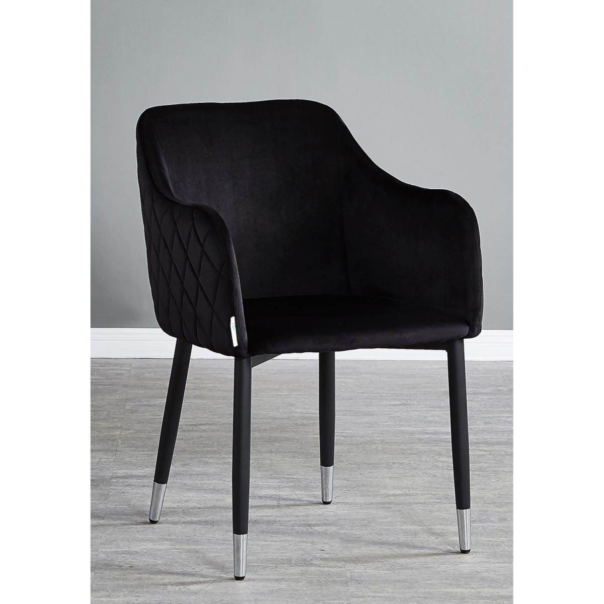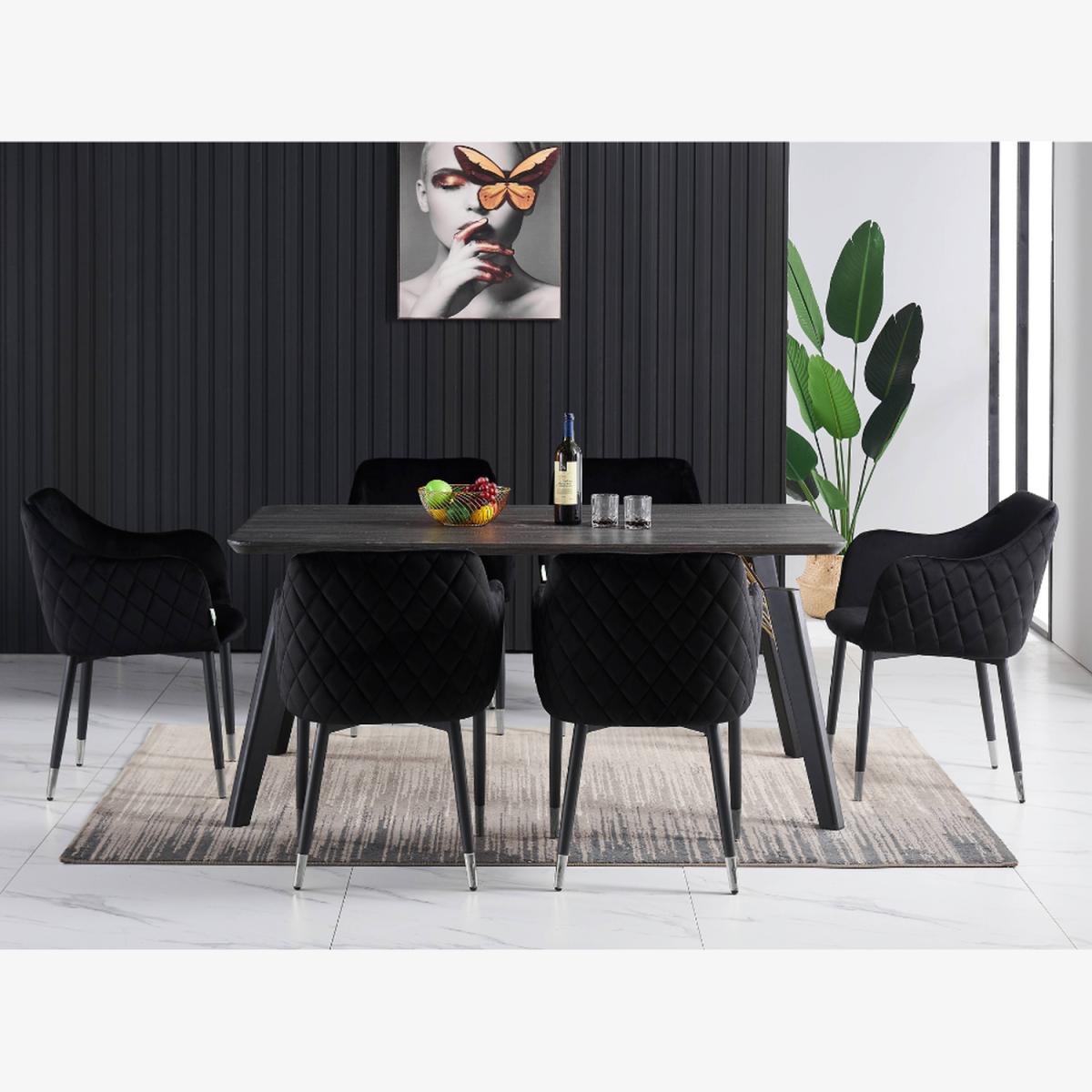 The Dining set includes a Cosmo LUX Rectangle Dining Table that has been designed with precision and a luxury finish to deliver an amazing dining experience. The sleek design of this table is giving it both functionality and a modern look with a touch of a rustic home feel. The wooden look of the top gives it a warm rustic feel while the black metal legs with a gold chrome frame bring the modern feel. The table comes with fabulous velvet upholstered chairs that have an ergonomic design, unmistakable style, and comfy seats. The gorgeous diamond stitching on the exterior of the chair combined with the elegant arms creates an inviting and timeless design. The dining Chairs come with adjustable feet for added stability, perfect for uneven surfaces.
