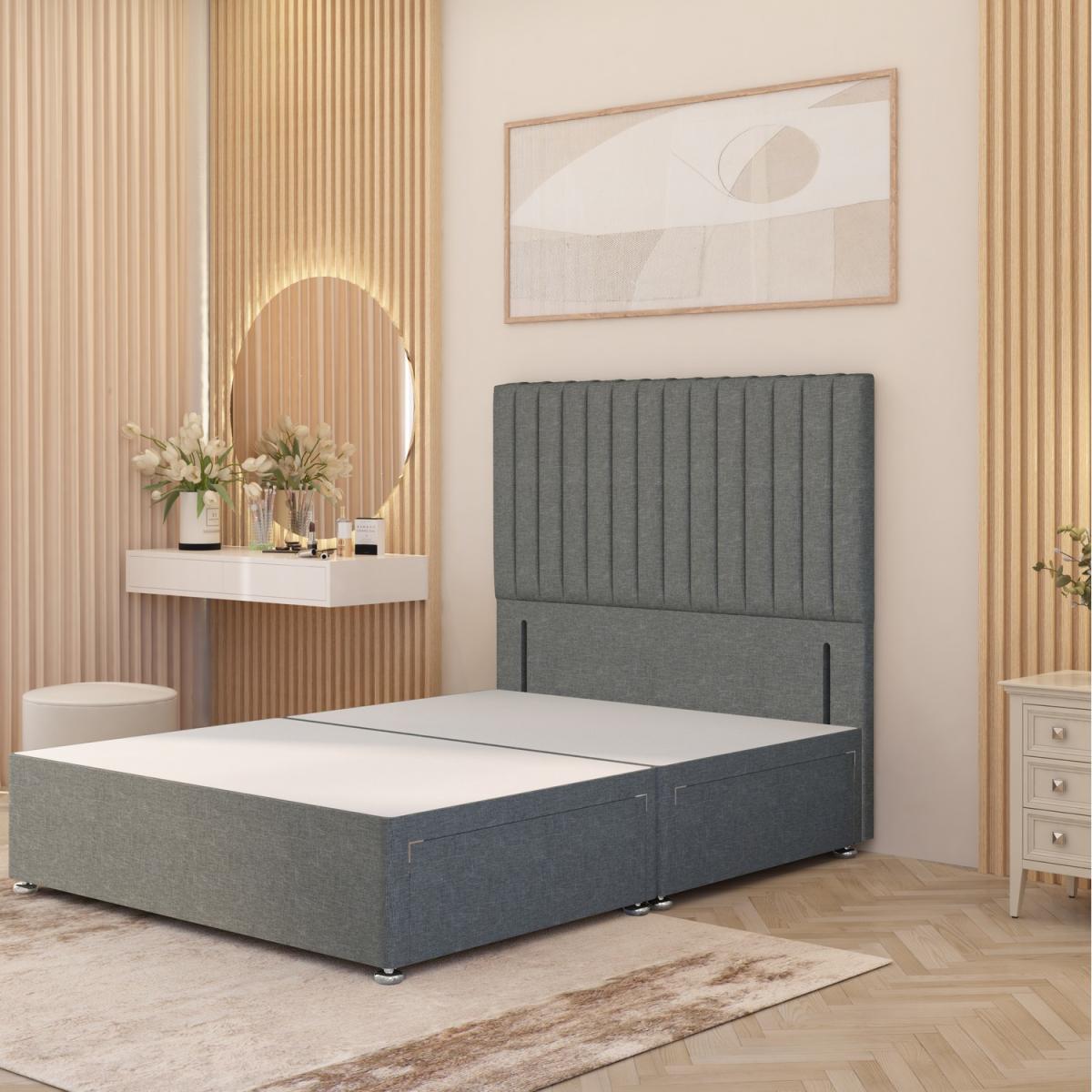 The Verona Divan Bed Base with Floor Standing Upholstered Headboard combines luxury design with durable support. Its solid platform top base offers a firm, stable surface for your mattress, delivering better orthopaedic support compared to slatted frames. Expertly crafted in the UK from quality timber and upholstered in Linen fabric, it adds a refined touch to both classic and modern bedrooms. The matching upholstered Verona floor standing headboard features deep cushioned panels with hand-tufted vertical pannels creating a luxuirous ribbon like ripple effect, upholstered with the finest polyester foam to give a refined look, designed to transform your bed into a striking centrepiece of luxury. At 54"137 cm Tall, with a front panel height of 32"86cm, a floor standing headboard embodies grandeur, stability, and refined style. The base measures 34.5cm in height with gliders attached and is available in all standard UK sizes 2FT. 6 Small Single, 3FT Single, 4FT Small Double, 4FT. 6 Double, 5FT King, and 6FT Super King. Choose from practical storage options including No Drawers, 2 Drawers (same side), or 4 Drawers, making this Linen divan bed with headboard both stylish and functional.
