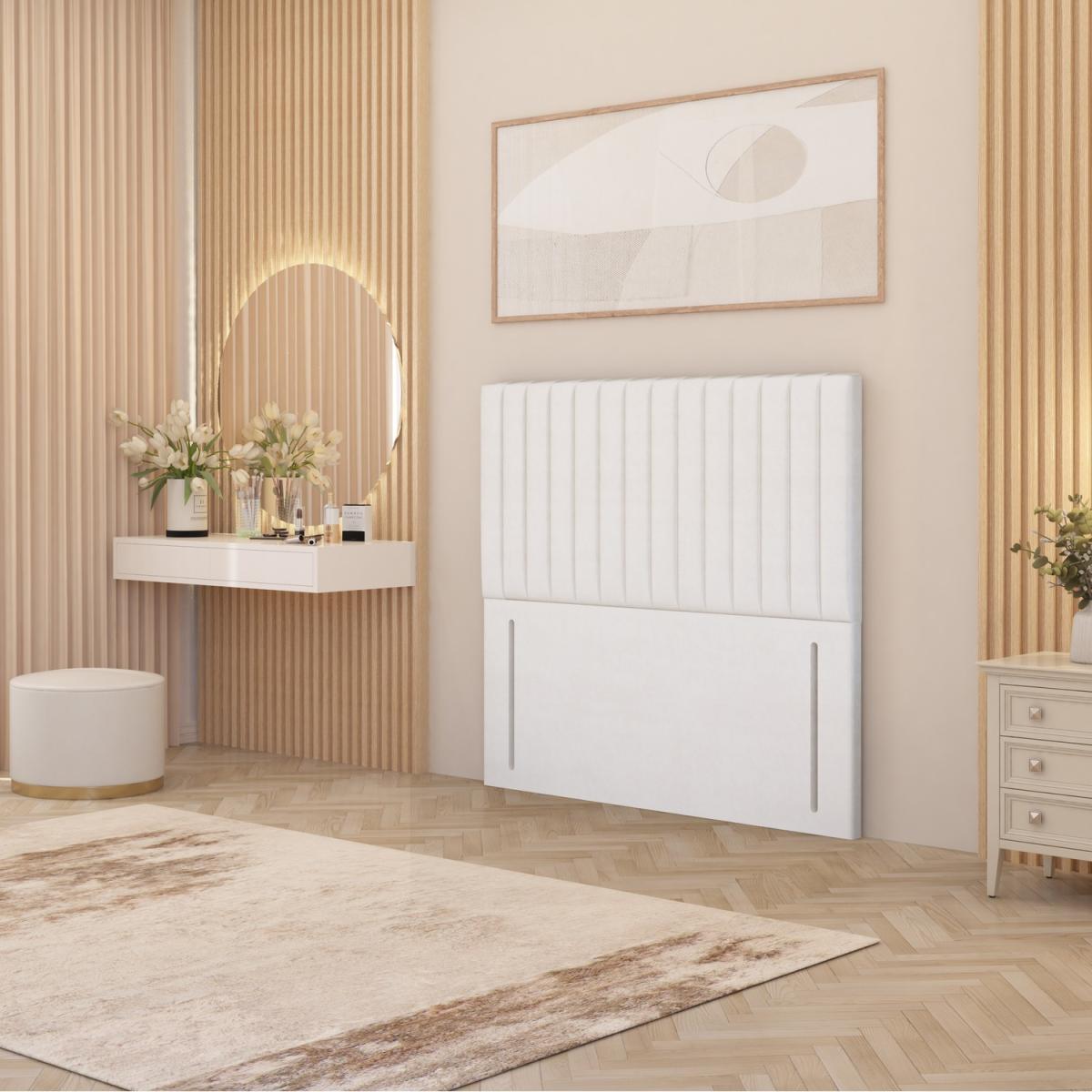 The Verona Divan Bed Base with Floor Standing Upholstered Headboard combines luxury design with durable support. Its solid platform top base offers a firm, stable surface for your mattress, delivering better orthopaedic support compared to slatted frames. Expertly crafted in the UK from quality timber and upholstered in plush velvet fabric, it adds a refined touch to both classic and modern bedrooms. The matching upholstered Verona floor standing headboard features deep cushioned panels with hand-tufted vertical panels creating a luxurious ribbon like ripple effect, upholstered with the finest polyester foam to give a refined look, designed to transform your bed into a striking centrepiece of luxury. At 54/137 cm Tall, with a front panel height of 32"/86cm, a floor standing headboard embodies grandeur, stability, and refined style. The base measures 34.5cm in height with gliders (30.5cm without) attached and is available in all standard UK sizes 2FT. 6 Small Single, 3FT Single, 4FT Small Double, 4FT. 6 Double, 5FT King, and 6FT Super King. Choose from practical storage options including No Drawers, 2 Drawers (same side), or 4 Drawers, making this velvet divan bed with headboard both stylish and functional.