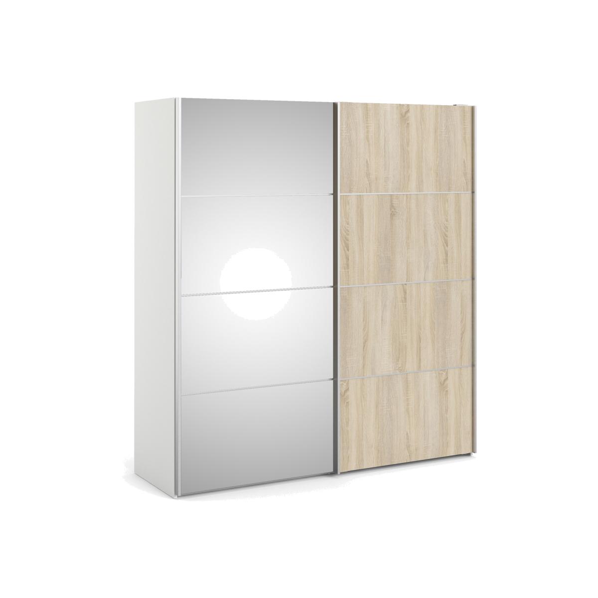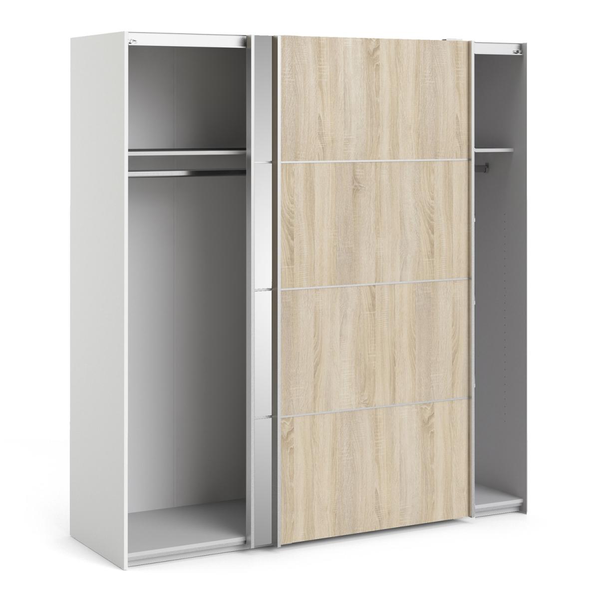 Features we love 2 door sliding wardrobe with 2 shelves and; 2 hanging rails. Minimalist grey frame detailing in a white and; oak finish. Space-saving sliding doors with smooth effortless opening Laminate board resistant to damage moisture and; high temp. Made from PEFC Certified sustainable wood All about me. Create a contemporary abode in your bedroom with this stylish wardrobe. It comes with two adjustable shelves and two hanging rails which can be positioned where you want giving you all the storage space you need. With double sliding doors one half fully mirrored not only does its reflection give you the illusion of space there’s no need for a separate mirror either. What’s more this stand-alone piece looks just like a fitted wardrobe. Beautifully made in Denmark. Other styles available in the Verona wardrobe range. Need to know. Overall dimensions. W182.4 x D59 x H200.4 cm Number of shelves. 2 Number of hanging rails. 2 Product weight. 129kg Colour. White and; light oak Finish. Mirrored and laminate board Material. Sustainable wood glass (mirror) and metal (frames / runners) For use. Indoors Includes. Anti-tilt strap for the wall Assembly required. Yes Please note Shelves are not adjustable above the rails (as shown in image)
