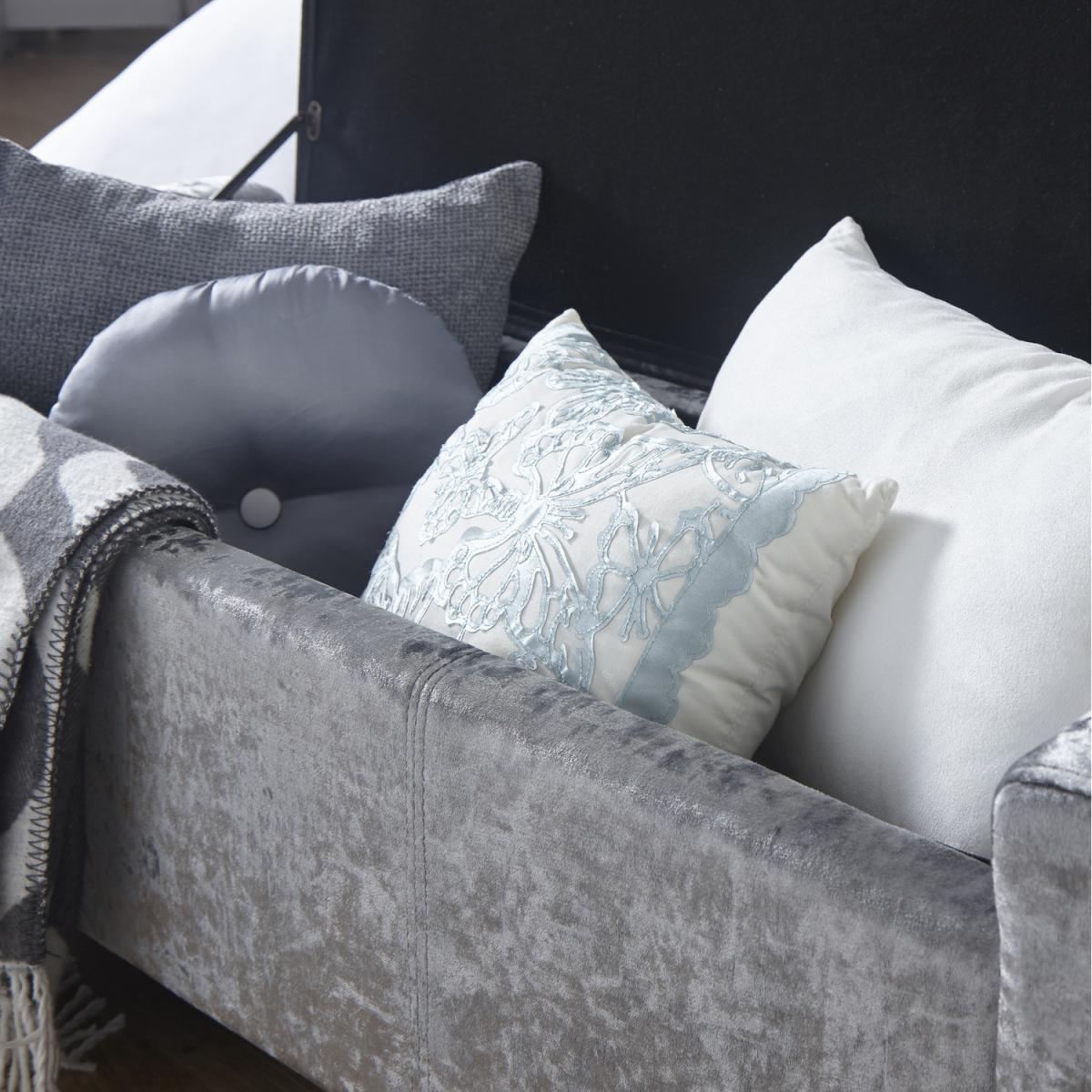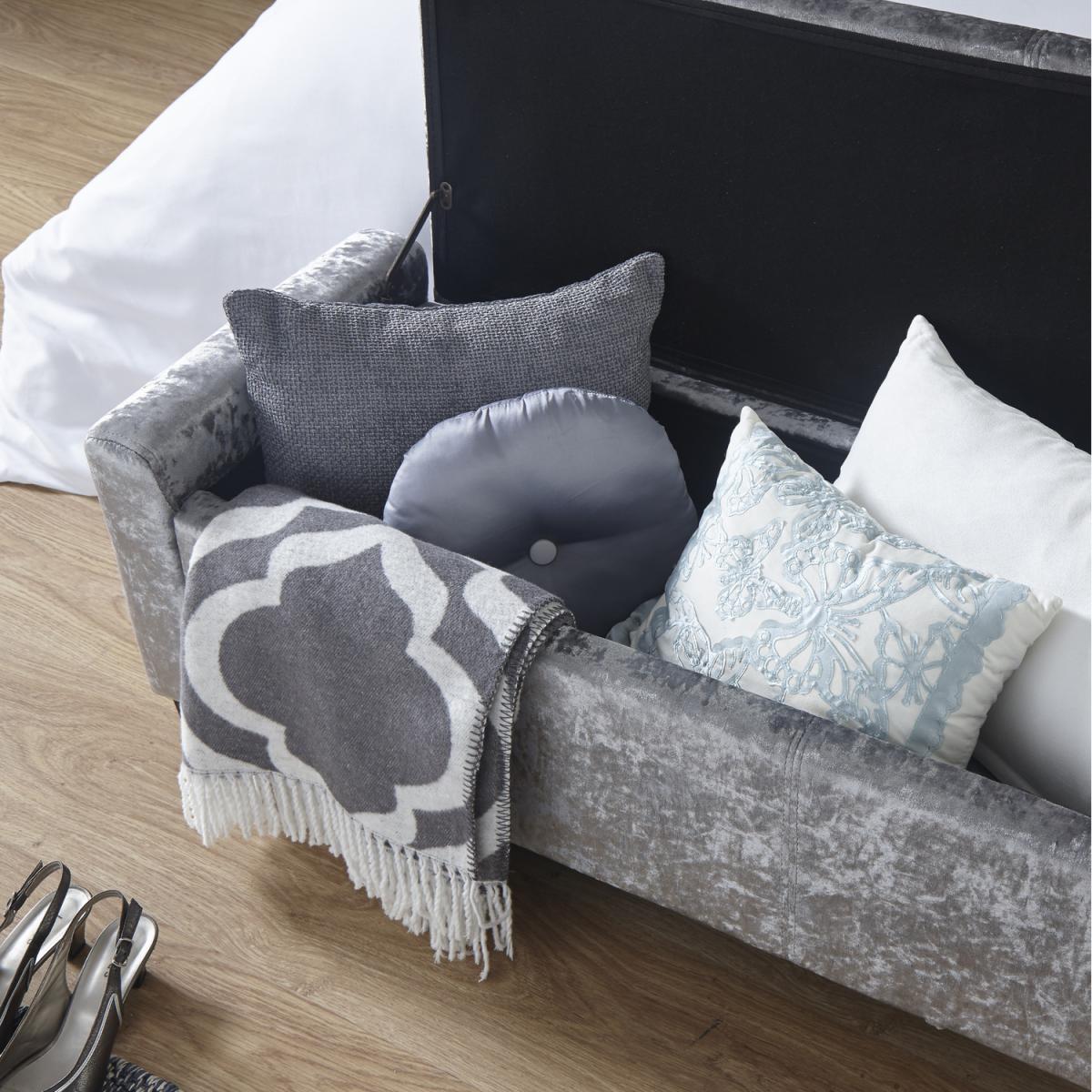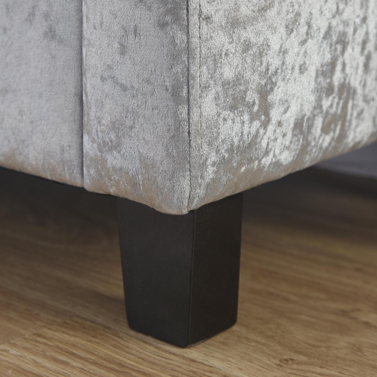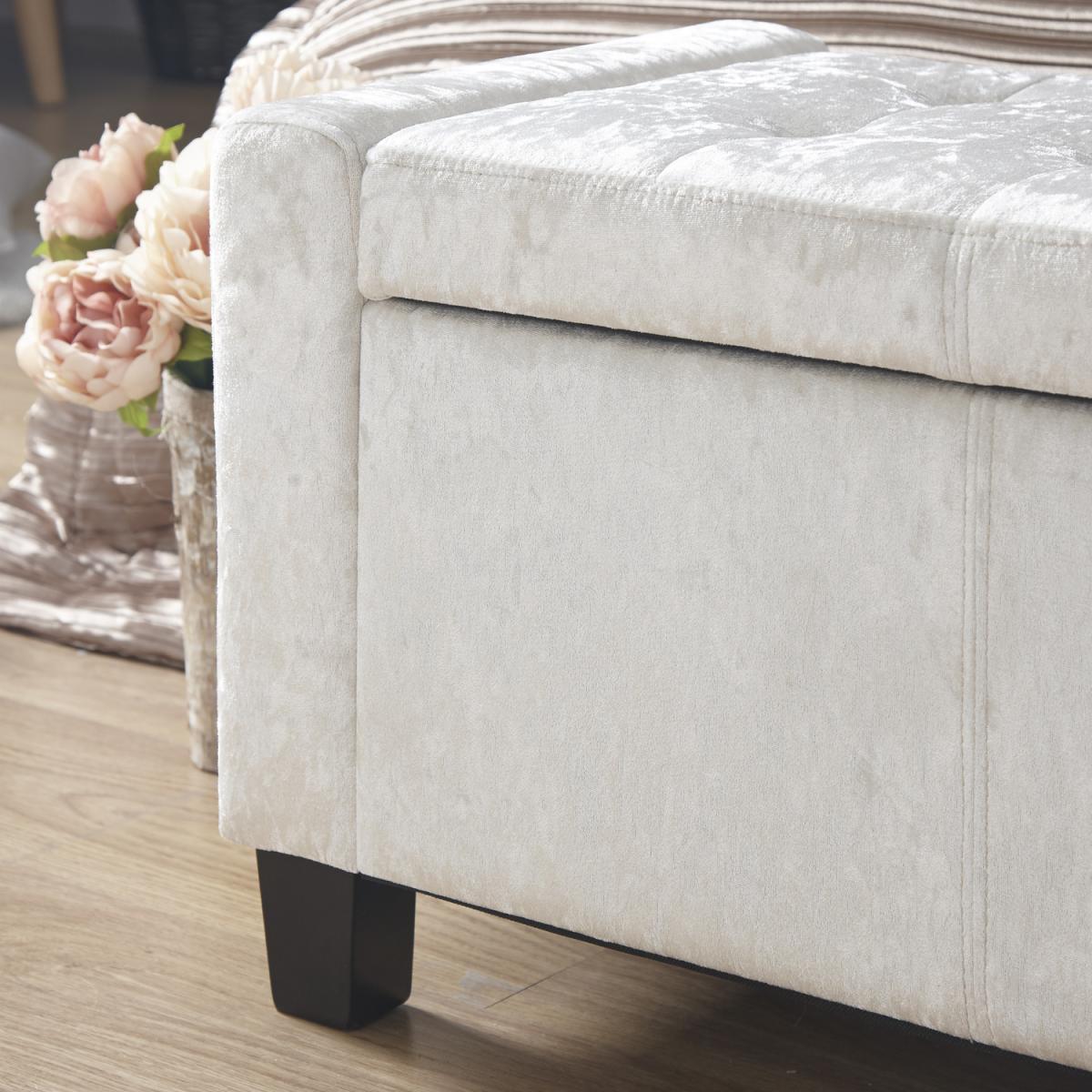 The Verona Upholstered Ottoman offers a simply stunning design. Featuring deep buttoned detailing on the lift-up lid, this ottoman is available in a luxurious silver or cream fabric finish. Ideal for those looking for a comfortable seating area where space may be limited. Crafted to an exceptionally high standard this ottoman comes complete with wooden feet. The seating area of the Verona Ottoman lifts up to reveal a spacious storage area that will help you to reduce the clutter in your home.