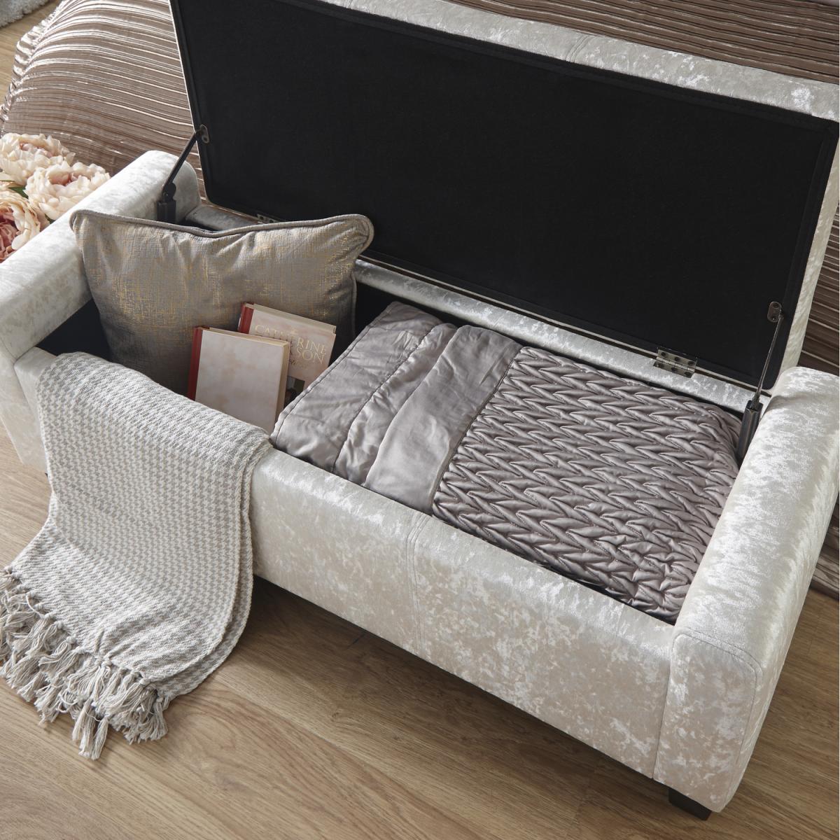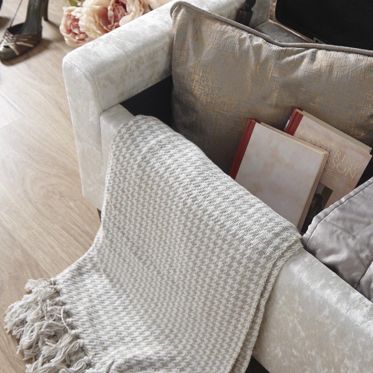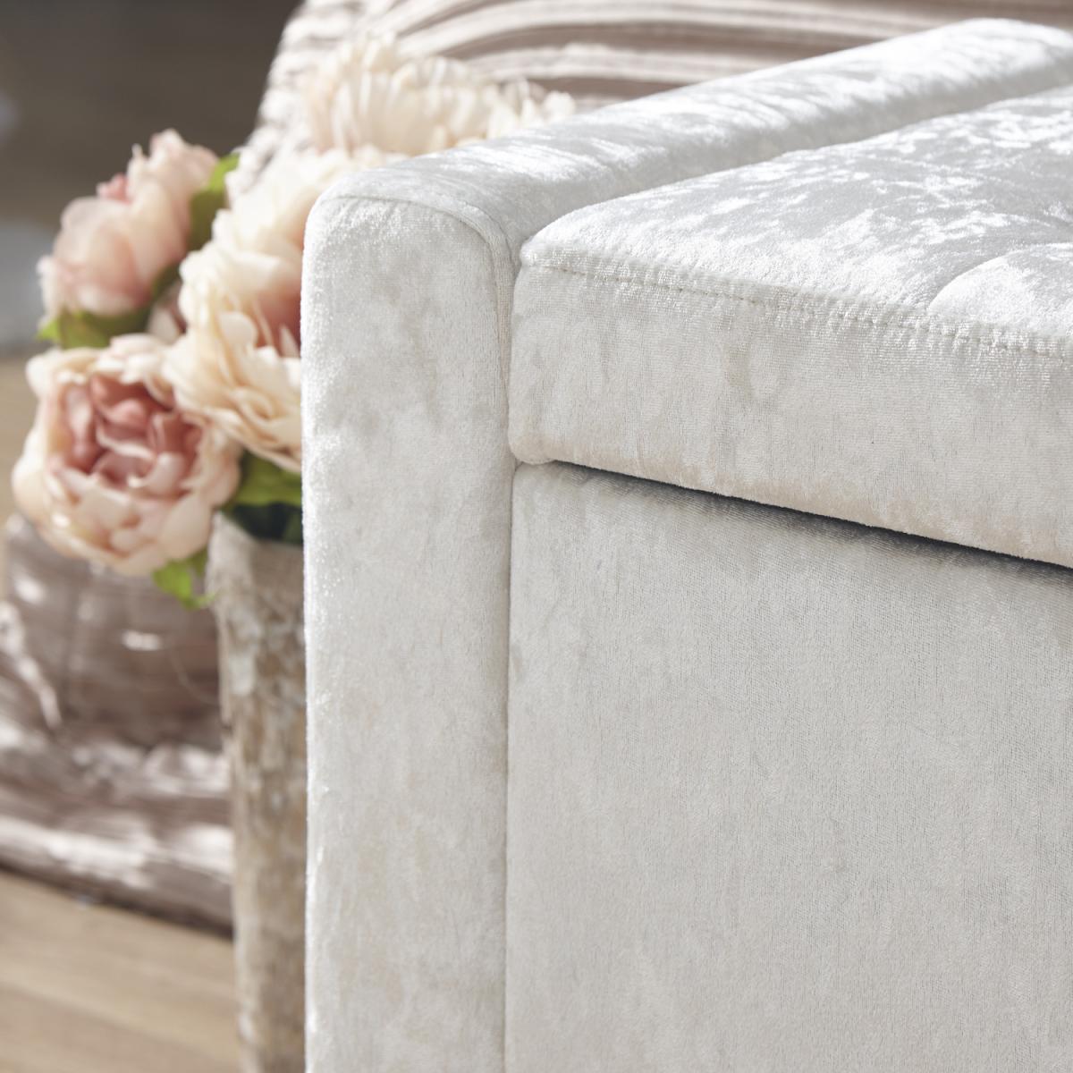 The Verona Upholstered Ottoman offers a simply stunning design. Featuring deep buttoned detailing on the lift-up lid, this ottoman is available in a luxurious silver or cream fabric finish. Ideal for those looking for a comfortable seating area where space may be limited. Crafted to an exceptionally high standard this ottoman comes complete with wooden feet. The seating area of the Verona Ottoman lifts up to reveal a spacious storage area that will help you to reduce the clutter in your home.
