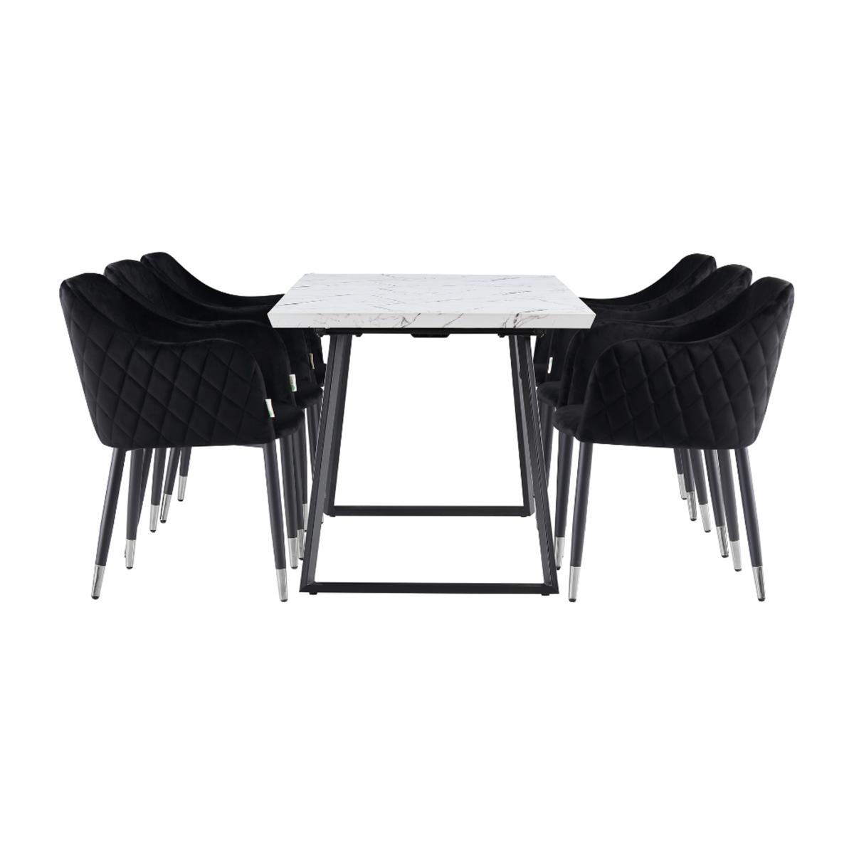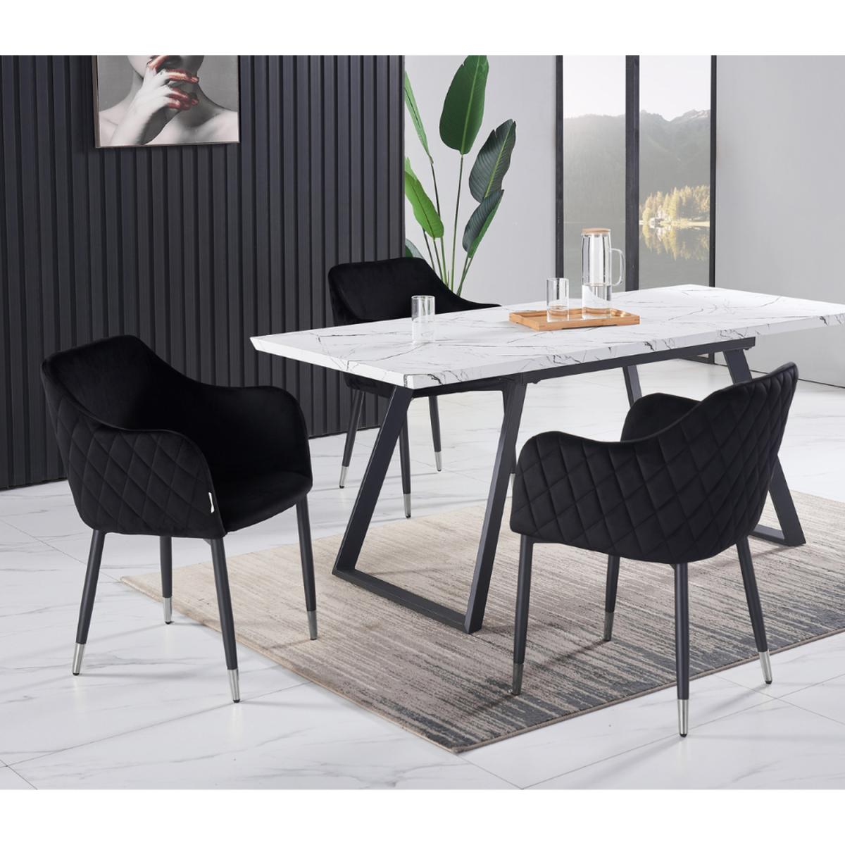 The Dining set includes a Toga Dining table that is extendable from 140 cm to 180 cm long giving you that extra space when you need it. Perfect whether it is a Traditional Dining set look or a Modern Dining Set look you are after. The table is supported by metal legs that provide not just sturdy support but a stunning and unique design that will get your guests talking. The table comes with fabulous velvet upholstered chairs that have an ergonomic design, unmistakable style, and comfy seats. The gorgeous diamond stitching on the exterior of the chair combined with the elegant arms creates an inviting and timeless design. The dining Chairs come with adjustable feet for added stability, perfect for uneven surfaces.