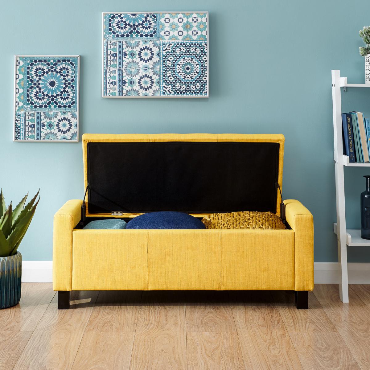 Keep your home tidy and stylish with this charming Ottoman Storage Bench. Featuring a high quality hopsack fabric in a striking mustard, this practical piece of furniture has a sleek modern design that’s sure to complement any contemporary interior.