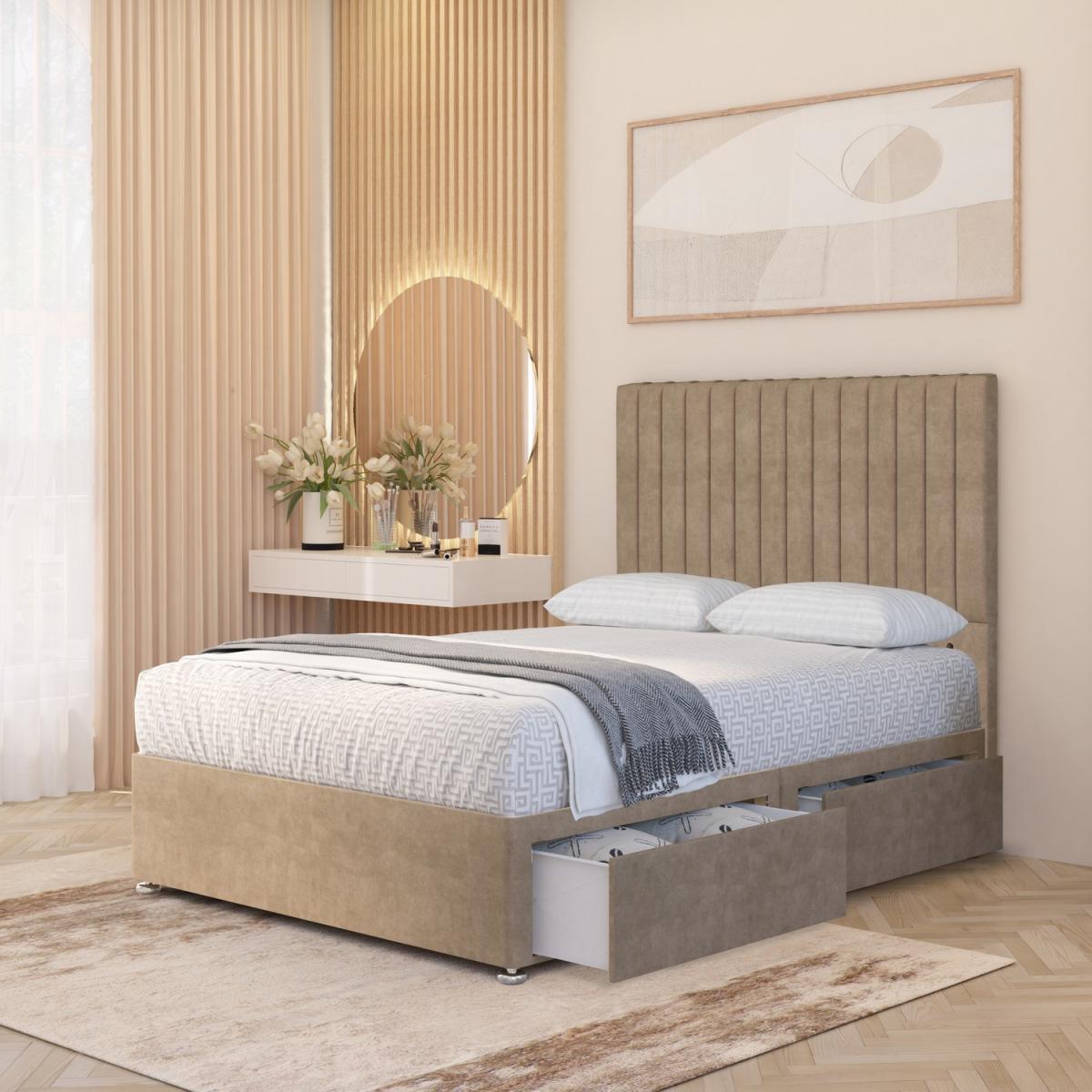 The luxurious Verona Divan Bed Set includes a high-grade divan base with a solid platform top, providing long-term durability and the best surface for your mattress. Paired with a 54" upholstered floor standing headboard and our premium 30cm deep Pacific 4000 Memory Foam Pocket Spring Mattress, this set combines comfort, style, and support. The pacific mattress allows you to sink in slightly and then offers medium firm cushioned support. Engineered for superior comfort, this mattress features a high count of pocket springs that respond individually to body weight, with firmer edge springs for enhanced support and stability. The 7-zone system targets shoulders, hips, and back to reduce pressure and improve posture. Three foam layers - memory foam, reflex foam, and polyester foam - combine to contour to your body, add bounce-back resilience, and provide a cushioned surface for deeper, undisturbed sleep. The quilted soft touch mattress cover offers an even surface to sleep on to support your whole body. The elegant floor standing headboard elevates this bed set and brings everything together, guaranteed to make a statement of luxury in your bedroom, hand crafted with vertical sectioned cushioned panels. Chose from a No draw divan bed, 2 draw divan bed, or 4 draw divan bed, all with mattresses included. This option bed comes with 2 easy access storage drawers. Headboard can be placed in either end of the base, so you can either have both drawers facing on the right side, or left side.