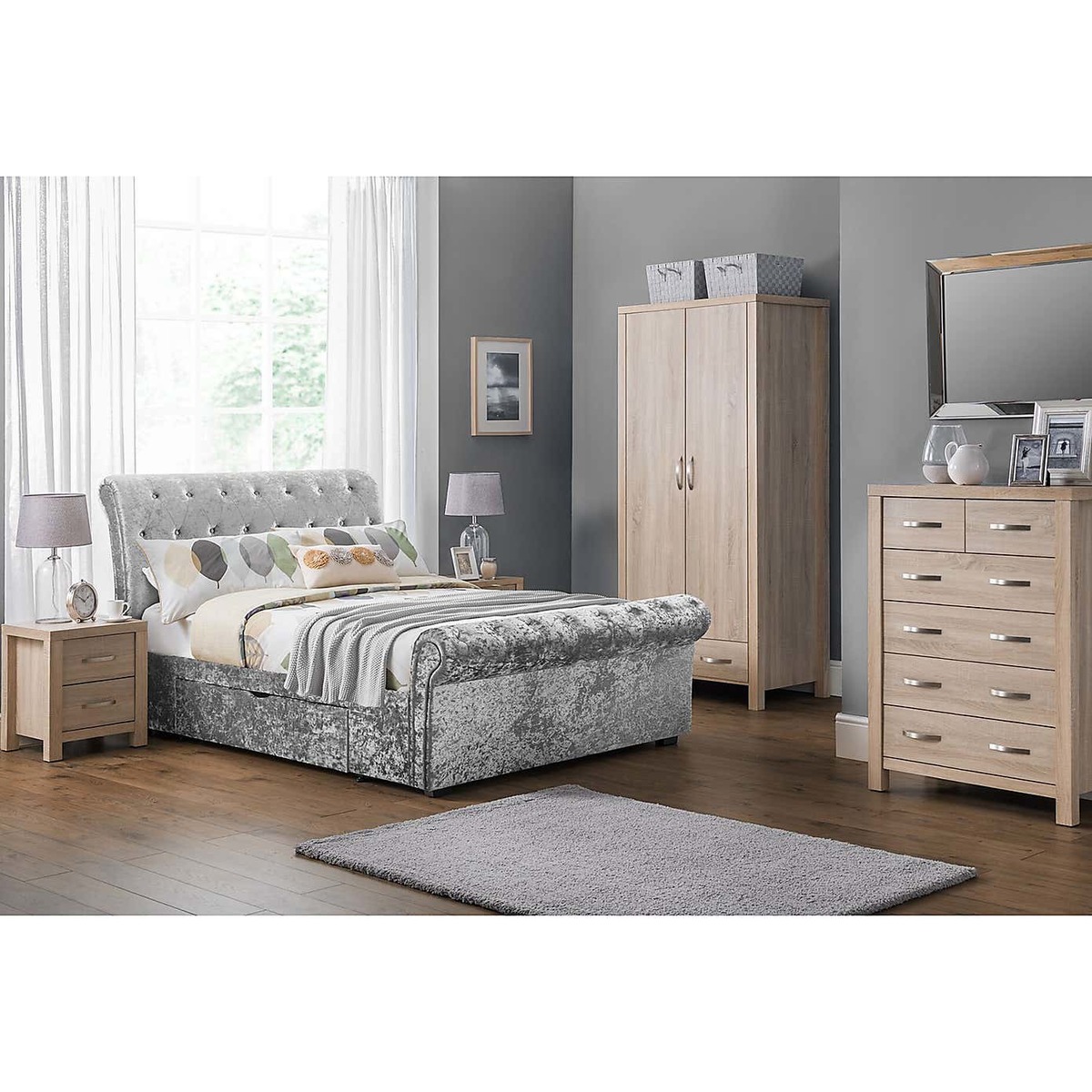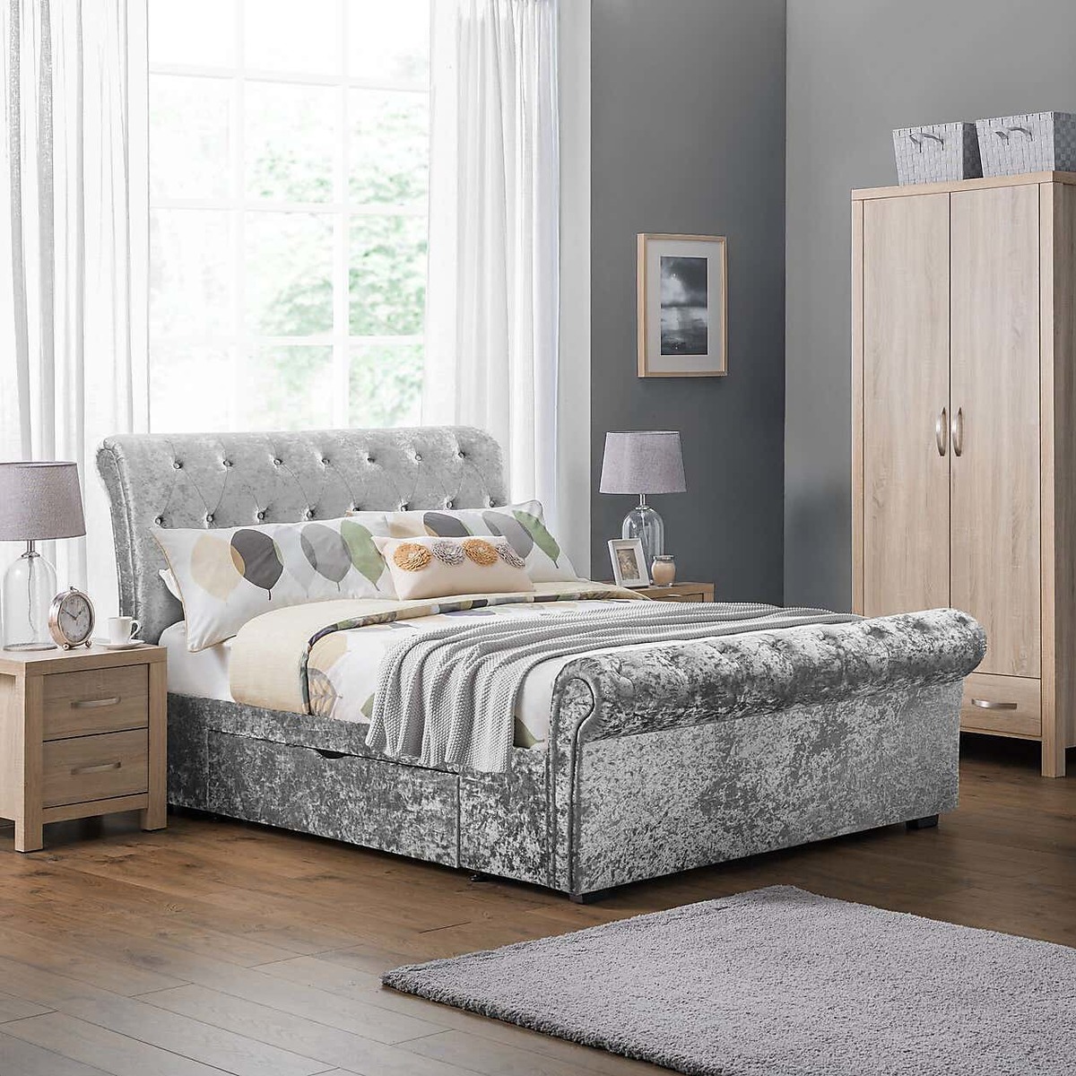 Upholstered in sumptuous silver crushed velvet, the Verona Velvet Bed Frame is a striking sleigh bed featuring an eye-catching deep buttoned headboard and matching footboard. Two large underbed drawers offer a generous amount of storage space, whilst a sprung slatted base ensures extra comfort and prolonged mattress life. Please note: Price is for bed frame only and does not include mattress. Please note, unfortunately we cannot deliver this item to the Channel Islands.