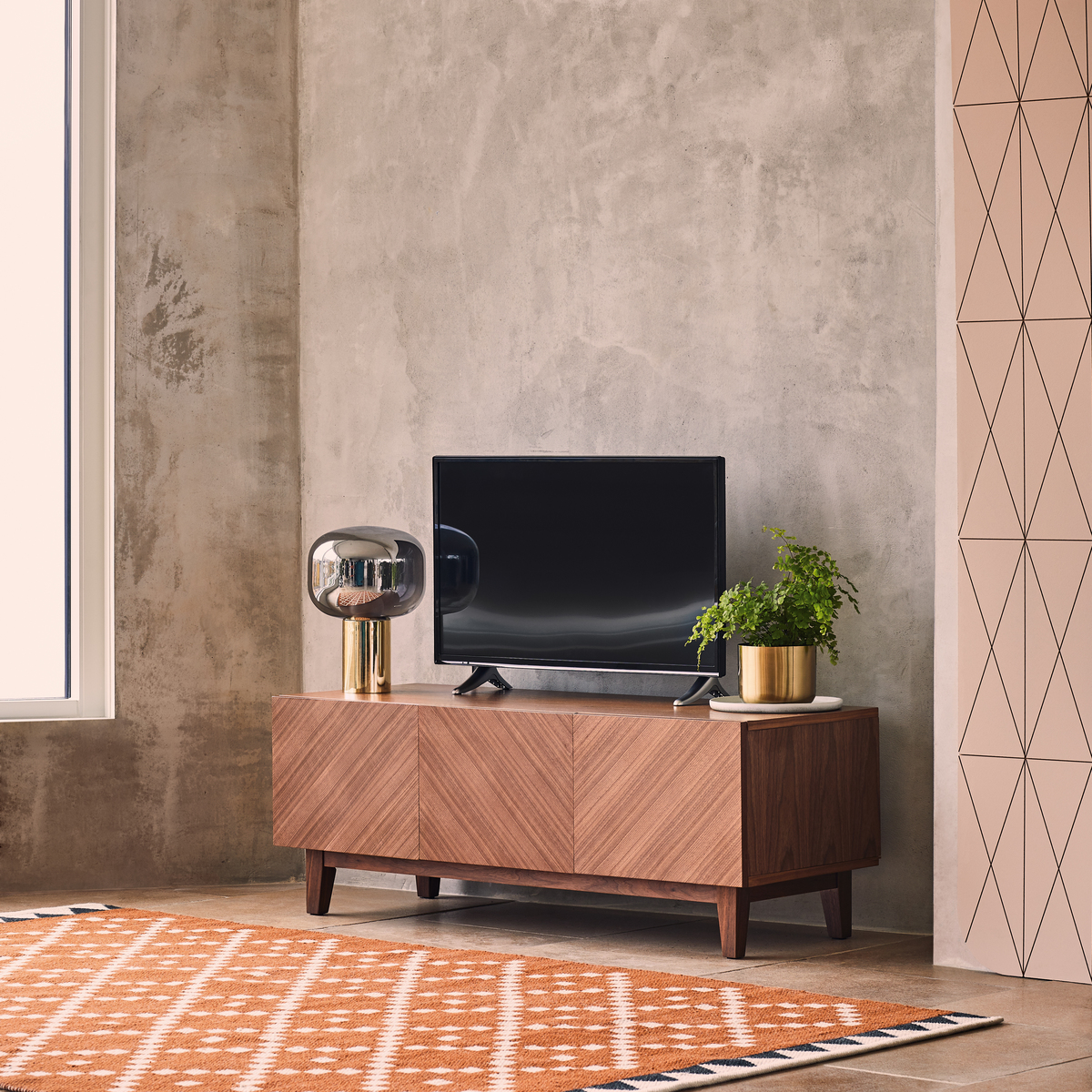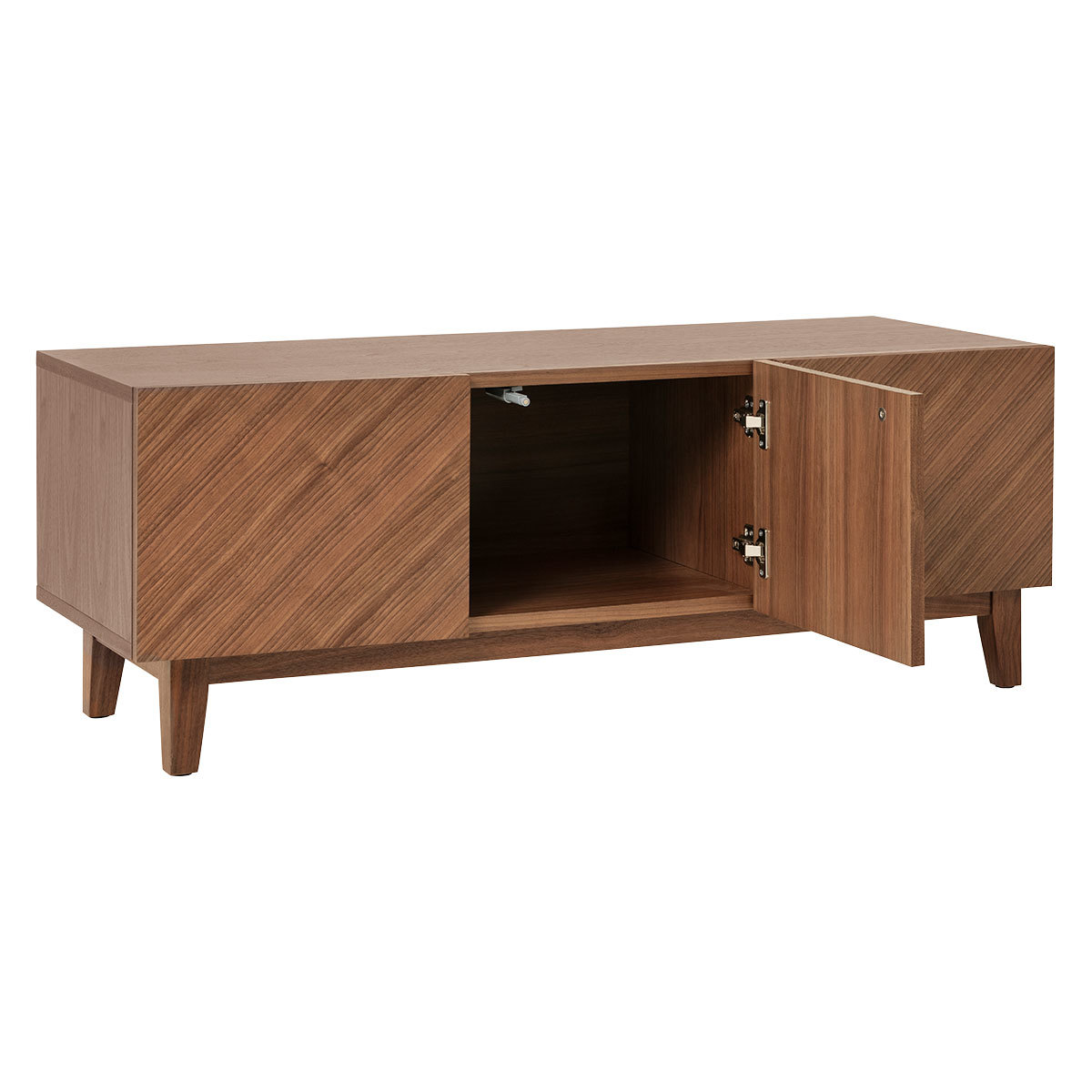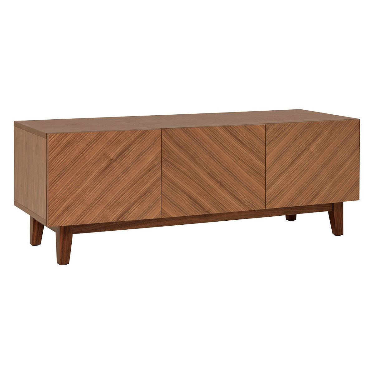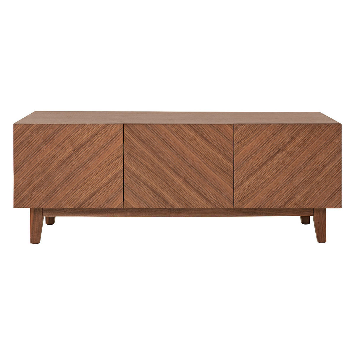 The Verona brown 3 door walnut veneer TV stand is a functional yet stylish piece of furniture that provides ample storage space for DVDs and accessories. An original design by Habitat, the walnut veneer silhouette features 3 doors with valuable storage space within to keep your home organised and clutter free. It’s finished with push close mechanism doors and tapered legs for a lightweight touch. With a statement herringbone pattern, the sleek design is finished with a lacquer to add a rich finish to the design. Part of the Verona range, a 4 door TV stand is available alongside bedroom furniture pieces.