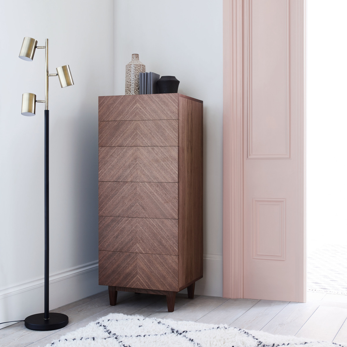 The Verona walnut tall 6 drawer chest is a luxurious piece with a statement herringbone pattern in figured walnut veneer. With a contemporary shape and deep, push-close drawers, the sleek design brings the wood's appealing warm hues up to date. The chest is part of the Verona bedroom furniture range.