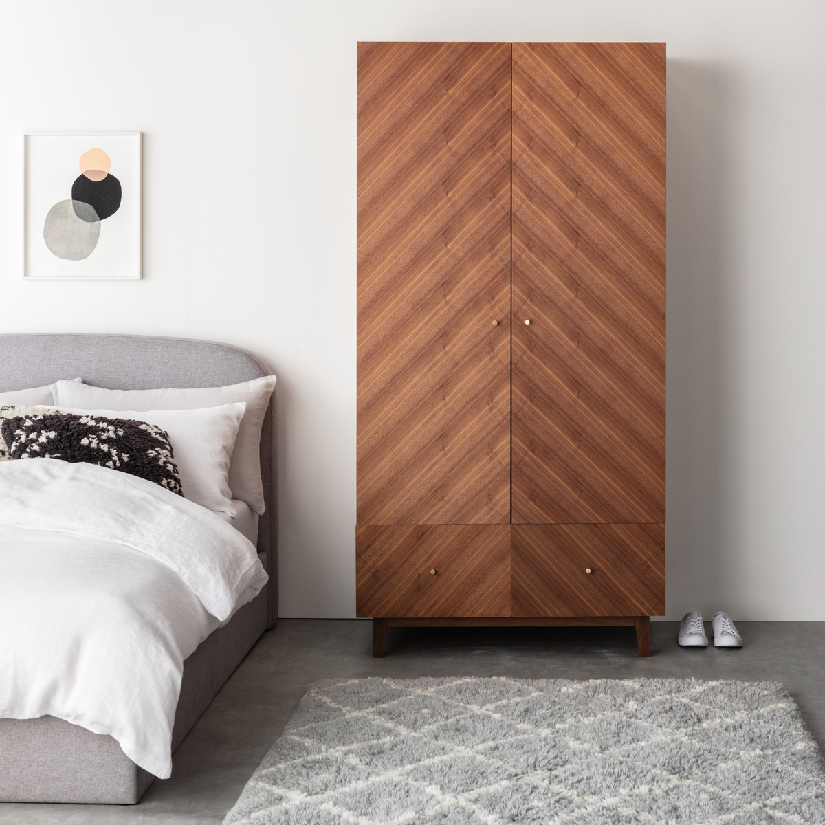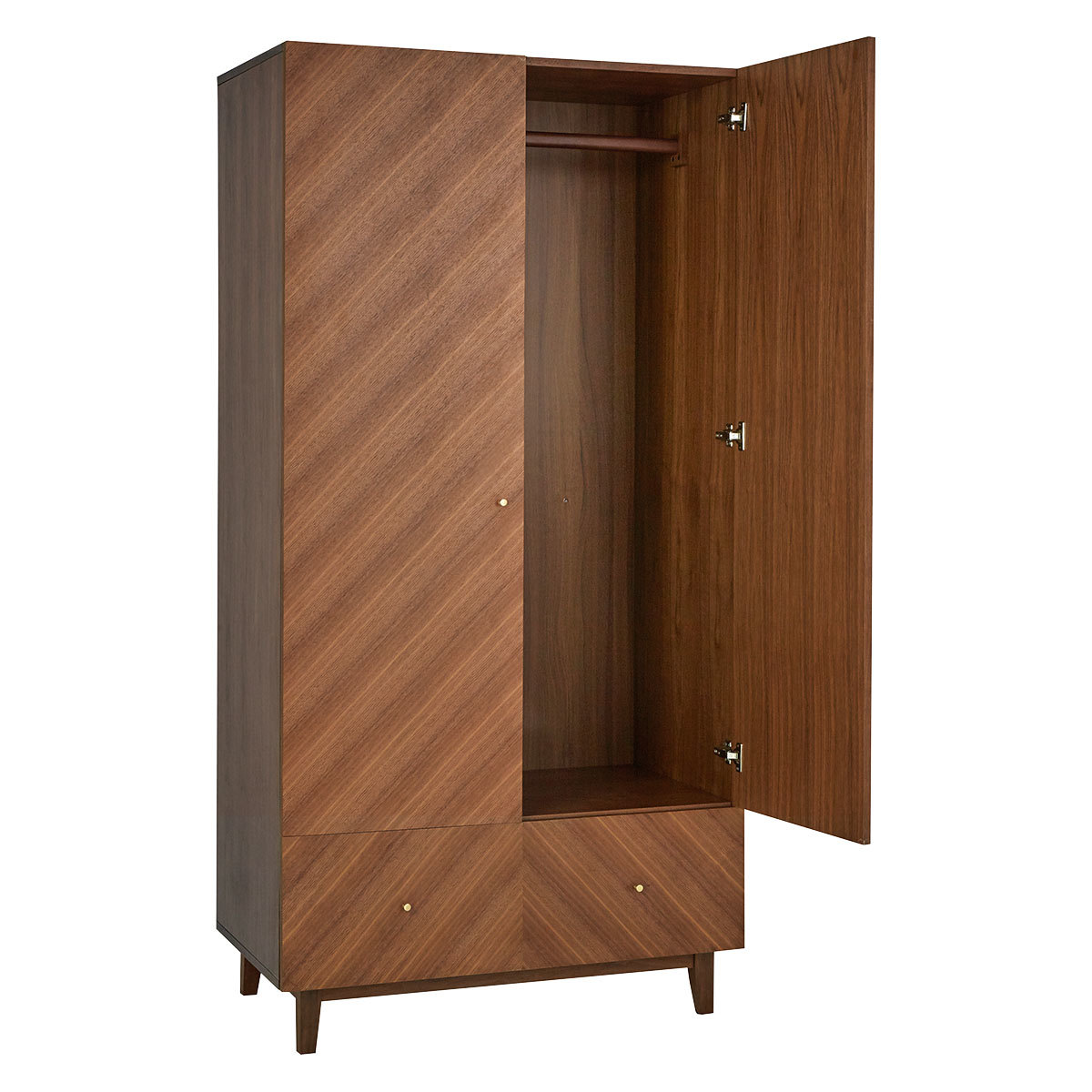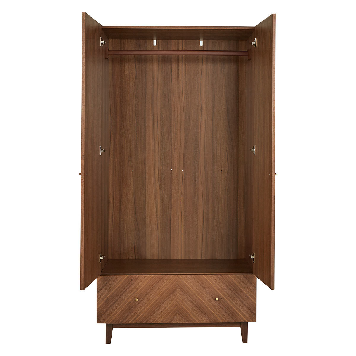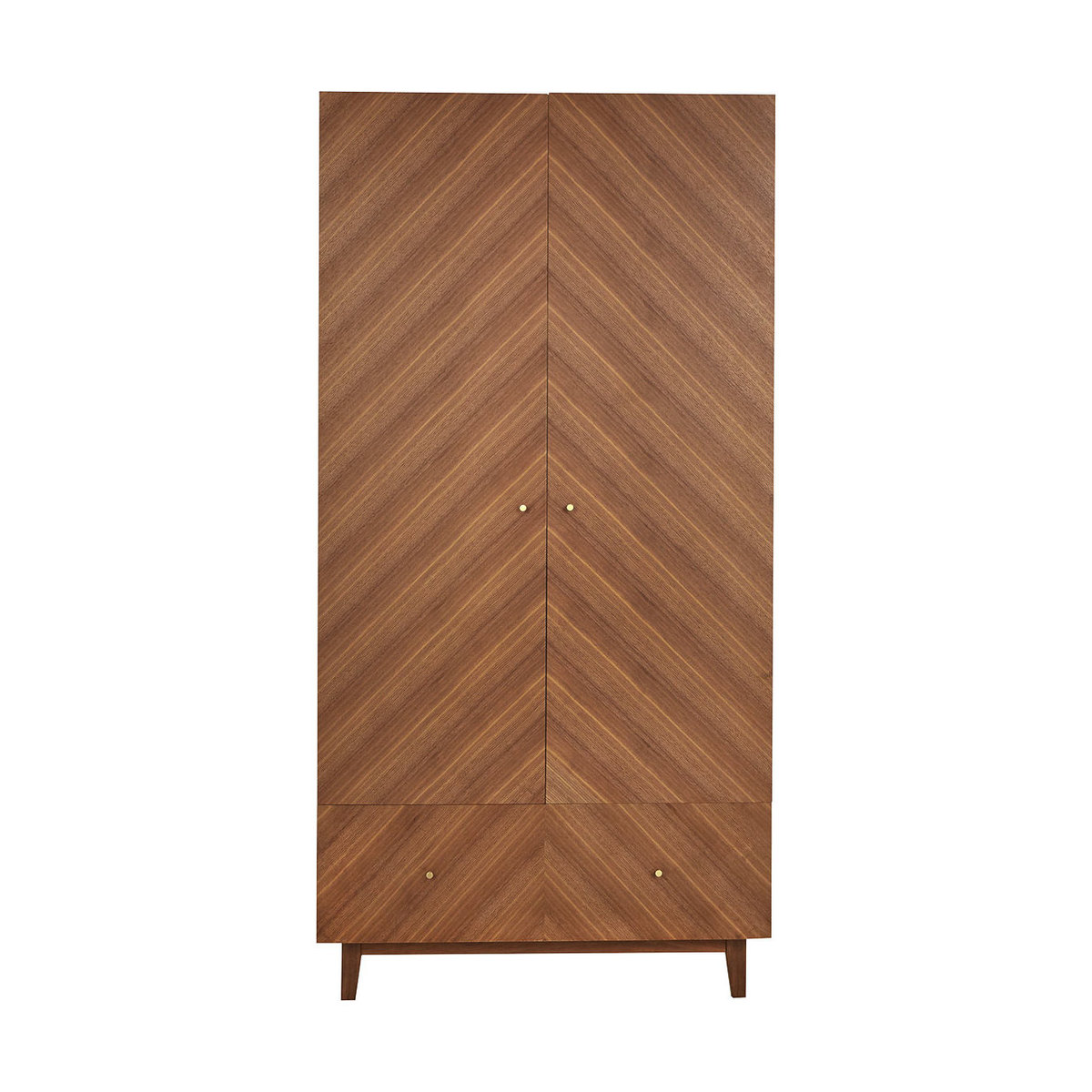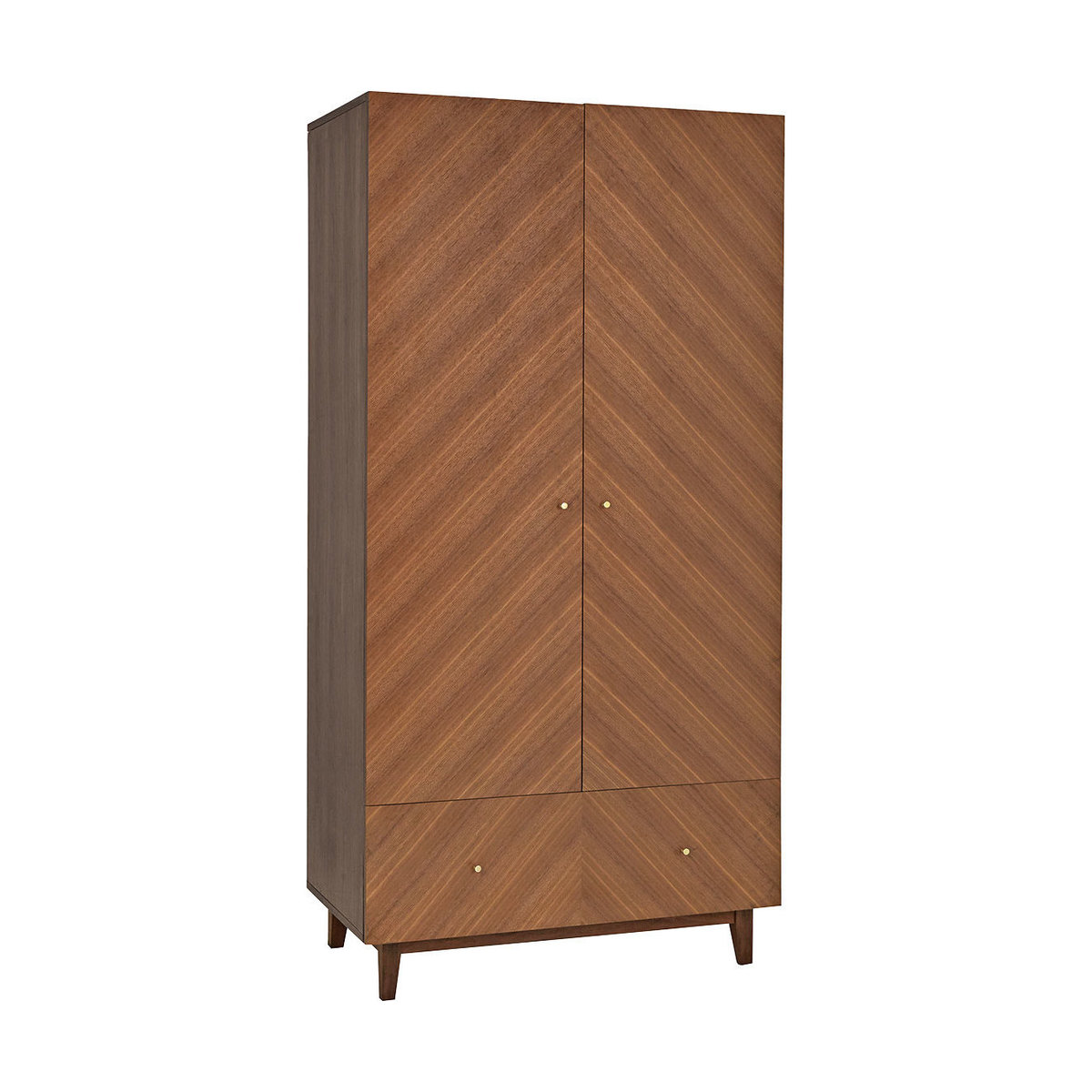 The Verona walnut veneer 2 door wardrobe is a functional yet stylish piece of furniture that provides ample storage space for clothing. An original design by Habitat, this wardrobe offers a spacious interior with hanging space, a bottom shelf for folded clothes, as well as a generous drawer underneath. With a statement herringbone pattern, the sleek design is finished with a lacquer to add a rich finish to the design. Tapered legs and brass handles provide a luxe final touch. Pair the wardrobe with other matching pieces in the Verona collection.