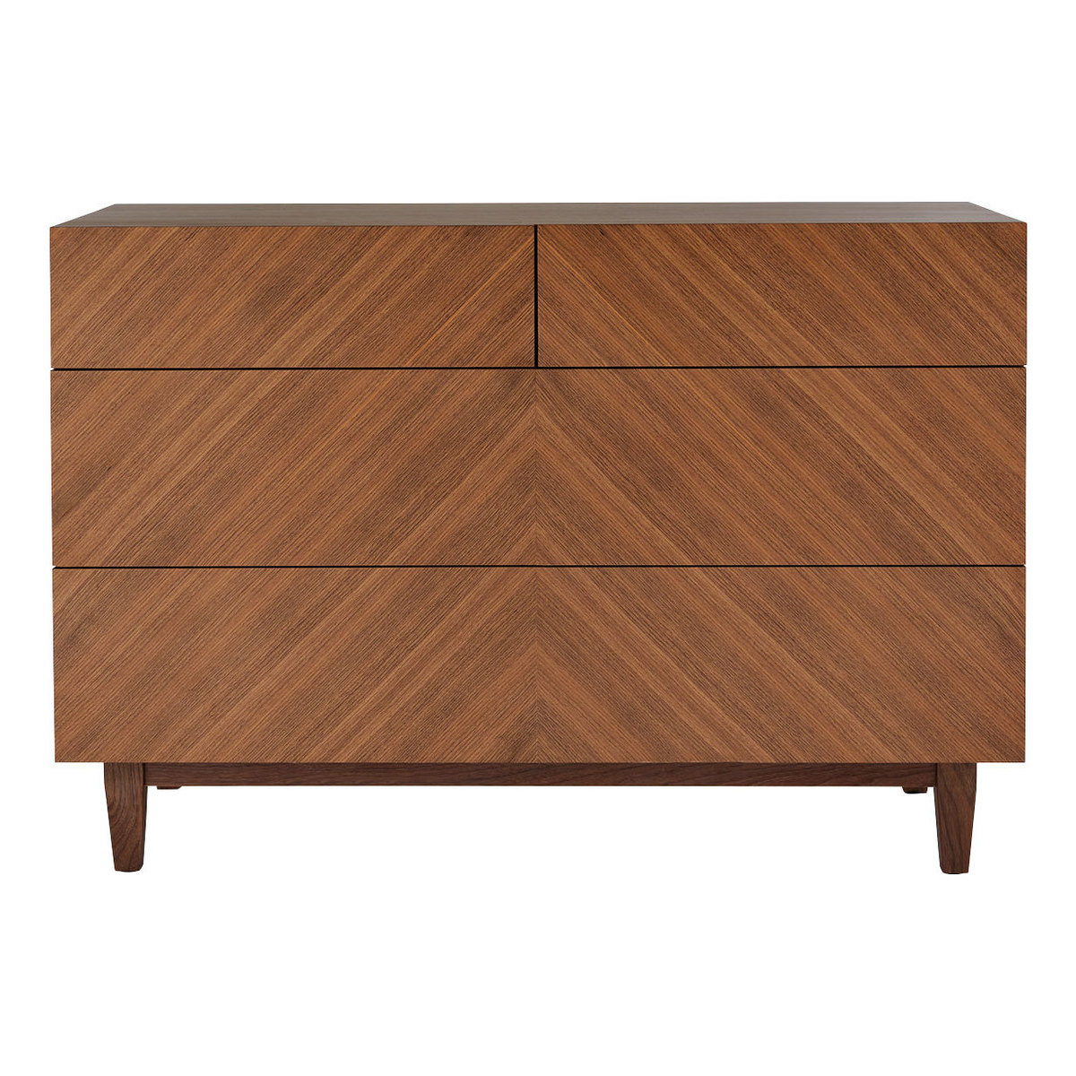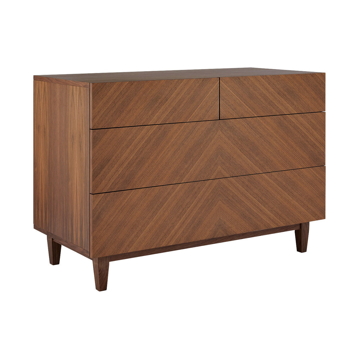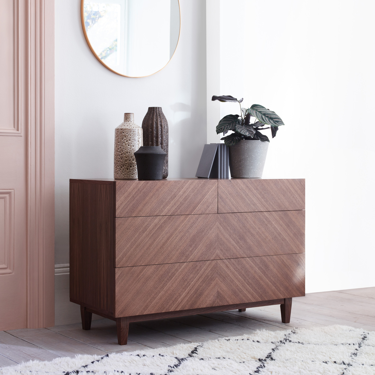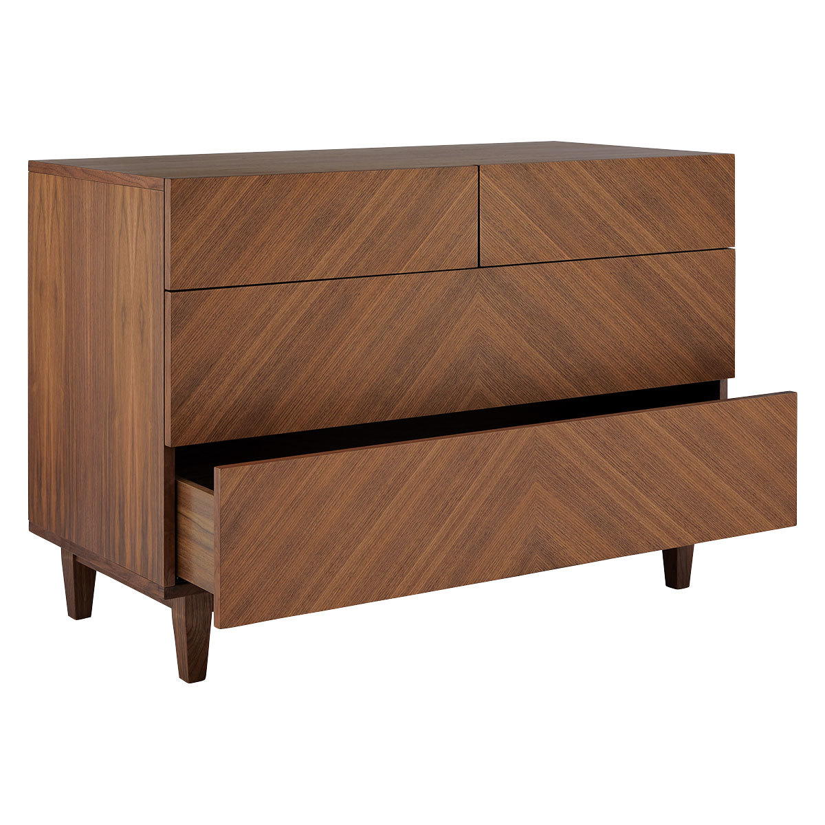 The Verona walnut wide 4 drawer chest is a luxurious piece with a statement herringbone pattern in figured walnut veneer. With a contemporary shape and deep, push-close drawers, the sleek design brings the wood's appealing warm hues up to date. The chest is part of the Verona bedroom furniture range.