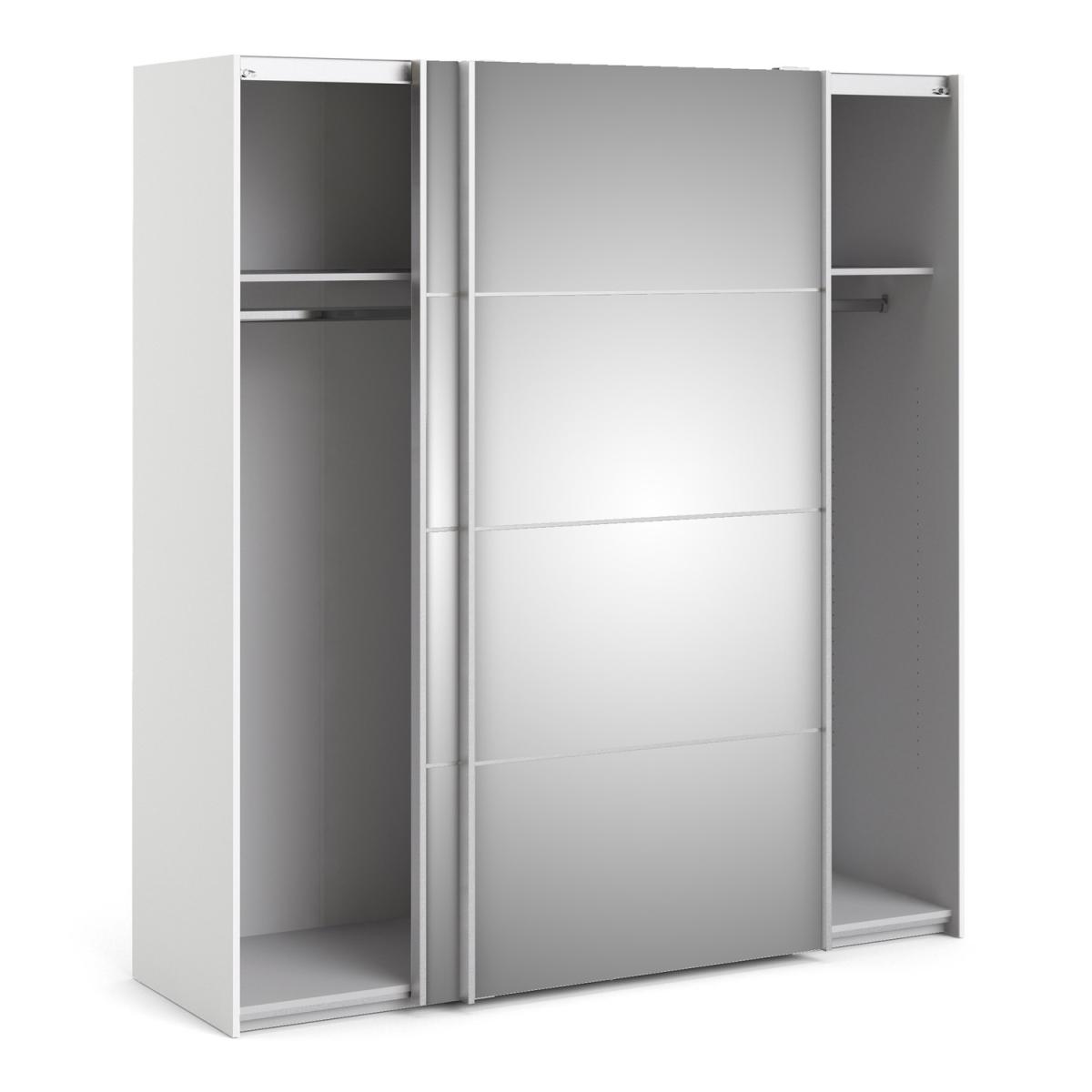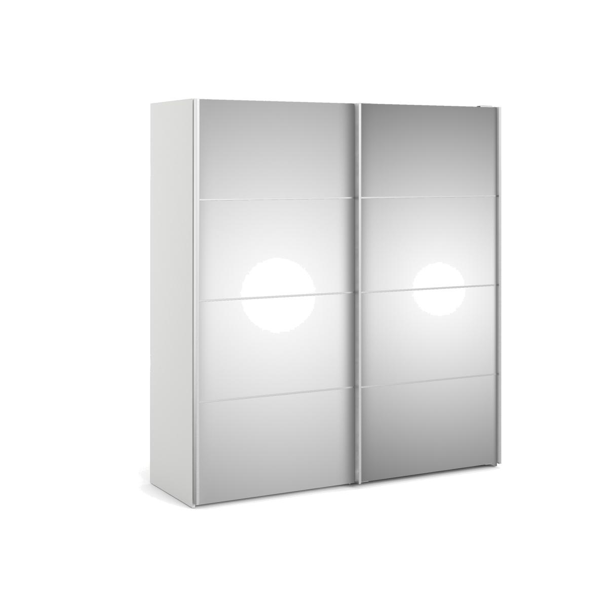 Features we love 2 door sliding wardrobe with 2 shelves and; 2 hanging rails. Full mirrored panel detailing with a bright white finish. Space-saving sliding doors with smooth effortless opening Laminate board resistant to damage moisture and; high temp. Made from PEFC Certified sustainable wood All about me. Create an ultra-modern look in your bedroom with this sleek minimalist style wardrobe. It comes with two adjustable shelves and two hanging rails which can be positioned where you want giving you all the storage space you need. With double mirrored sliding doors not only does its reflection give you the illusion of an extended room your space is instantly maximised. What’s more this stand-alone piece looks just like a fitted wardrobe. Beautifully made in Denmark. Other styles available in the Verona wardrobe range. Need to know. Overall dimensions. W182.4 x D59 x H200.4 cm Number of shelves. 2 Number of hanging rails. 2 Product weight. 141.4kg Colour. White Finish. Mirrored and laminate board Material. Sustainable wood glass (mirror) and metal (frames / runners) For use. Indoors Includes. Anti-tilt strap for the wall Assembly required. Yes Please note Shelves are not adjustable above the rails (as shown in image)