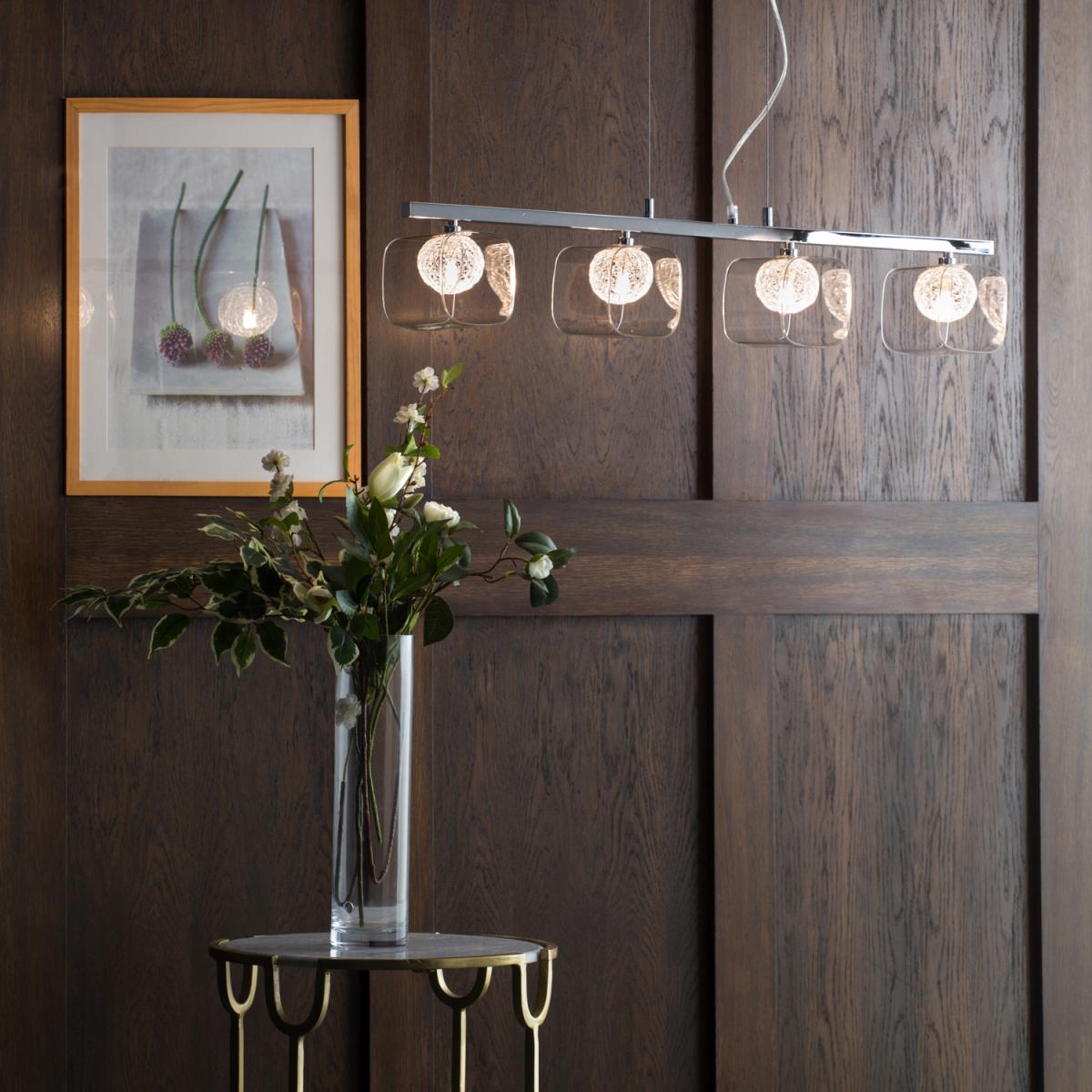 Add a touch of sophistication with the Verona 4 Light Pendant Bar in Chrome. Whether placed over a dining table or kitchen island, this fixture provides ample illumination while enhancing the visual appeal of your space. Exuding modern elegance, this diner pendant bar features glass shades with encase a wire globe design within, casting a gorgeous display of light and shadow outwards.