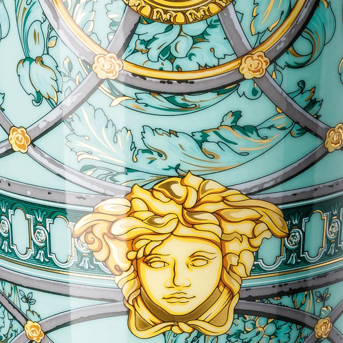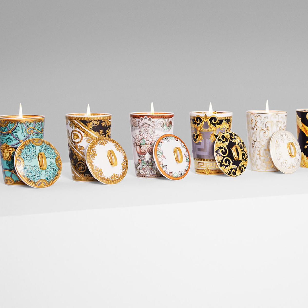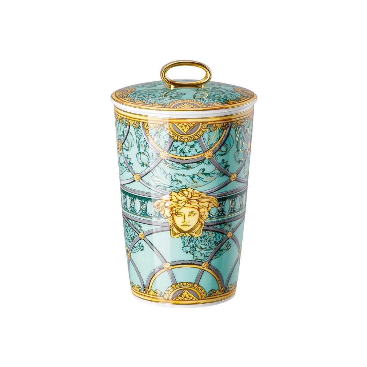 Finish an opulent dinner setting with this table candle from Versace Home. In classic Versace style, their table candle collection is adorned with the brand's most iconic prints including intricate Baroque detailing, Medusa head logos and glints of gold. As decadent as the rest of the top Italian fashion house's homeware collection, these candles are encased in the finest porcelain and topped with a ring holder lid. Emitting a light and fresh fragrance, it is the perfect greeting for guests at your next dinner party. Key features: * Scented candle * Fragrance notes: light & fresh * Dimensions: H14xØ8.5cm * Burn time: 60 hours * Porcelain holder * With the classic Scala de Palazzo * In gold and green * With ornate Italian architectural elements * Topped with a ring handle lid * Cotton wick