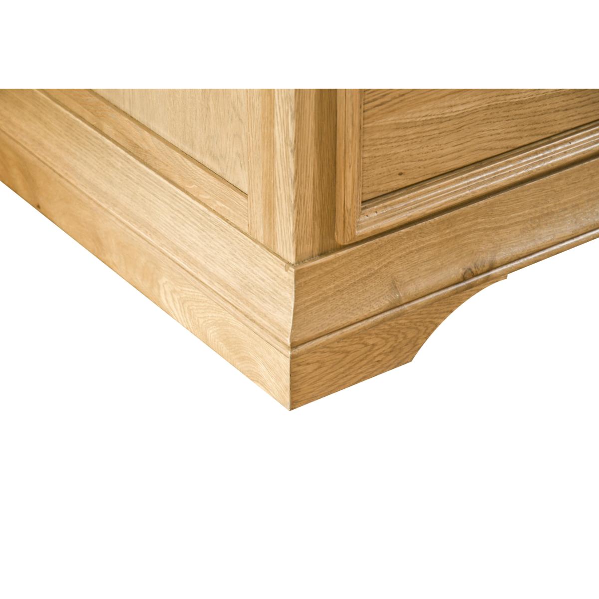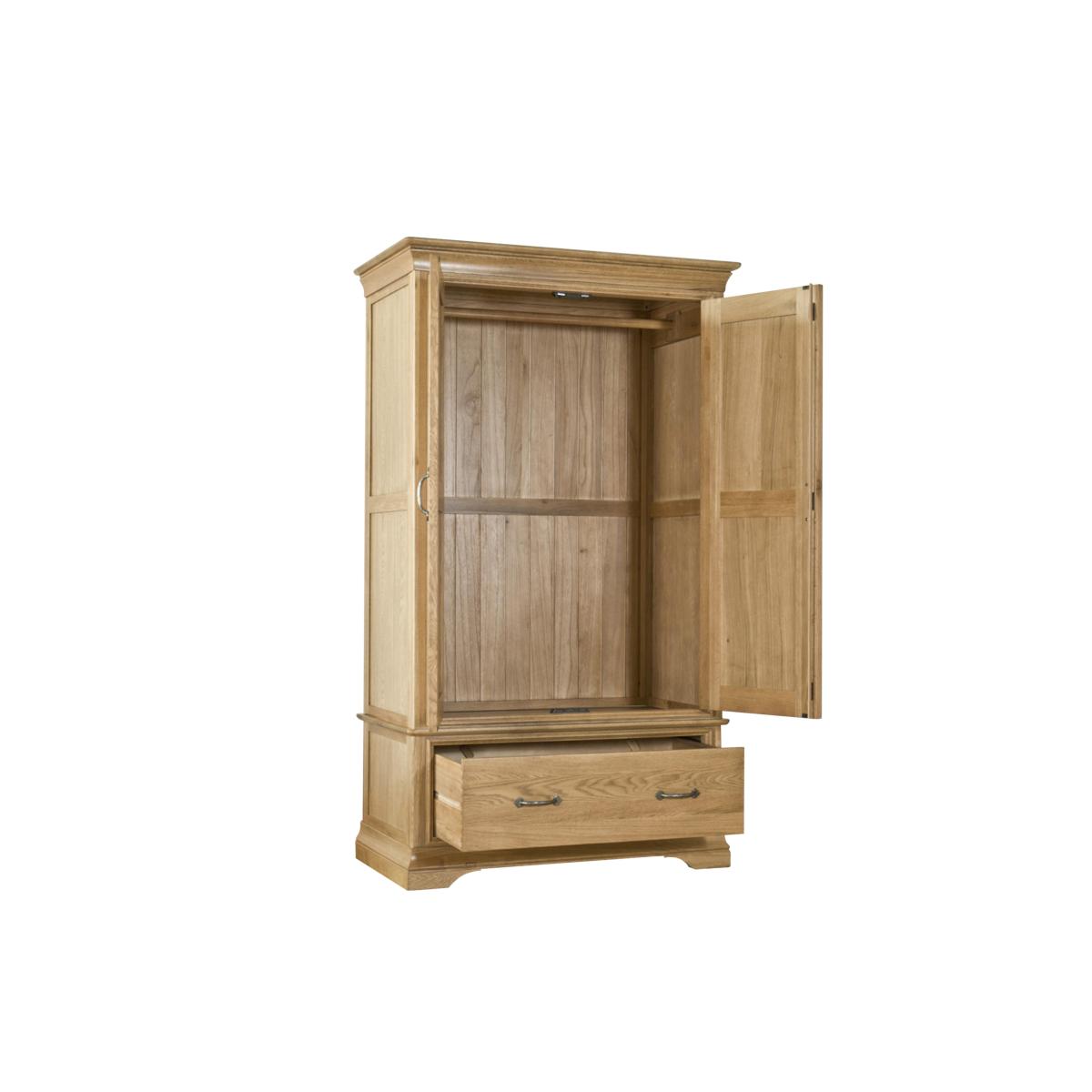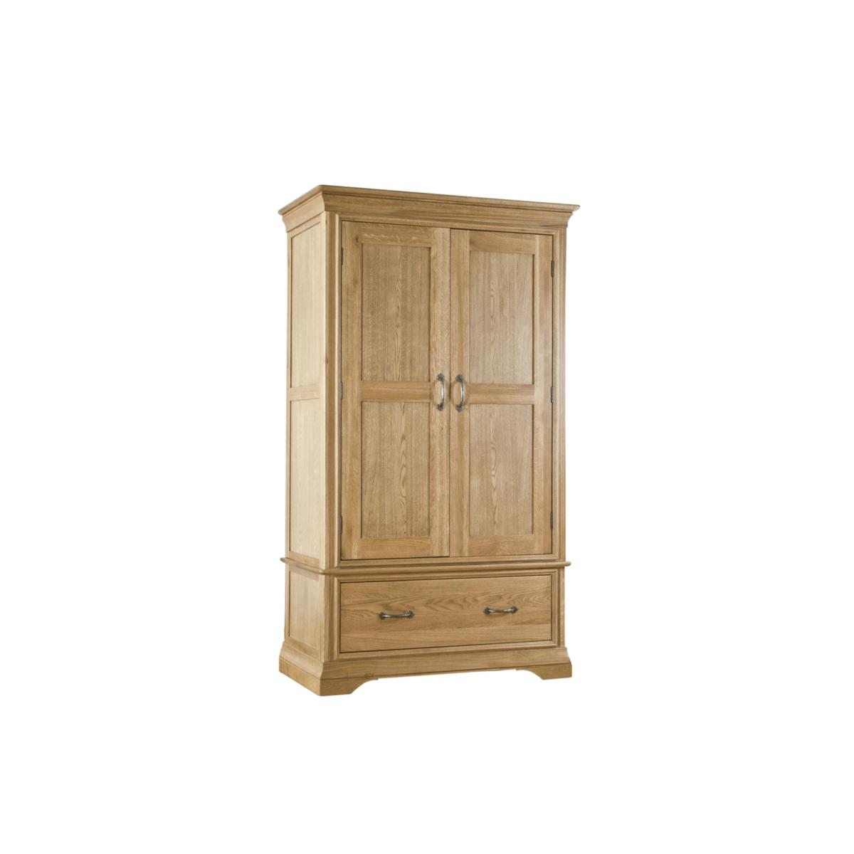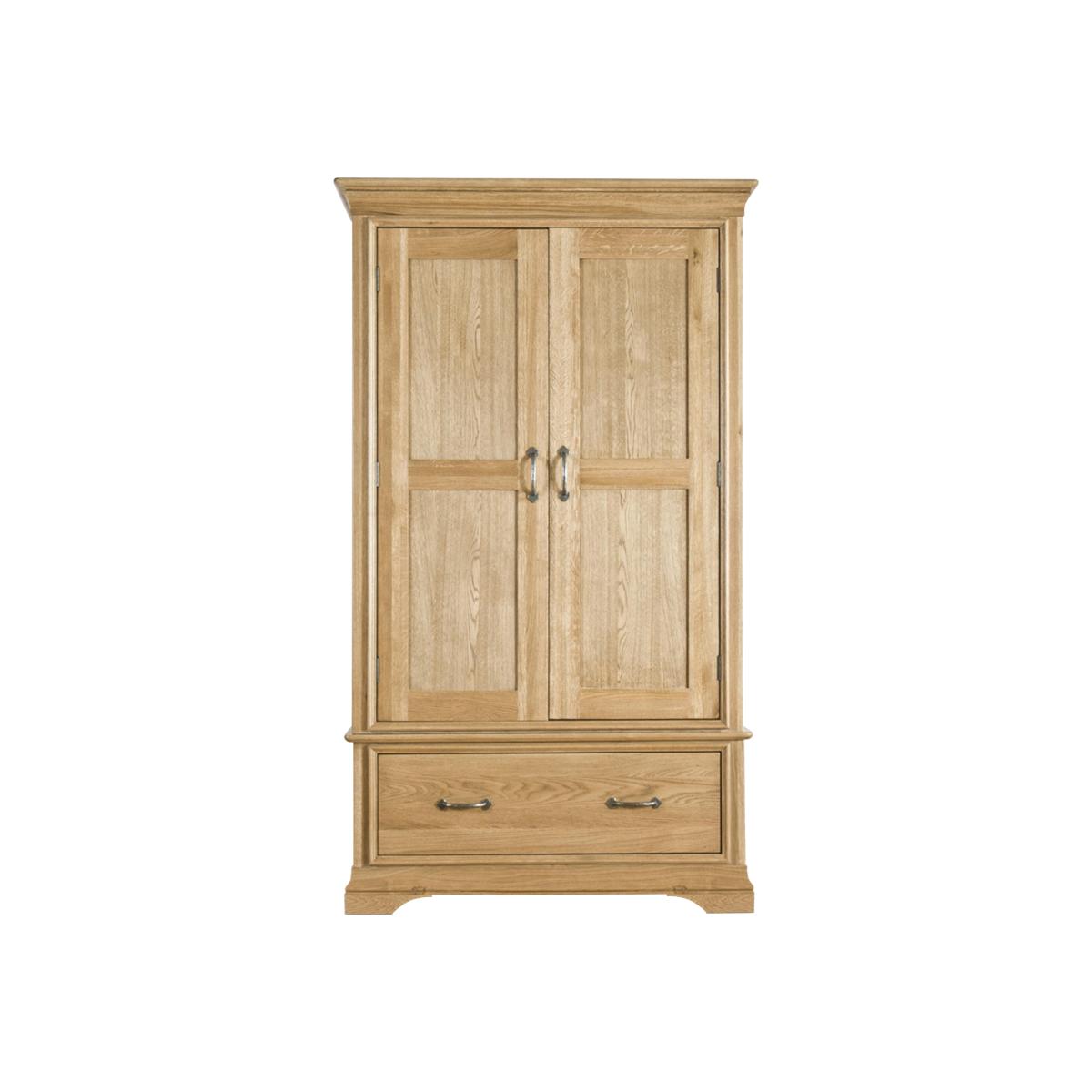 Your elegant bedroom awaits. Inspired by classic French furniture and beautifully handcrafted in oak, our Versailles collection offers heirloom-quality pieces for bedrooms large and small. Start with the curvaceous sleigh bed frame – available in three sizes – and then choose from an extensive selection of wardrobes, chests of drawers, bedside tables and more, all of which feature the range’s signature panelling and smooth woodgrain-enhancing lacquered finish. Made by furniture experts using traditional cabinetry techniques like dovetail drawer joints and tongue and groove interiors, the Versailles range exhibits beautiful oak furniture details inside and out. Based on the traditional gentleman's wardrobe, this practical 2-door 1-drawer wardrobe is handcrafted in oak and impresses with its French furniture-inspired details. Why you'll love it. Heirloom-quality 2-door 1-drawer wardrobe handcrafted in oak. Inspired by classic French bedroom furniture. Elegant cornice top. Antiqued metal handles. Built to last using traditional cabinetry techniques. Drawer has dovetail joints. Tongue and groove back panel and drawer base. Smooth lacquered finish enhances the wood’s natural beauty. This 2-door 1-drawer wardrobe is part of the Versailles bedroom collection. What you need to know. Solid oak frame with oak veneer inlay panels. 1 compartment with a full-width hanging rail. 1 drawer. As oak is a natural material, knots and markings are to be expected. Avoid placing in direct sunlight, and take care to use coasters and placemats. The extensive Versailles range includes several styles of wardrobe. WARNING!. Furniture can tip over unexpectedly and cause injury. This item must be fixed to a wall using the anti-tip kit provided. Be sure to use the correct wall fixings suitable for the walls in your home. Furniture Village is not able to fix anti-tip devices for you. Seek professional advice if you are unsure.