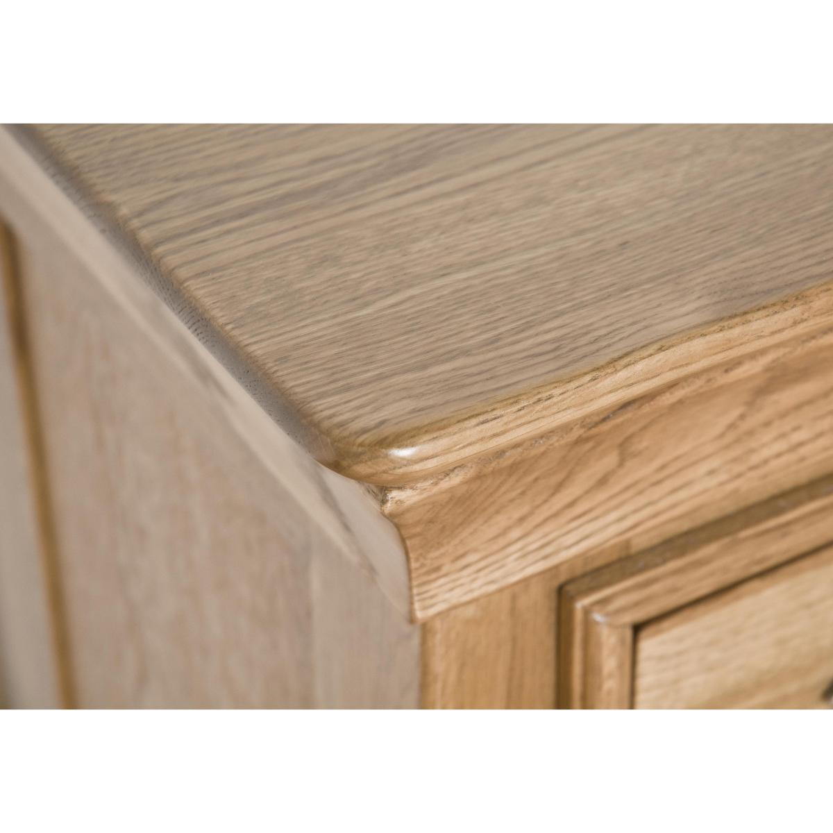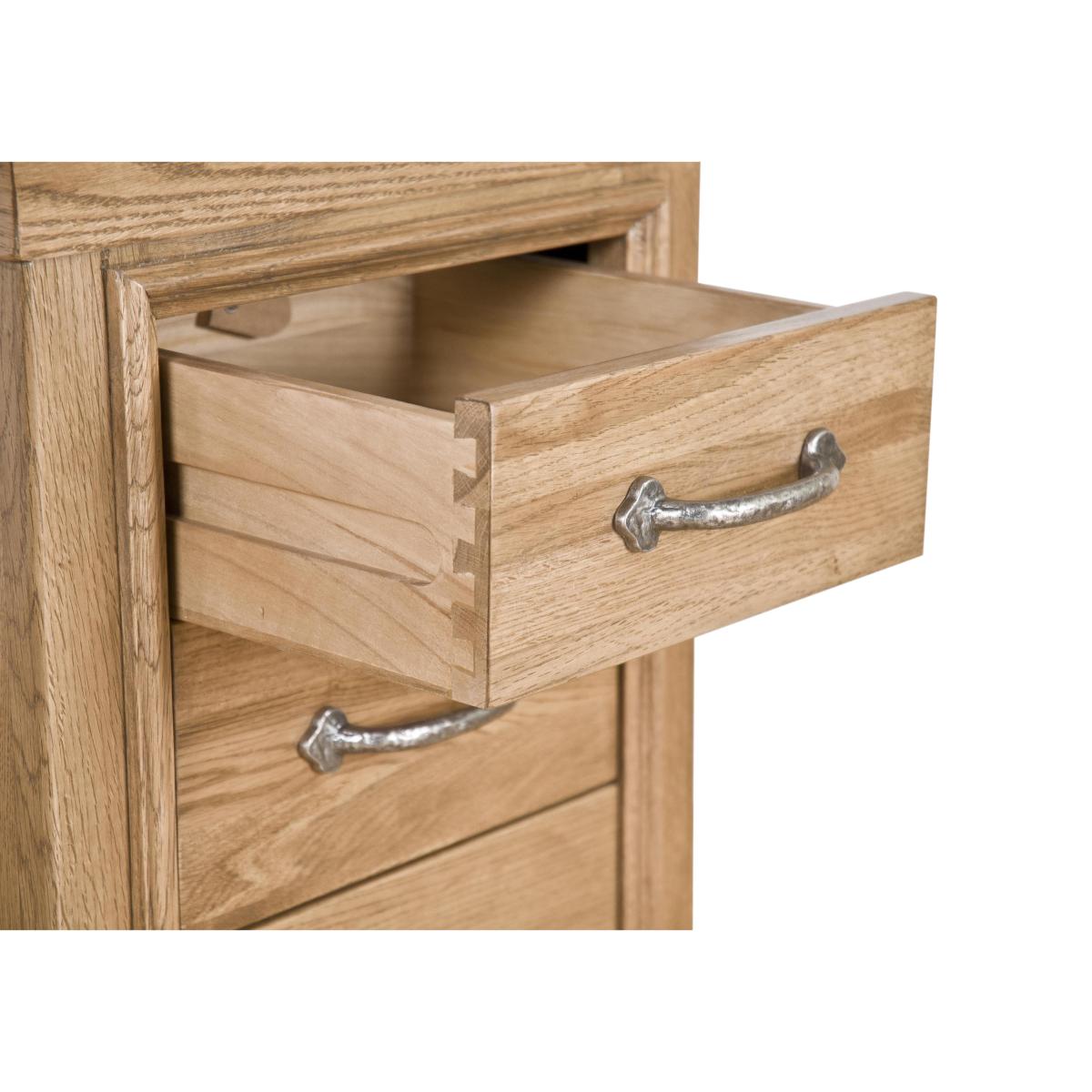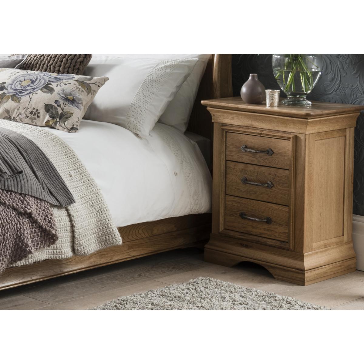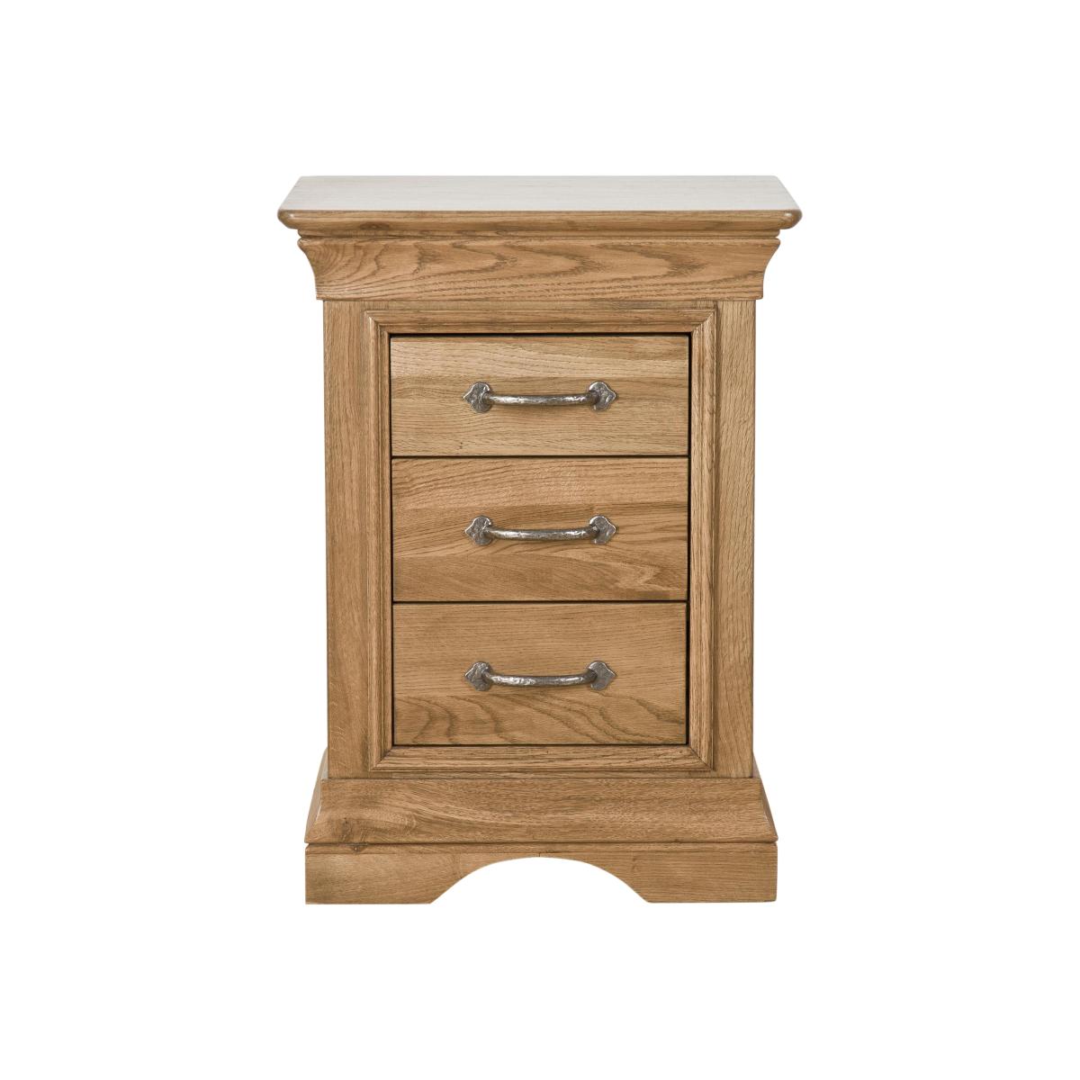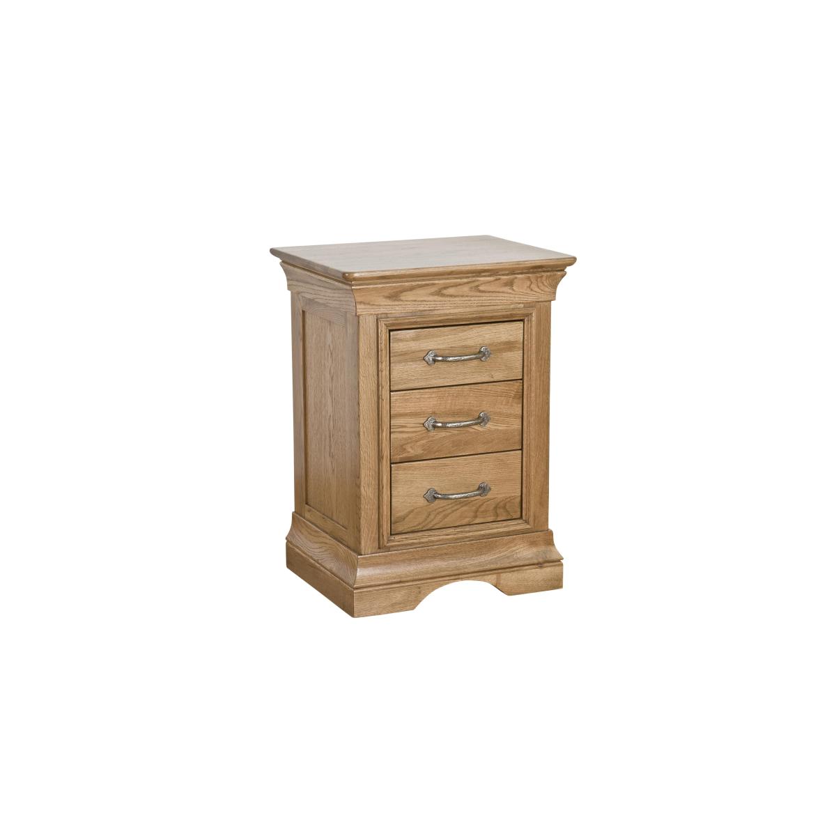 Your elegant bedroom awaits. Inspired by classic French furniture and beautifully handcrafted in oak, our Versailles collection offers heirloom-quality pieces for bedrooms large and small. Start with the curvaceous sleigh bed frame – available in three sizes – and then choose from an extensive selection of wardrobes, chests of drawers, bedside tables and more, all of which feature the range’s signature panelling and smooth woodgrain-enhancing lacquered finish. Made by furniture experts using traditional cabinetry techniques like dovetail drawer joints and tongue and groove interiors, the Versailles range exhibits beautiful oak furniture details inside and out. This beautifully handcrafted oak 3-drawer bedside table can also serve as an extra chest of drawers. It’s eminently practical and, with its French furniture-inspired details, very stylish. Why you'll love it. Heirloom-quality 3-drawer bedside table handcrafted in oak. Inspired by classic French bedroom furniture. Elegant cornice top. Antiqued metal drawer handles. Built to last using traditional cabinetry techniques. Drawers have dovetail joints and tongue and groove bases. Smooth lacquered finish enhances the wood’s natural beauty. This 3-drawer bedside table is part of the Versailles bedroom collection. What you need to know. Solid oak frame with oak veneer inlay panels. 3 drawers. As oak is a natural material, knots and markings are to be expected. Avoid placing in direct sunlight, and take care to use coasters and placemats. The extensive Versailles range also includes a 2-drawer bedside table. WARNING!. Furniture can tip over unexpectedly and cause injury. This item must be fixed to a wall using the anti-tip kit provided. Be sure to use the correct wall fixings suitable for the walls in your home. Furniture Village is not able to fix anti-tip devices for you. Seek professional advice if you are unsure.