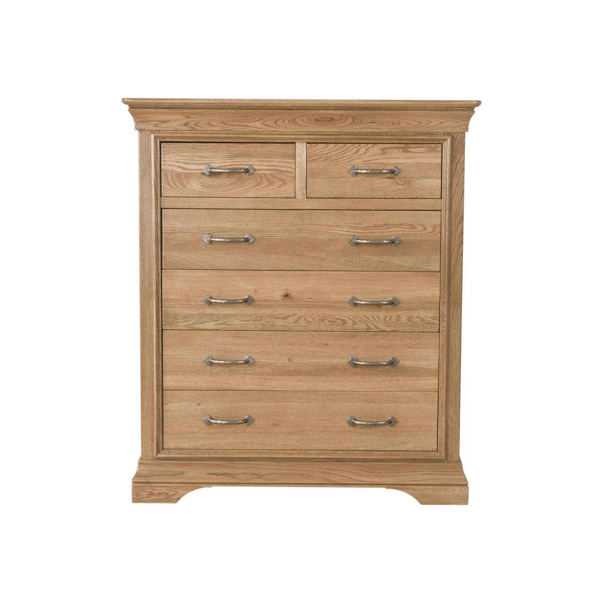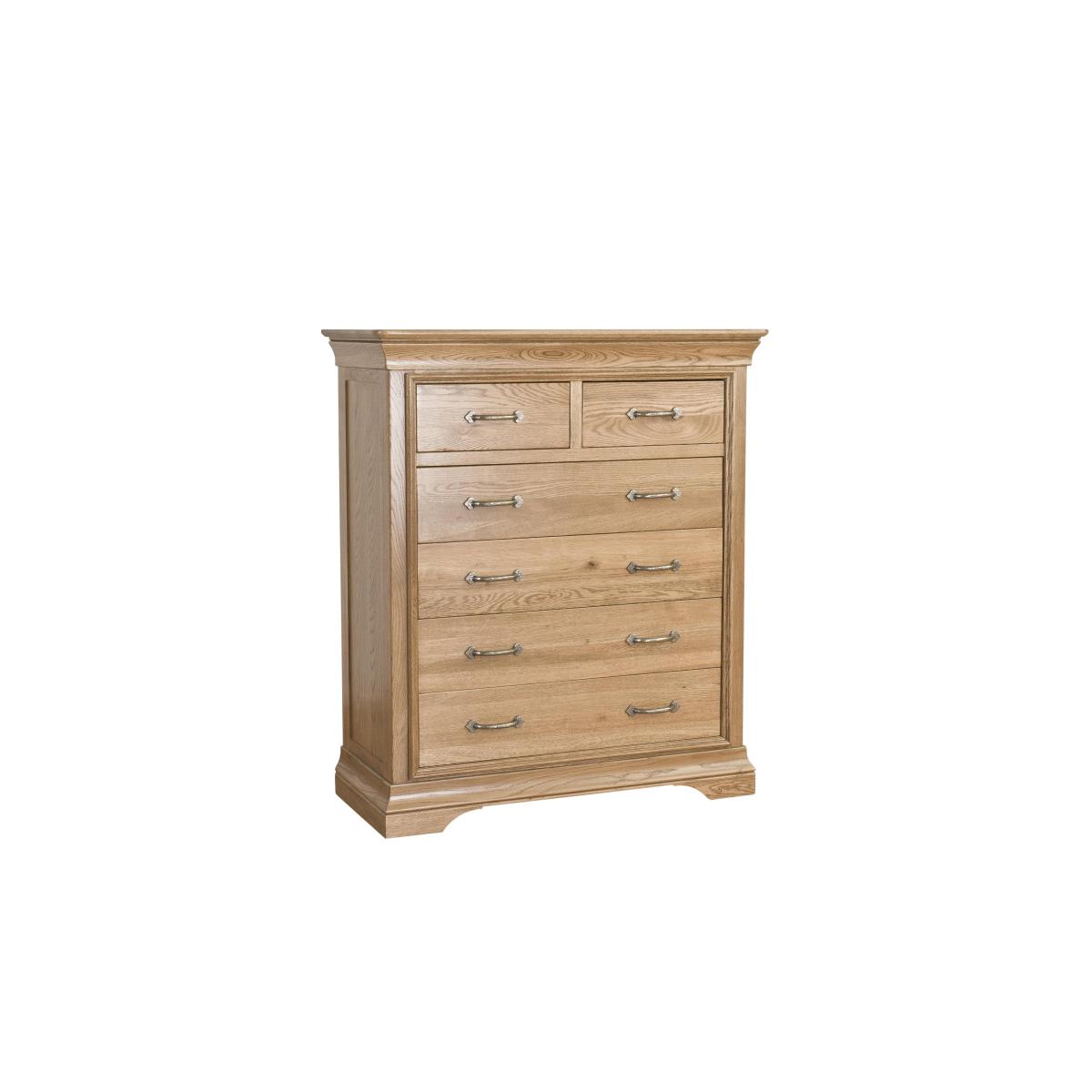 Your elegant bedroom awaits. Inspired by classic French furniture and beautifully handcrafted in oak, our Versailles collection offers heirloom-quality pieces for bedrooms large and small. Start with the curvaceous sleigh bed frame – available in three sizes – and then choose from an extensive selection of wardrobes, chests of drawers, bedside tables and more, all of which feature the range’s signature panelling and smooth woodgrain-enhancing lacquered finish. Made by furniture experts using traditional cabinetry techniques like dovetail drawer joints and tongue and groove interiors, the Versailles range exhibits beautiful oak furniture details inside and out. Spacious and gracious, this classic French furniture-inspired chest of drawers is beautifully handcrafted and rich with elegant details. In solid oak with oak veneer panels. Why you'll love it. Heirloom-quality 4+2 chest of drawers handcrafted in oak. Inspired by classic French bedroom furniture. Elegant cornice top. Antiqued metal drawer handles. Built to last using traditional cabinetry techniques. Drawers have dovetail joints and tongue and groove bases. Smooth lacquered finish enhances the wood’s natural beauty. This 4+2 chest of drawers is part of the Versailles bedroom collection. What you need to know. Solid oak frame with oak veneer inlay panels. 2 smaller drawers over 4 larger drawers. As oak is a natural material, knots and markings are to be expected. Avoid placing in direct sunlight, and take care to use coasters and placemats. The extensive Versailles range includes several chests of drawers. WARNING!. Furniture can tip over unexpectedly and cause injury. This item must be fixed to a wall using the anti-tip kit provided. Be sure to use the correct wall fixings suitable for the walls in your home. Furniture Village is not able to fix anti-tip devices for you. Seek professional advice if you are unsure.