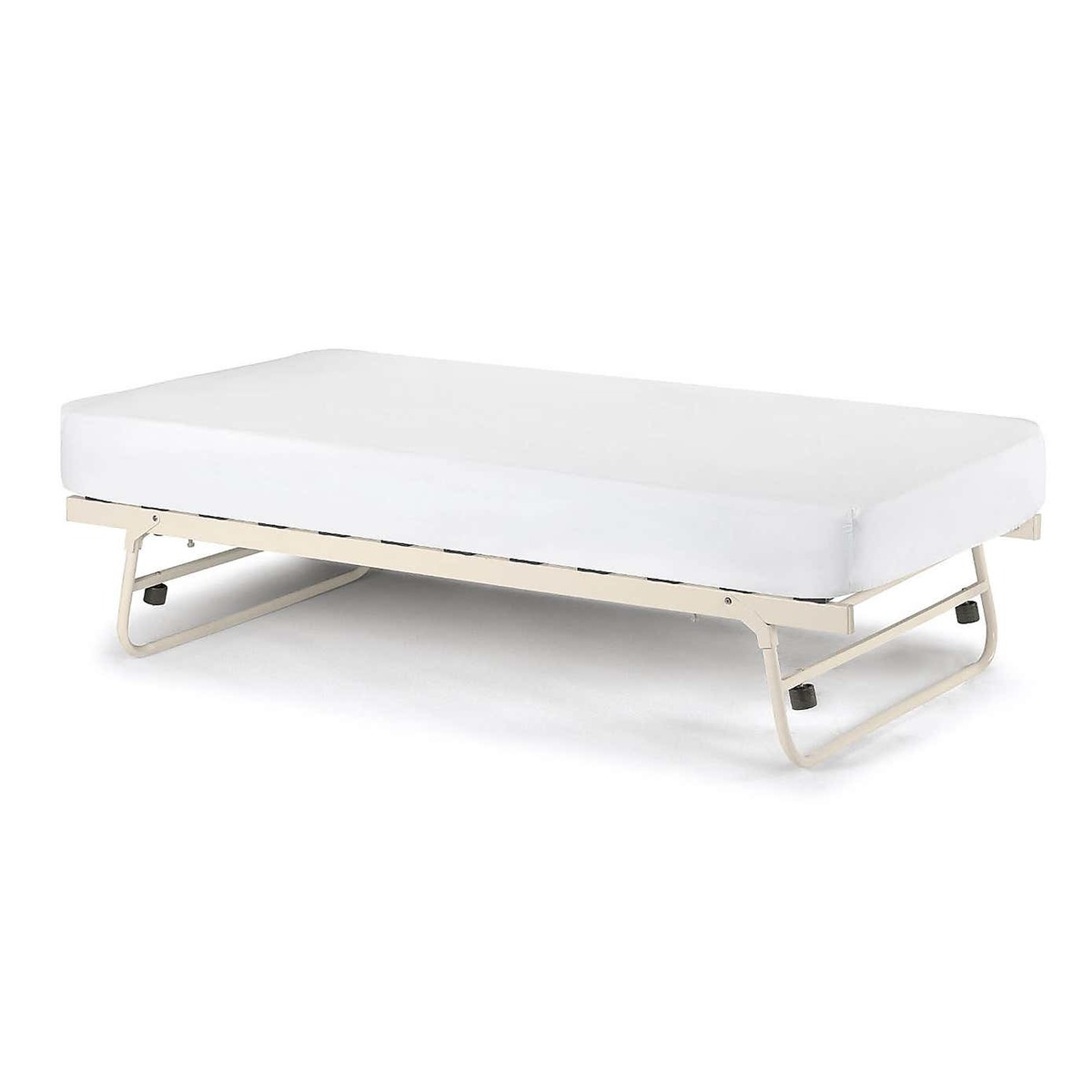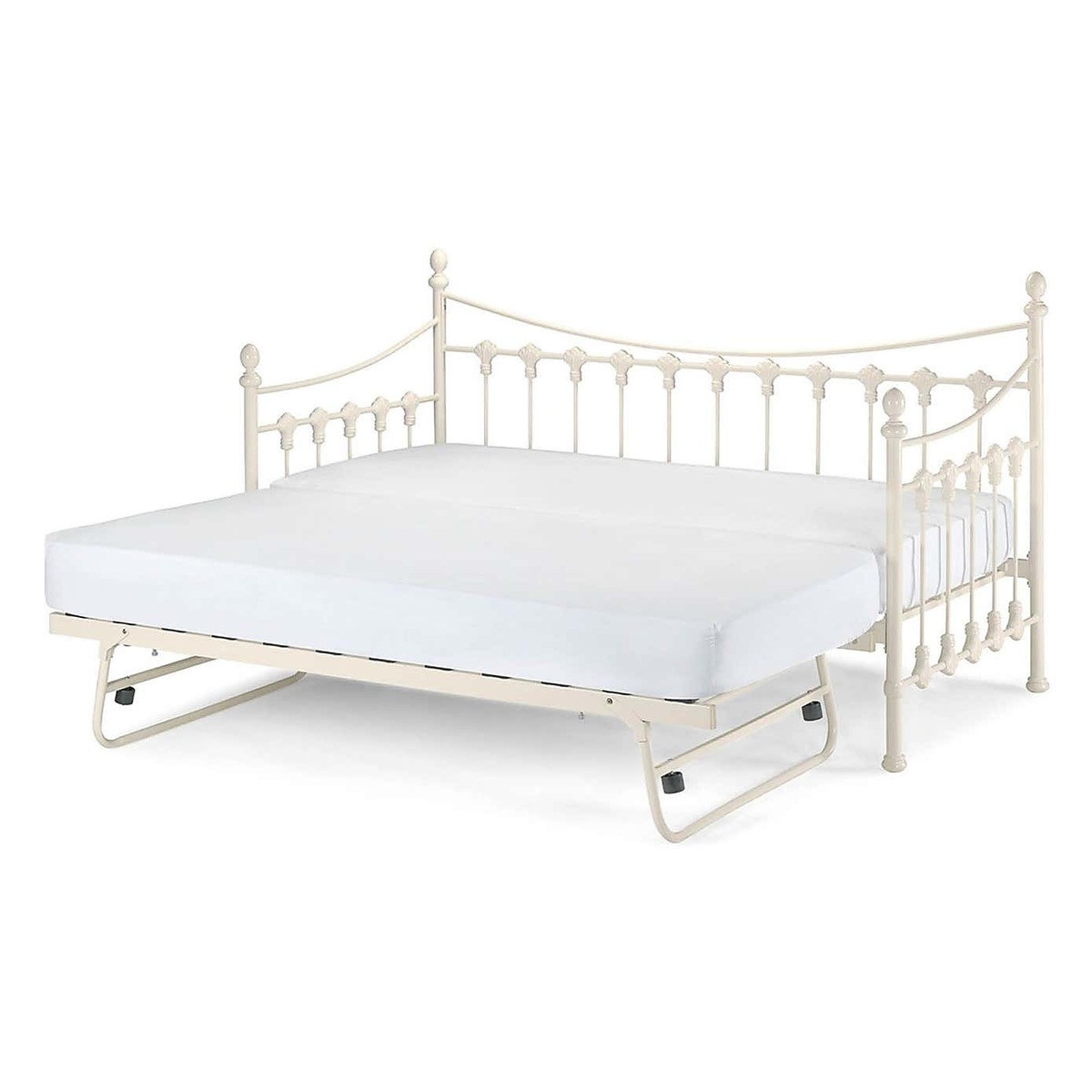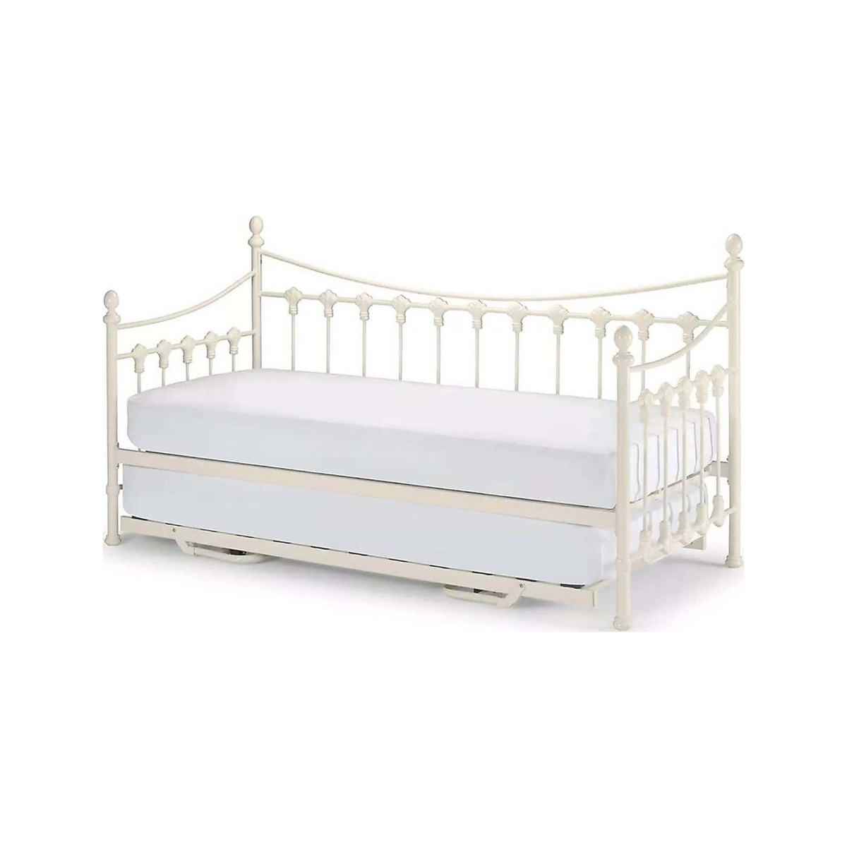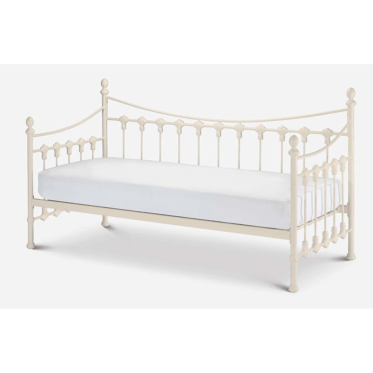 A stunning day bed with a wrought iron design and white finish. This pretty day bed is both good looking and practical. It will enhance any room with its lovely design. This provides a great seating area by day and a spacious sleeping area by night. Please note: underbed and mattresses are not included. Please note, unfortunately we cannot deliver this item to the Channel Islands.