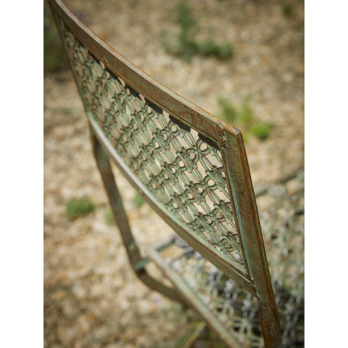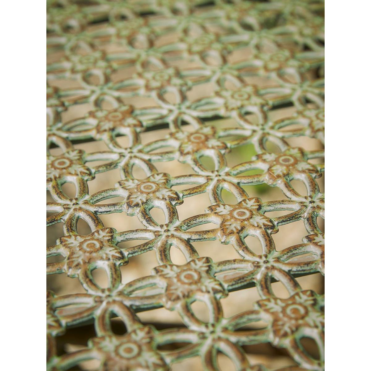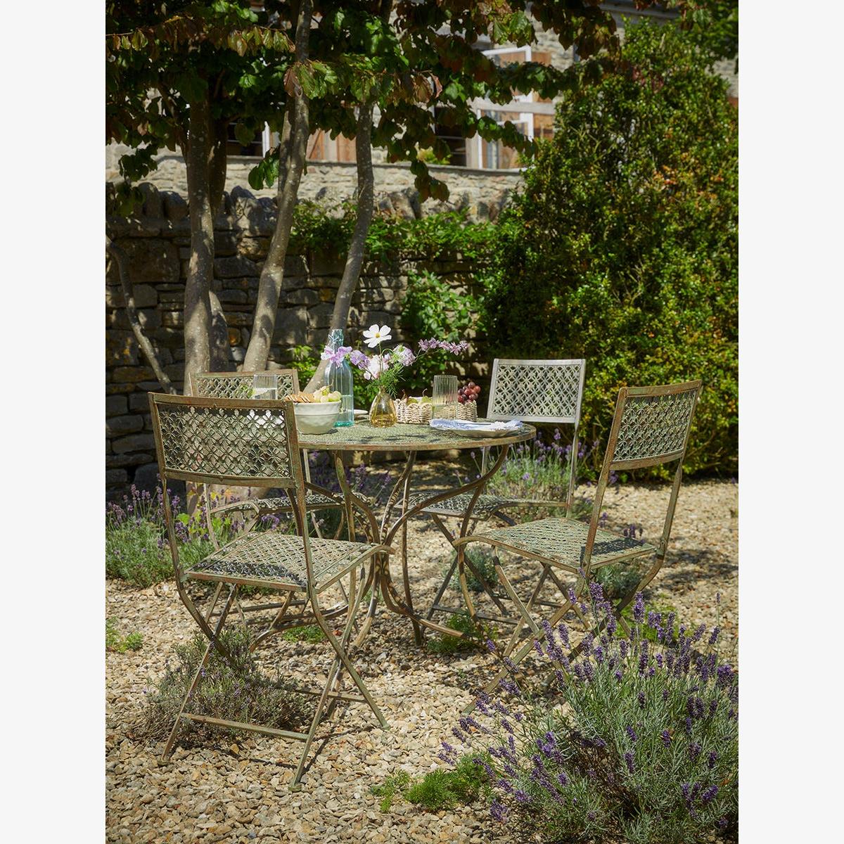 Square framed chairs pair with a round table for a contemporary take on a classic styling in our Versailles Dining Set. A floral lattice design crafted from a rustic and gently aged looking metal gives a vintage elegance. This dining set features four chairs and a table for a quaint and sweet place to entertain family and friends.