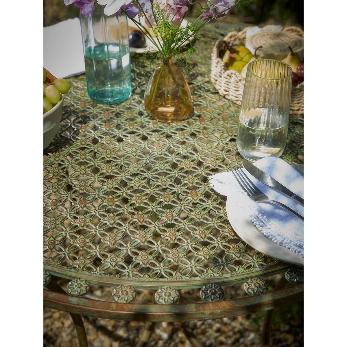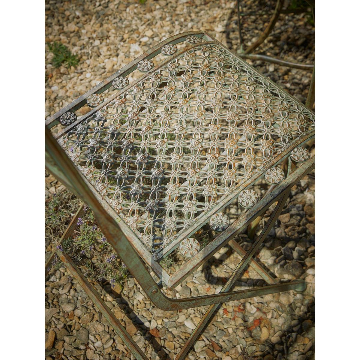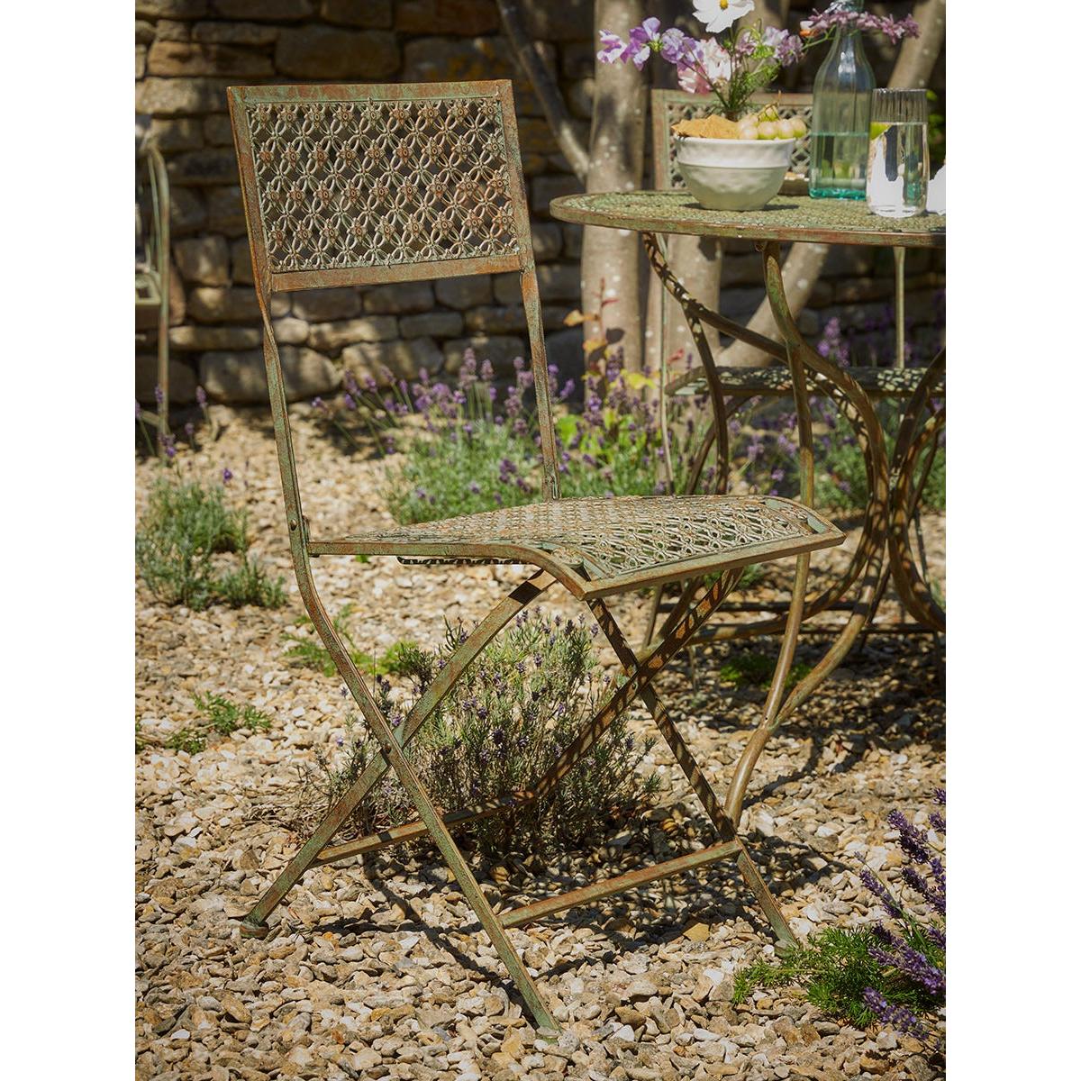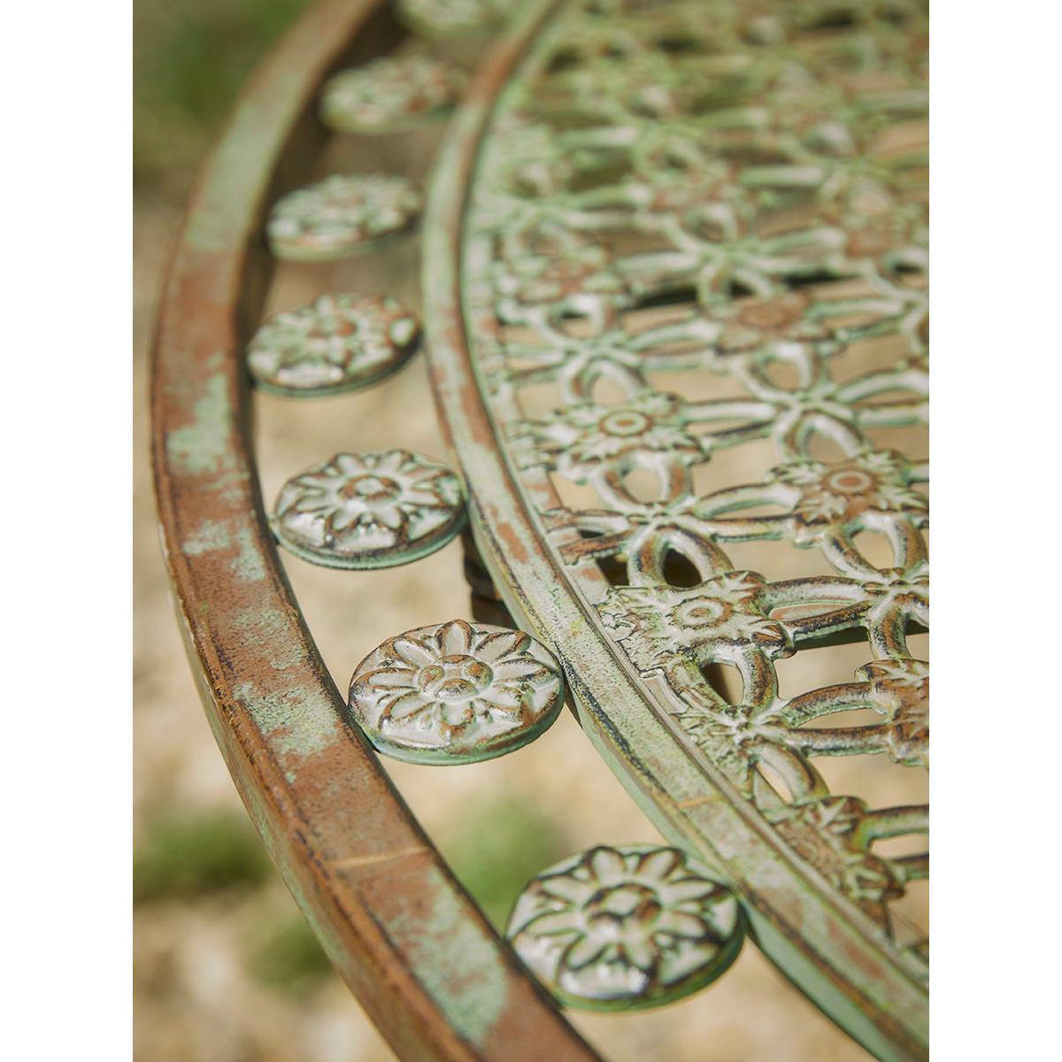 Square framed chairs pair with a round table for a contemporary take on a classic styling in our Versailles Dining Set. A floral lattice design crafted from a rustic and gently aged looking metal gives a vintage elegance. This dining set features four chairs and a table for a quaint and sweet place to entertain family and friends.